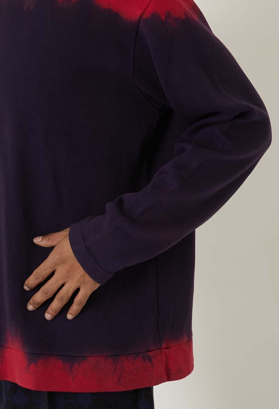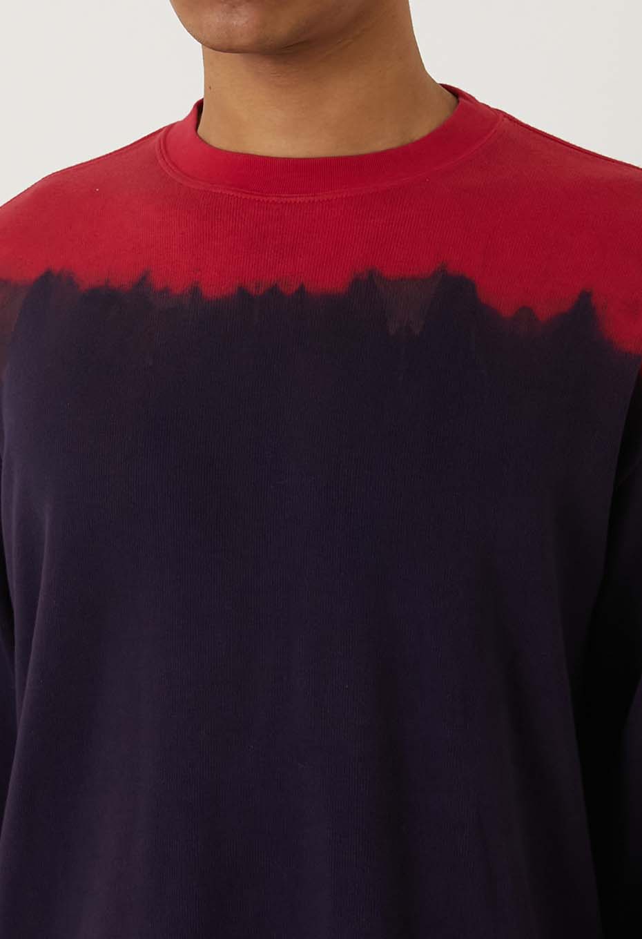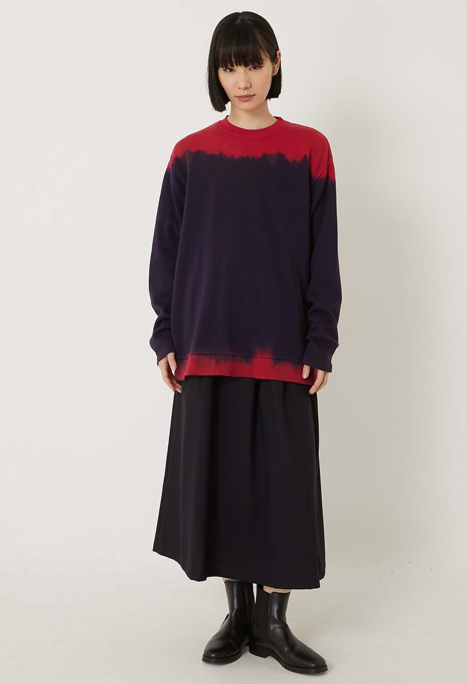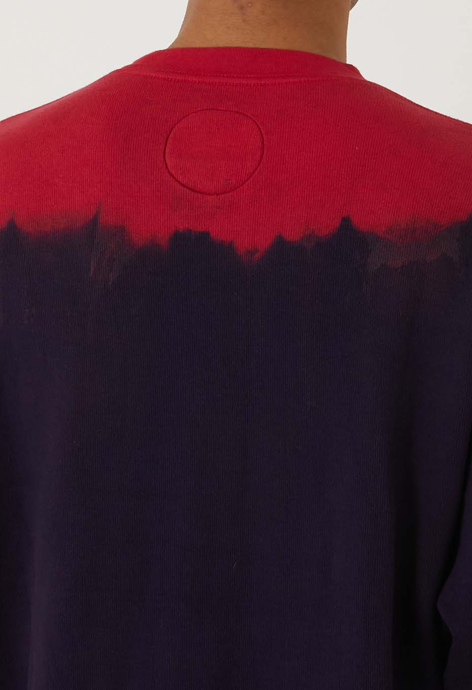 通常のスムースが表1目×裏1目で編まれるのに対し、エイトロックスムースは表2目×裏2目で編む変形スムース組織です。タテ目組織で肌と生地の間に空間ができ、心地よい肌触りとなります。通常のスムースでは出せない伸縮性と柔らかな質感が特徴です。綿モダールの糸を使用することで、よりふんわりとした柔らかい肌触りと優しい着心地を実現しています。職人が一つひとつ丁寧に施した、異なる2色のムラ染めによる絞り配色が印象的です。