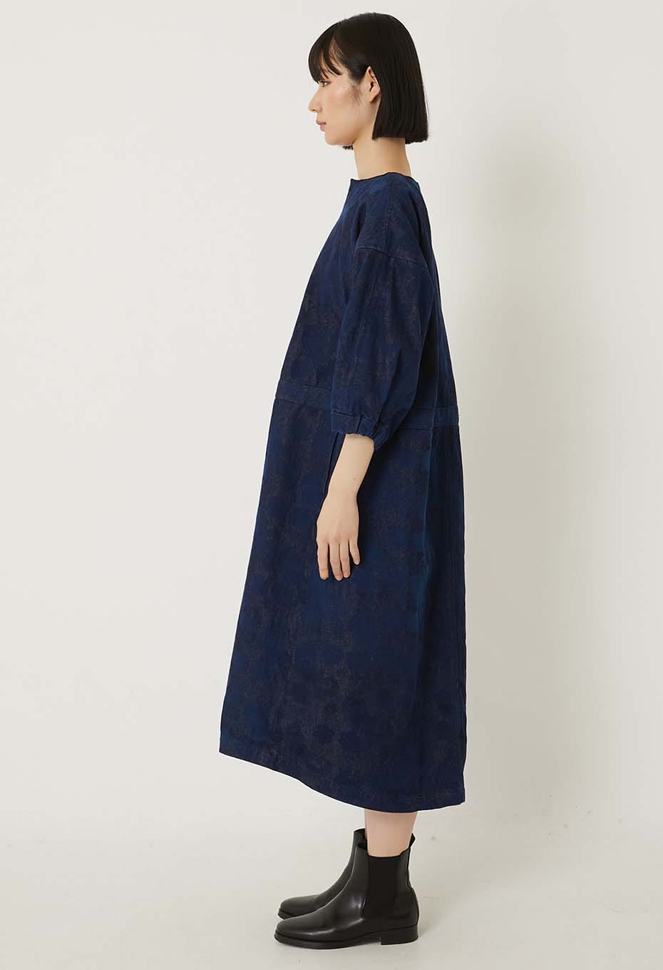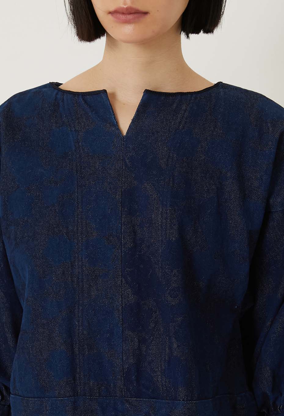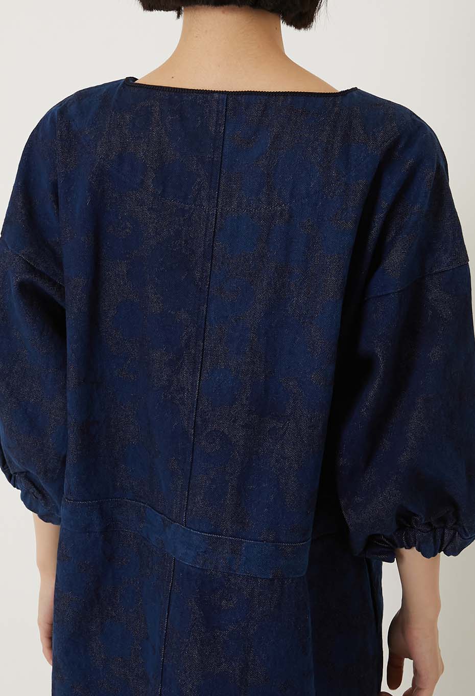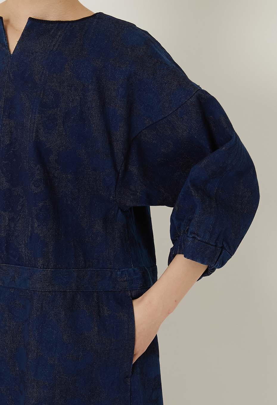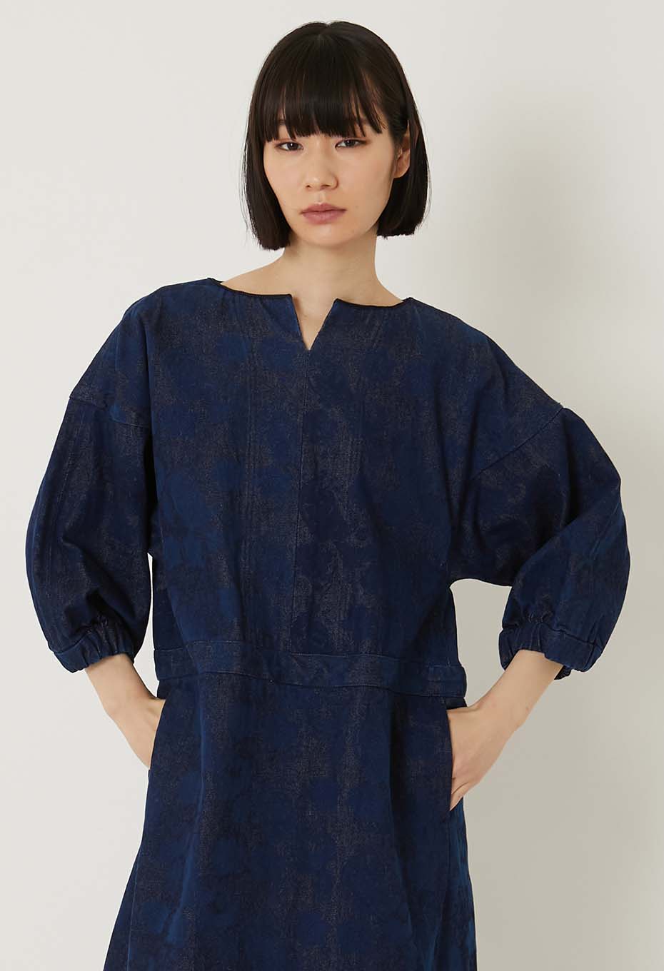 スリットネックにブレードリボンのディテールをあしらいました。素材の表情を活かしたシンプルでボリューミーなシルエットで、身体のラインを拾わないたっぷりとした分量感が特徴です。一枚でもレイヤードスタイルでも、多様なスタイリングに適応するバランスの良い一着となっています。着るほどに変化していくデニムの表情と藍の色をお楽しみください。
