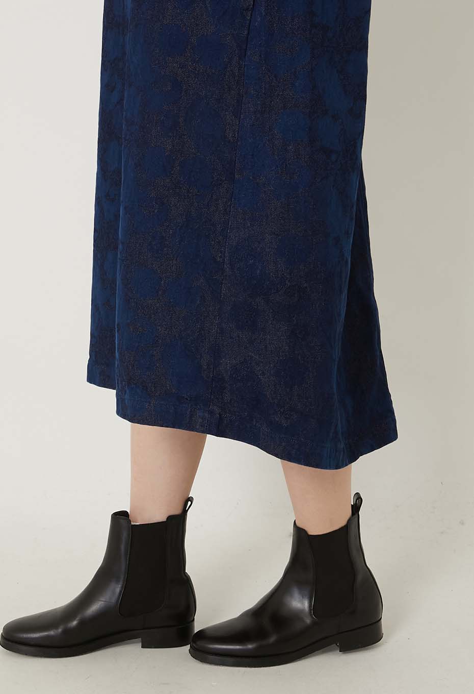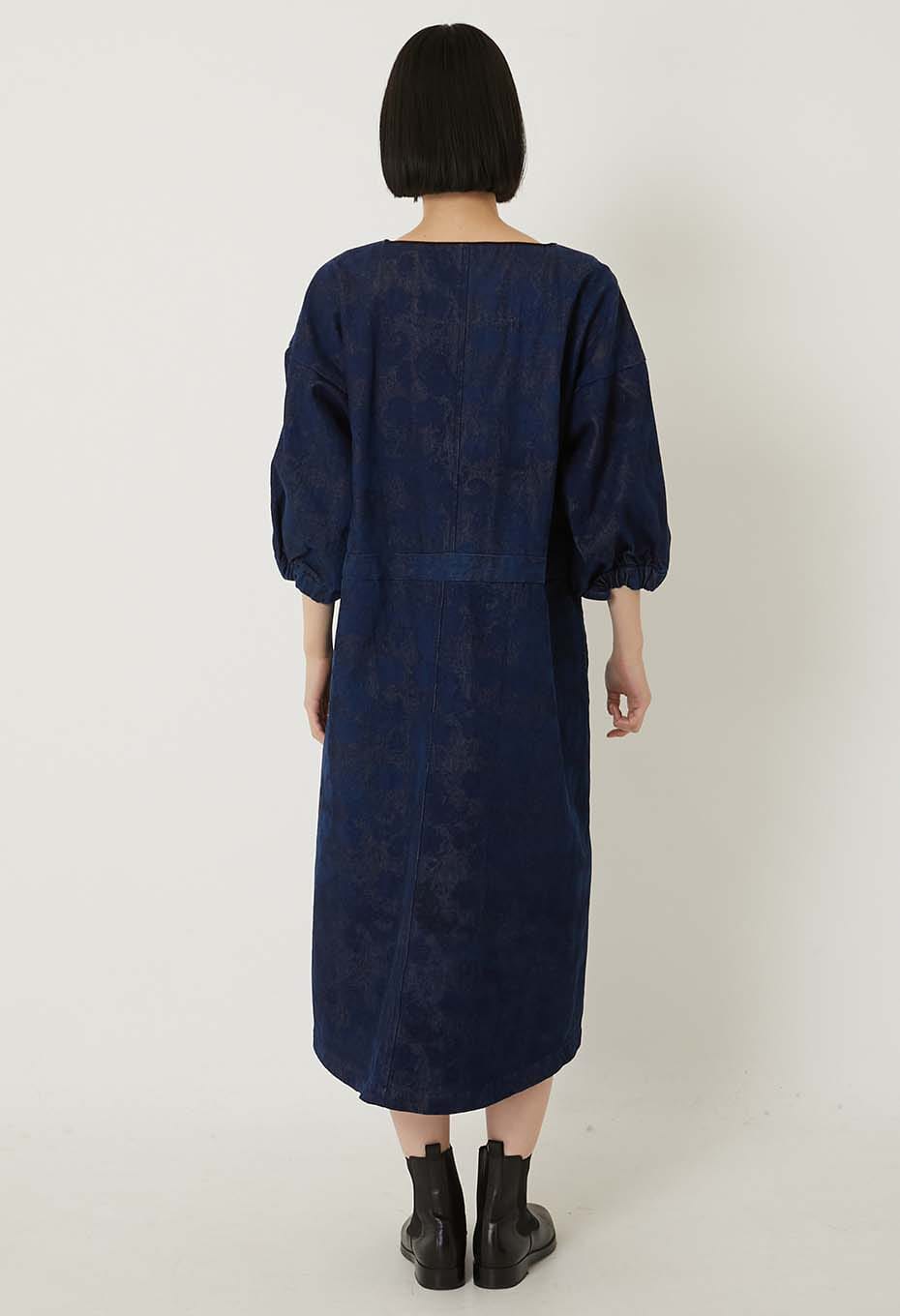 12ozのインディゴデニムをベースに使用しています。オープンエンド紡績糸を用いることで、ざっくりとしたドライな質感に仕上げました。シーズンテーマの「辻が花」を2色の濃淡の本藍で表現し、着抜プリントを施しています。
