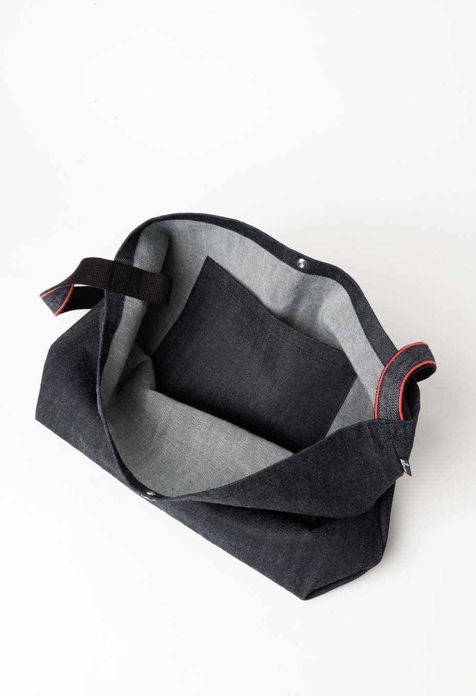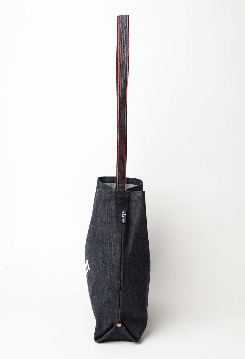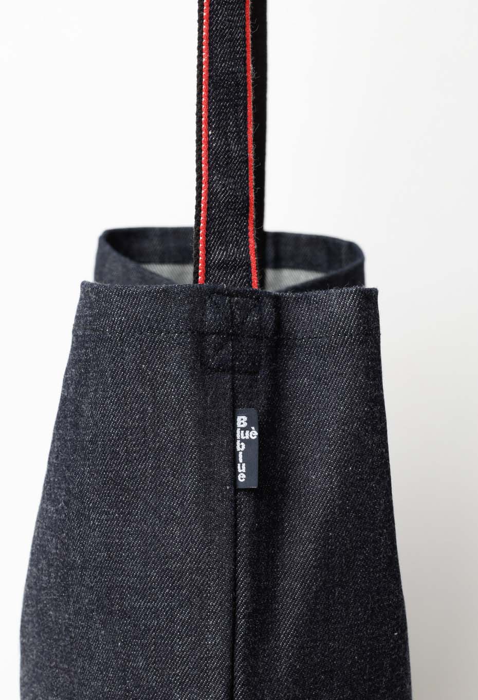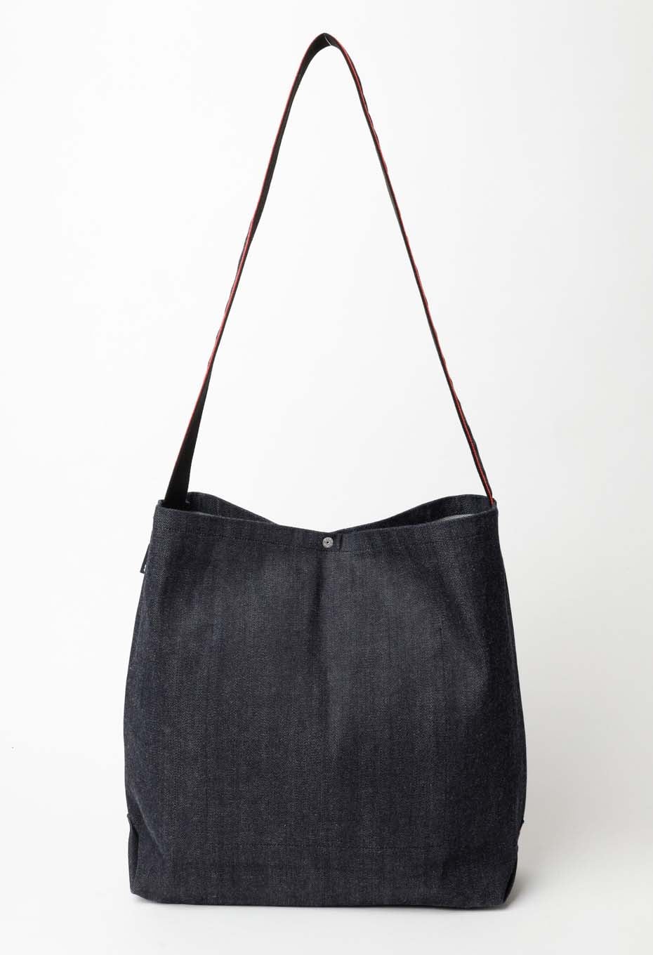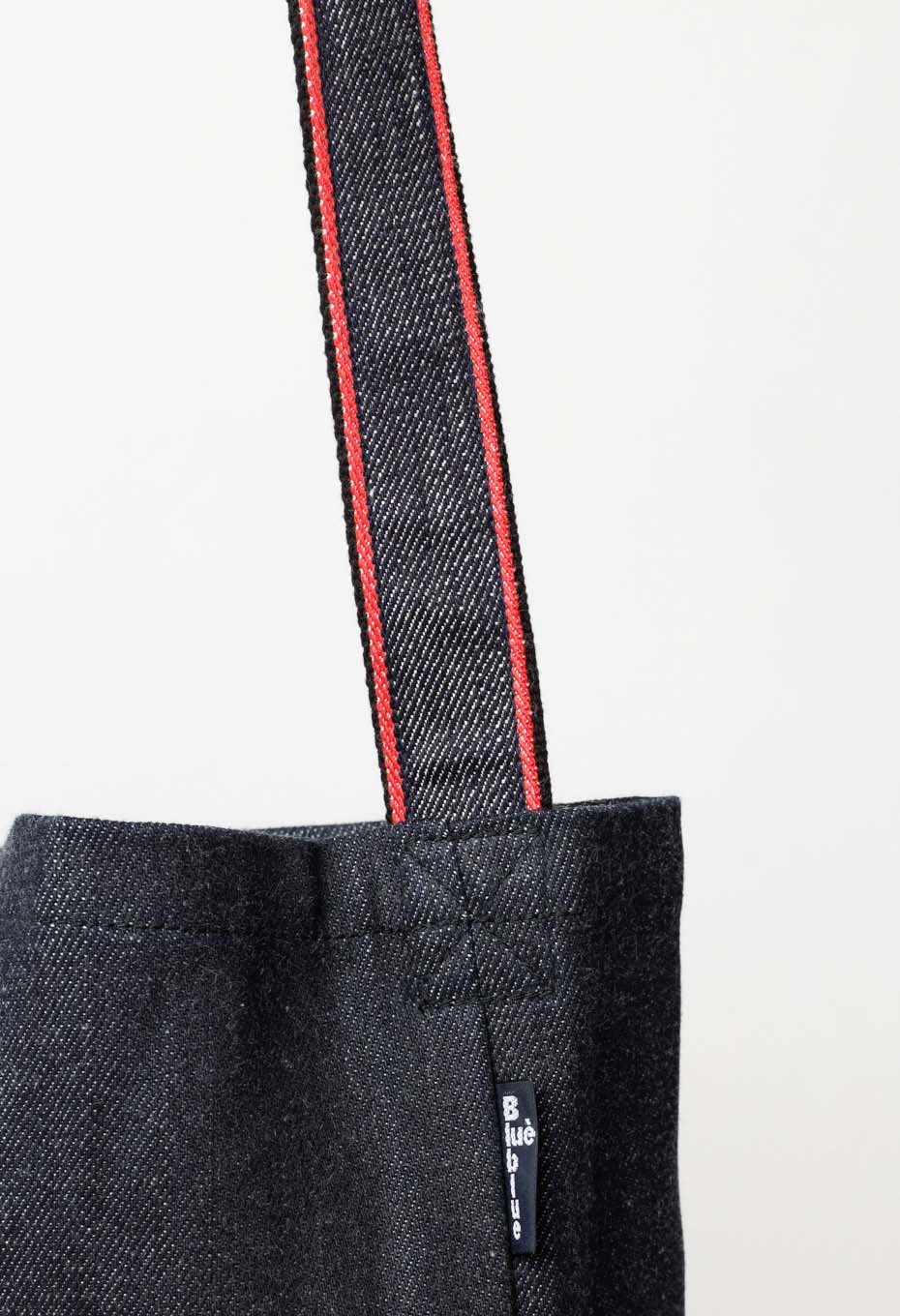 シンプルで使い勝手の良い大容量タイプ。肩掛けストラップ部分のオリジナル赤耳テープが印象的です。リベットやオリジナルドットボタンなど、ジーンズのディテールを取り入れ、BLUE BLUEらしさを演出しました。小物の収納に便利な内ポケット付きです。