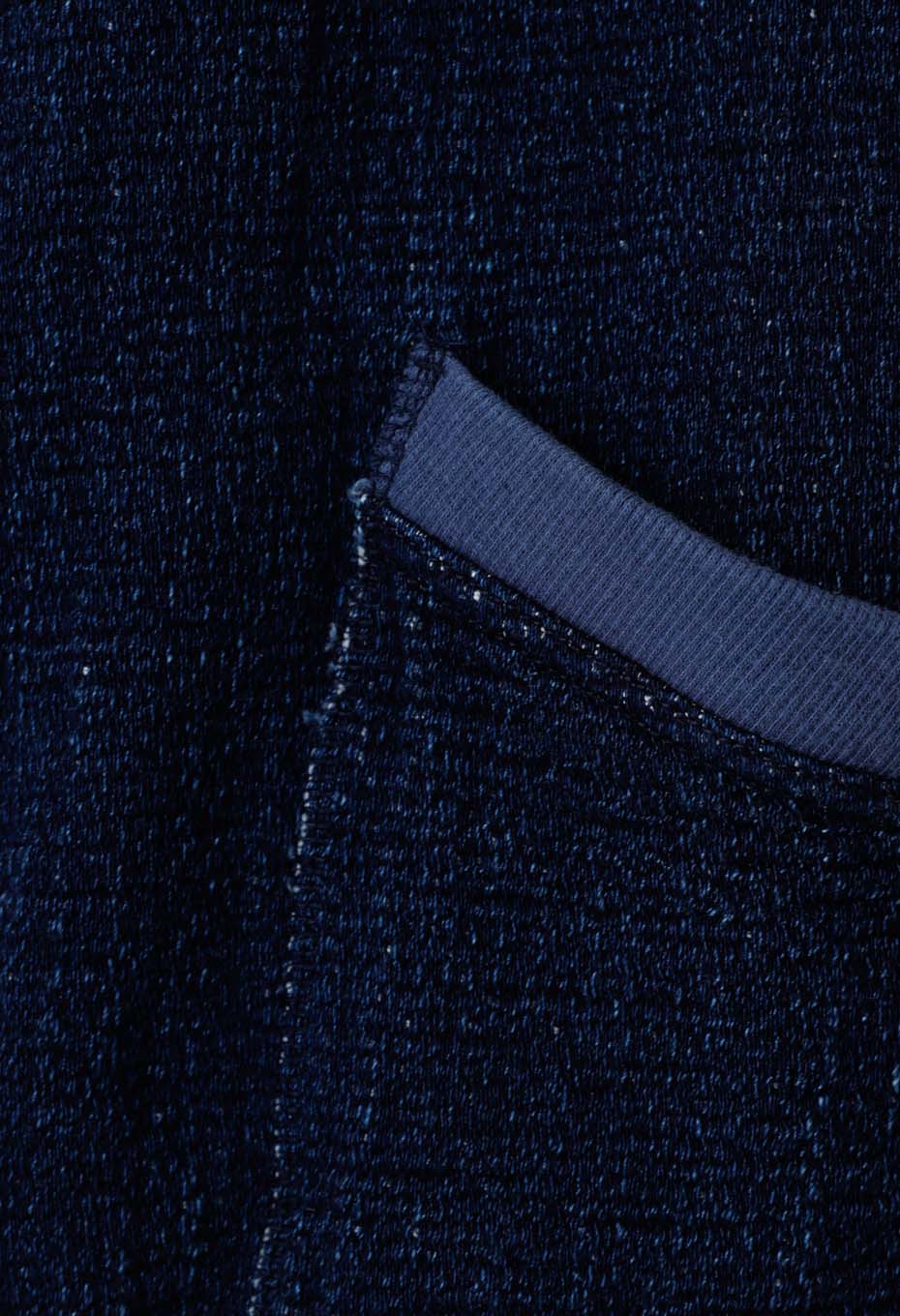 生地の表面に経糸のインディゴ糸を流れるような複雑な線で表現したオリジナルデニムを採用。もっちりと肉厚な素材で、ニットのような柔らかさとナチュラルなストレッチ性を併せ持っています。