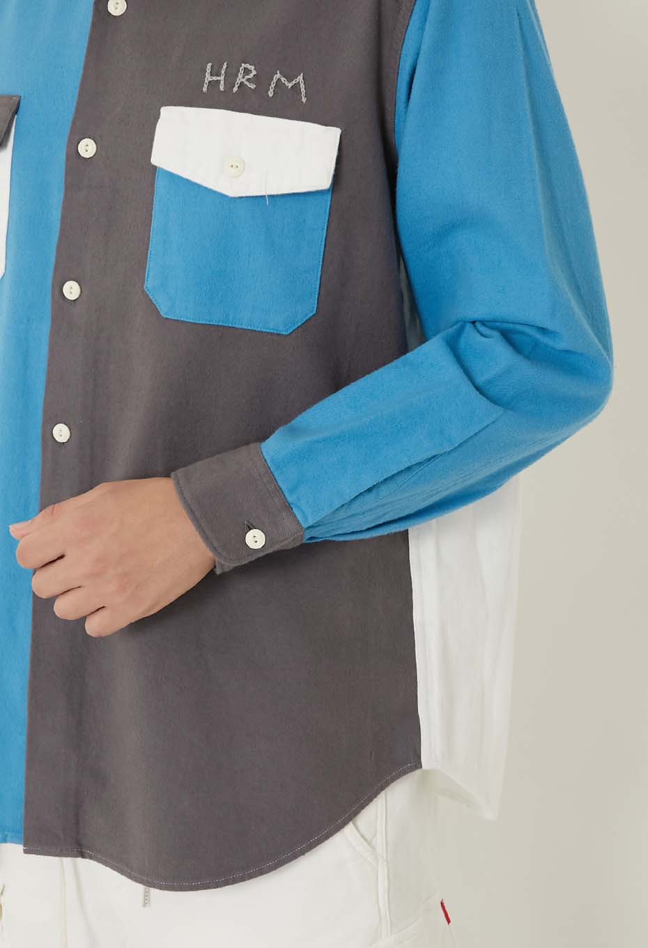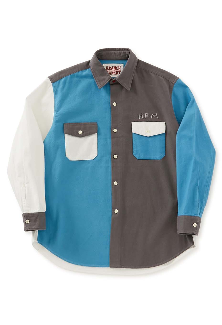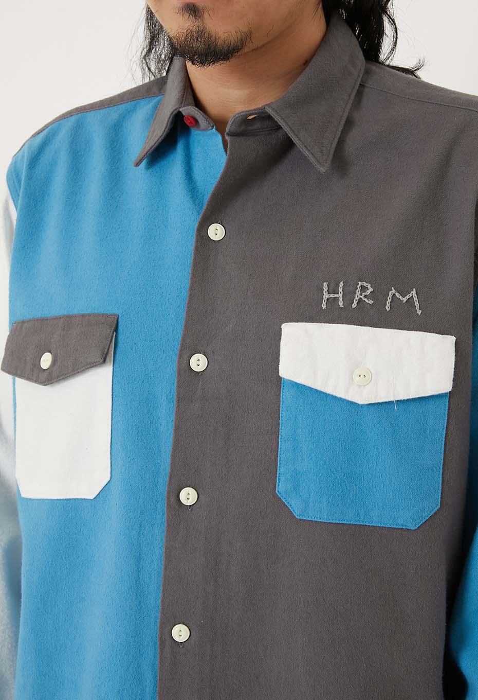 スタンダードフィットの2フラップポケットワークシャツをベースに、控えめなデザインのオリジナルボタンや、手刺しゅうであしらった「HRM」ロゴがさりげないアクセントになっています。