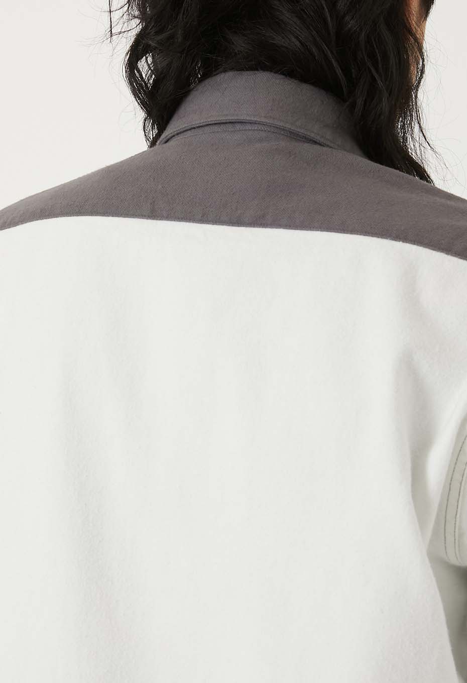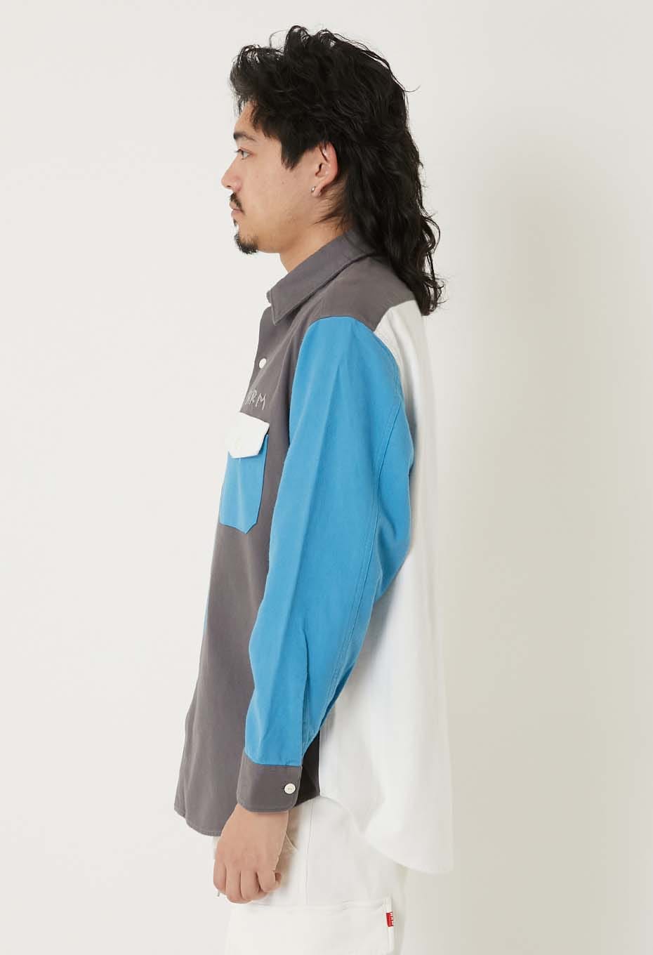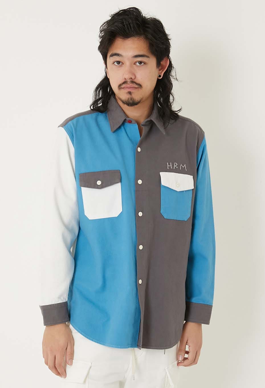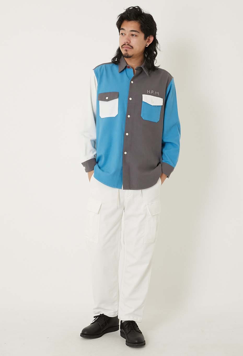 スタンダードフィットの2フラップポケットワークシャツをベースに、控えめなデザインのオリジナルボタンや、手刺しゅうであしらった「HRM」ロゴがさりげないアクセントになっています。