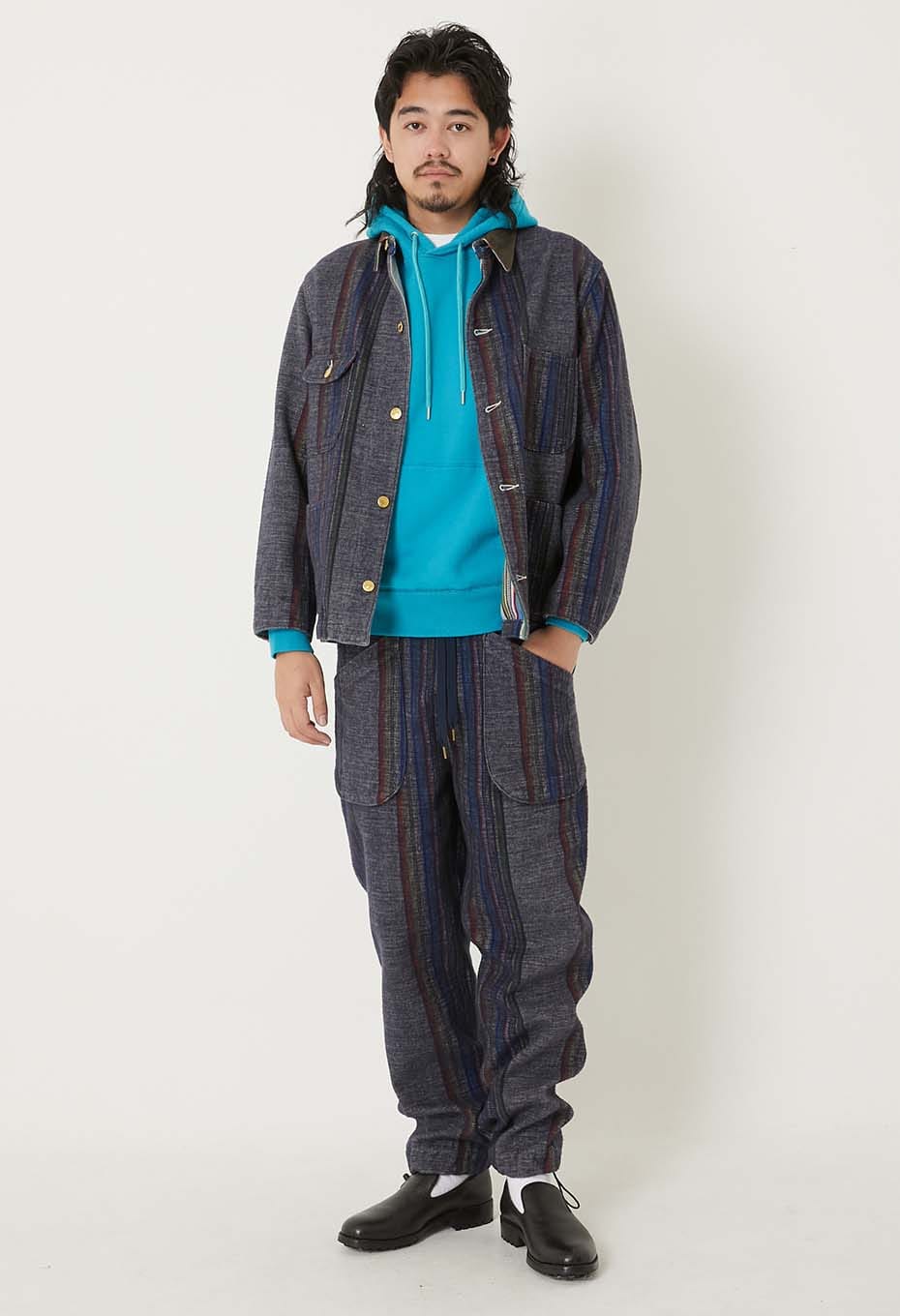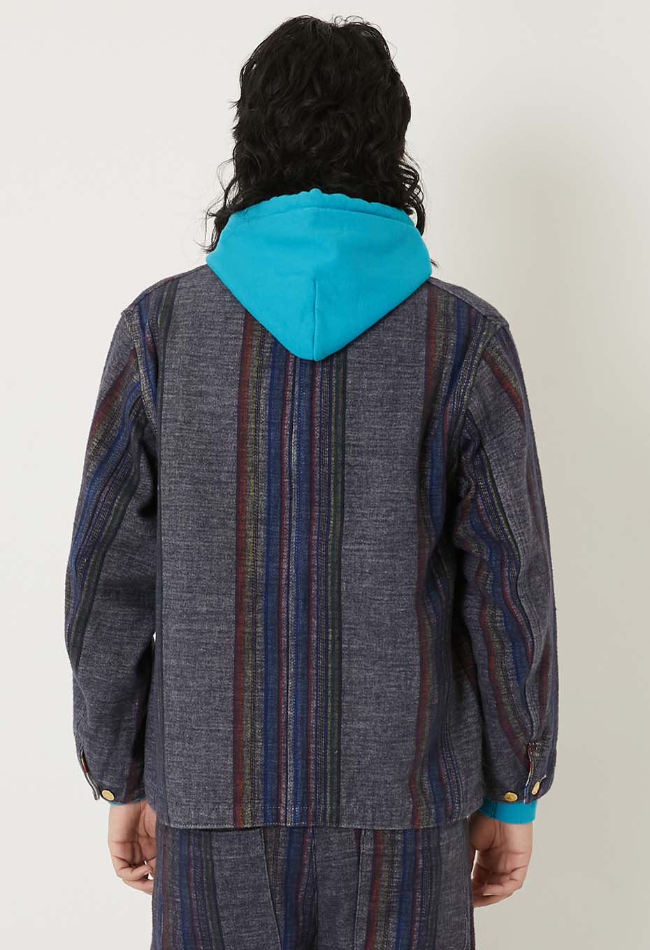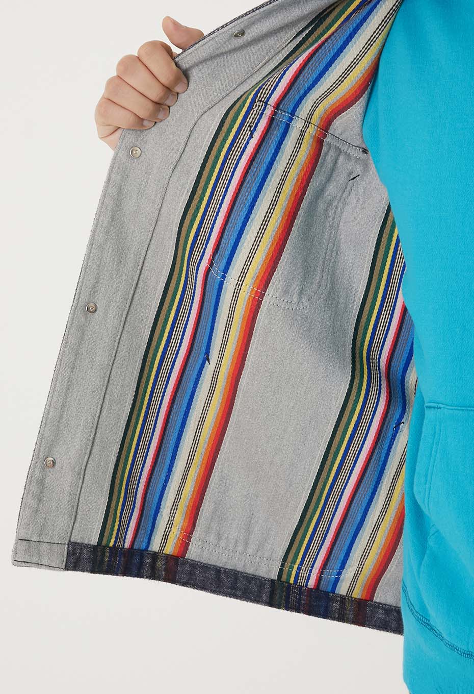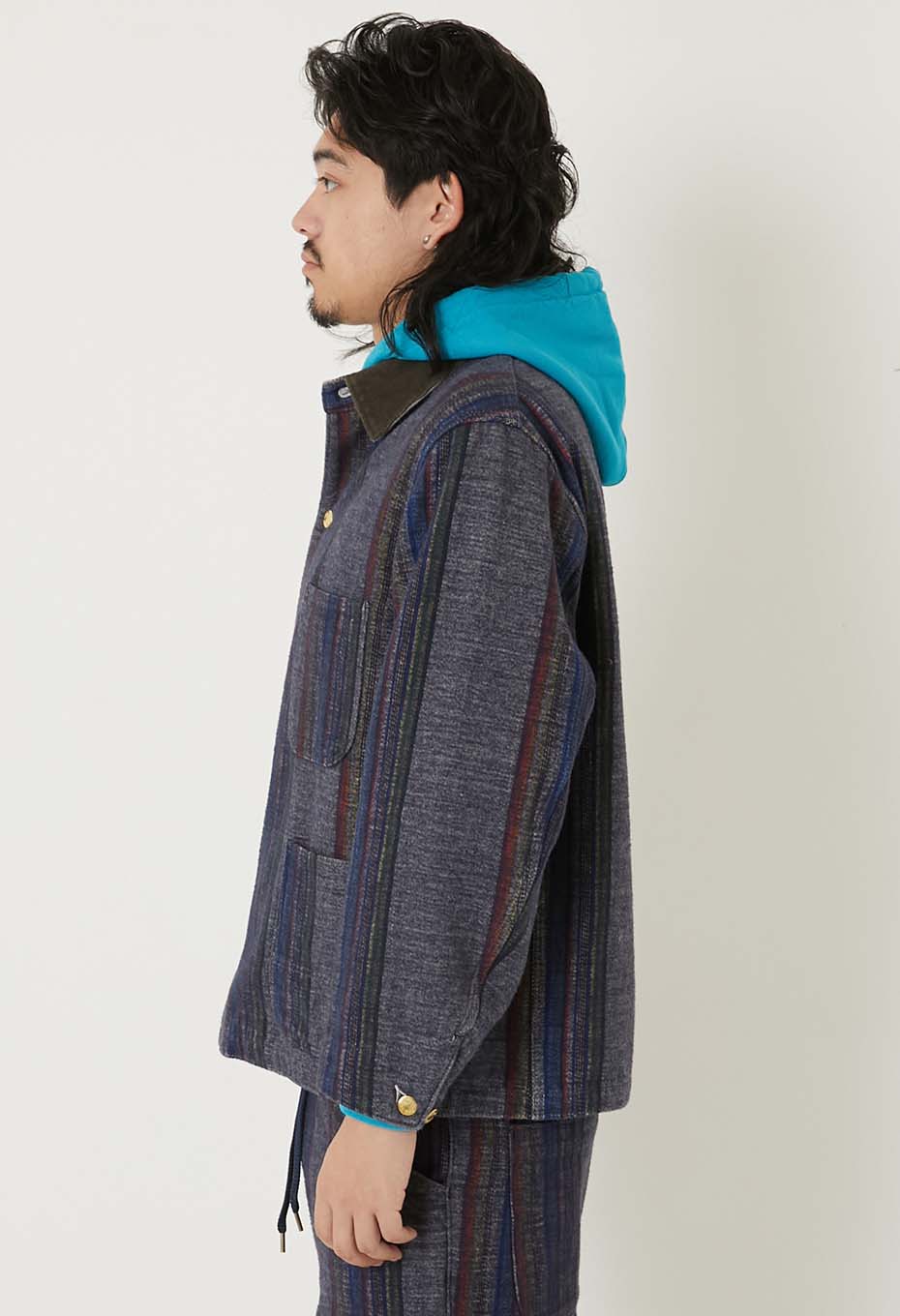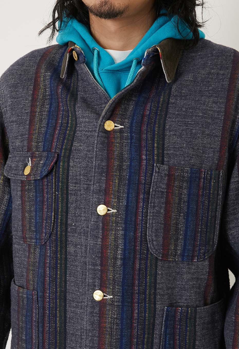特殊な組織で織り上げたオリジナルブランケット生地を使用しています。通常、重たくなりがちなブランケットライナーのジャケットを、一重仕立てで表現しました。ブランケットらしい多色の柄使いが印象的です。起毛をしっかりと施しており、生地の温かみが感じられます。
