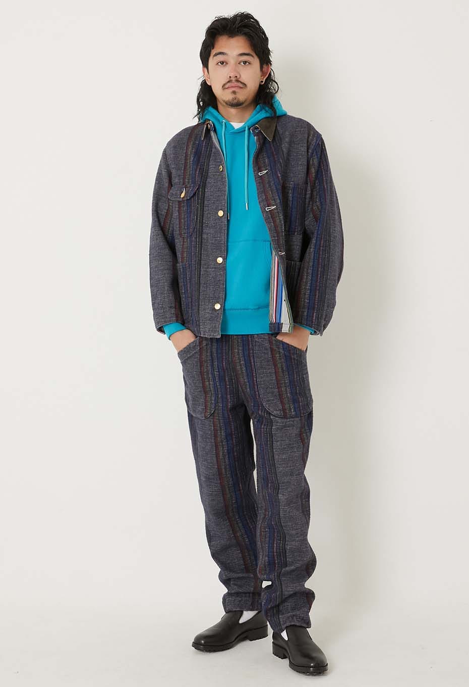 特殊な組織で織り上げたオリジナルブランケット生地を使用しています。通常、重たくなりがちなブランケットライナーのジャケットを一重仕立てで表現。ブランケットらしい多色の柄使いが印象的です。起毛をしっかりと施しており、生地の温かみが感じられます。