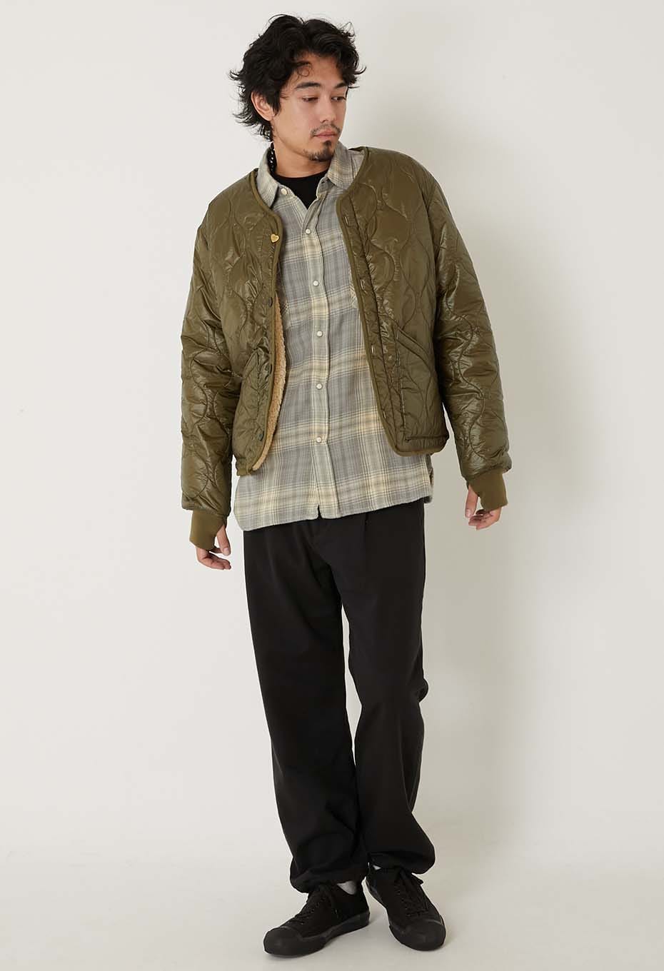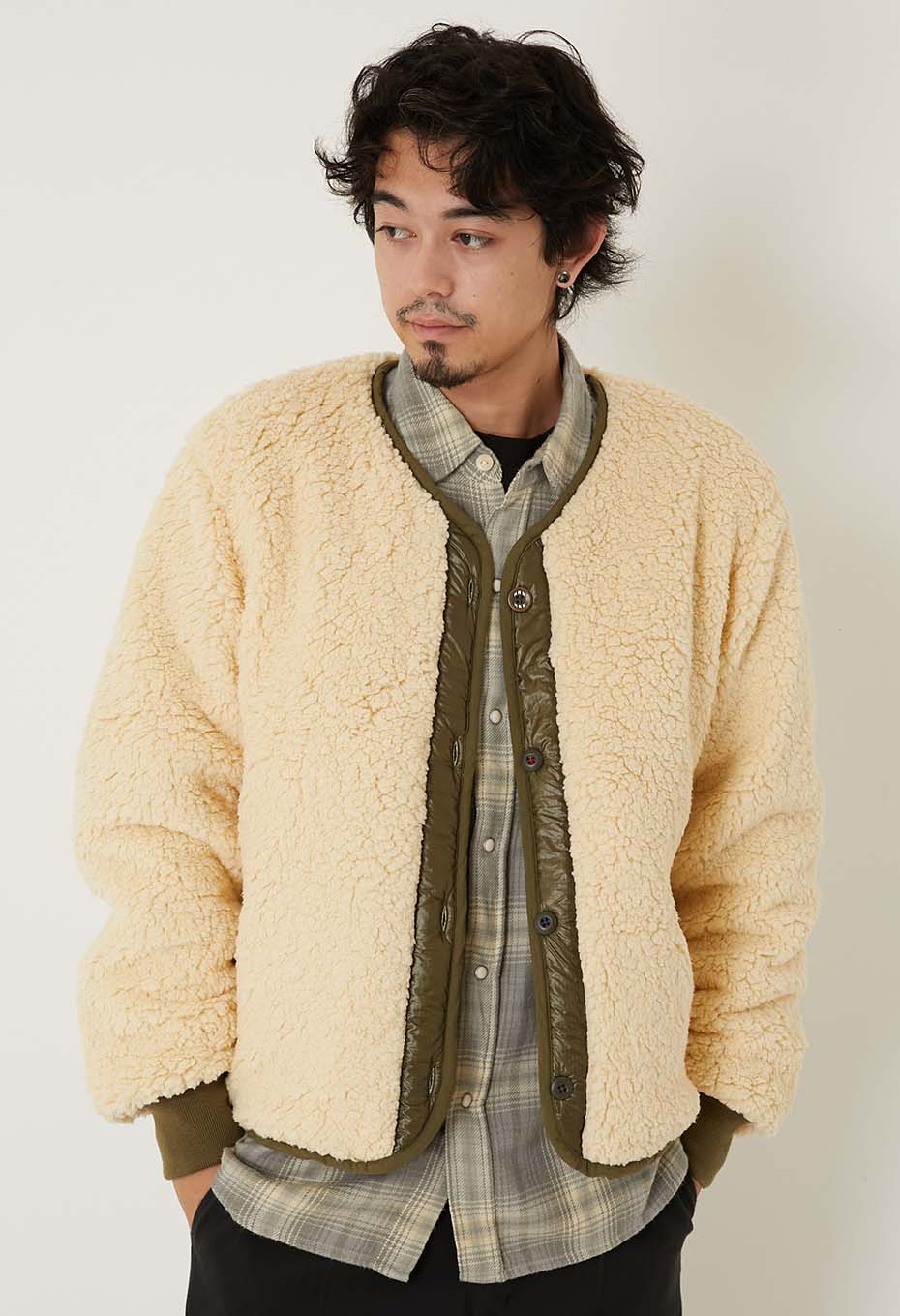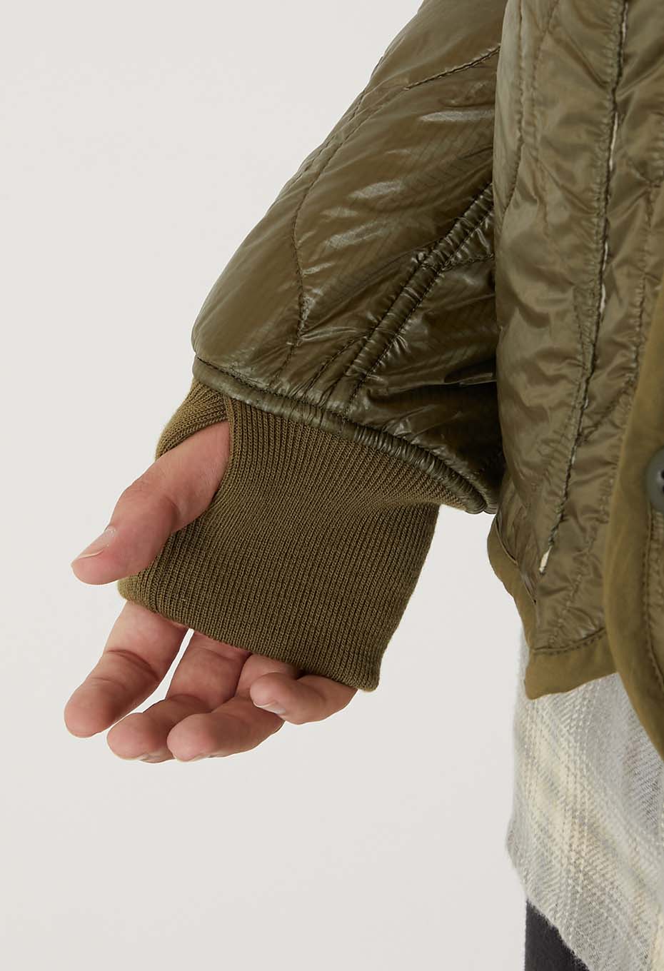 表地はミリタリーモチーフのリップストップキルティング、裏地は肌触りの心地よい温もりあるシープボアを使用しています。