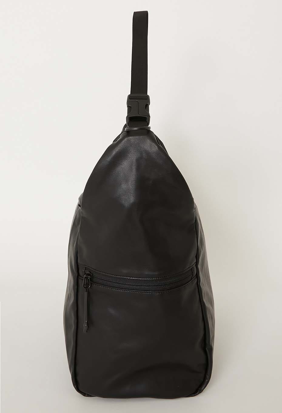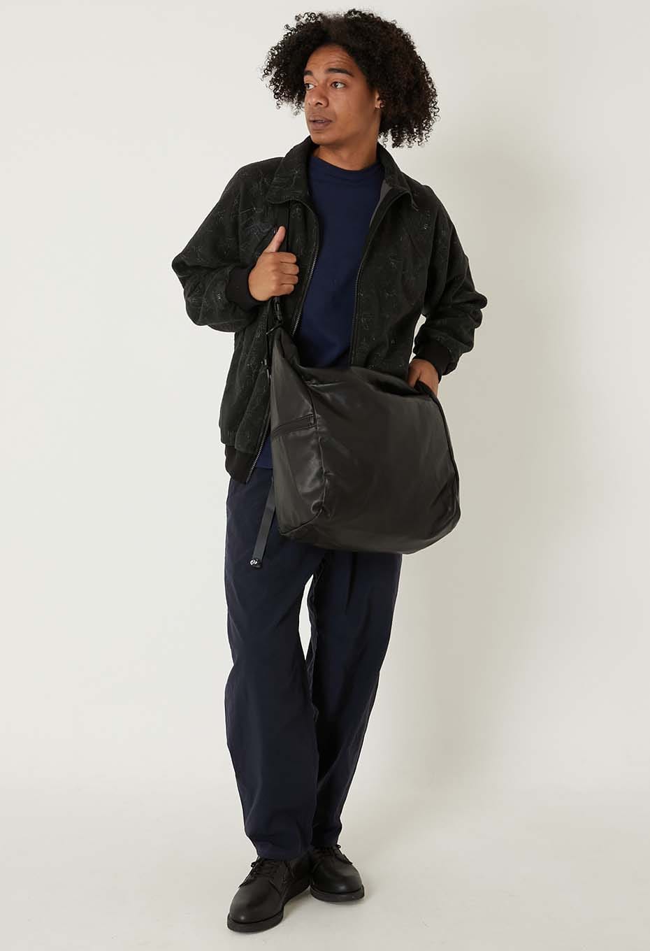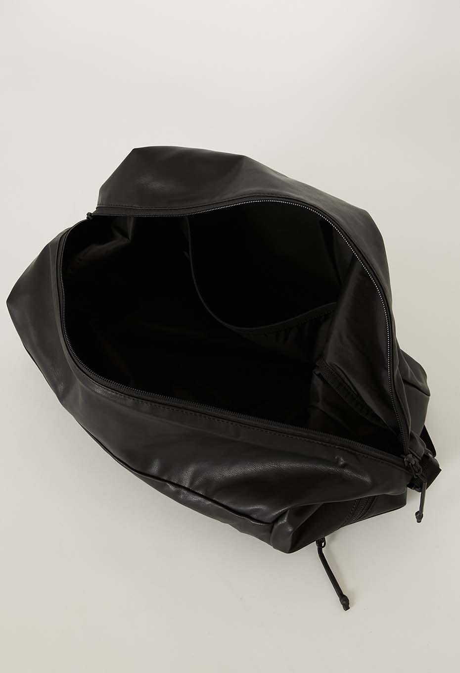 たっぷり荷物が入る大容量サイズで、側面にファスナーポケット、内側にポケットを搭載しています。表生地には柔らかくしなやかな素材感の合成皮革を、裏生地には薄くて丈夫なナイロン素材のリップストップ生地を使用しています。