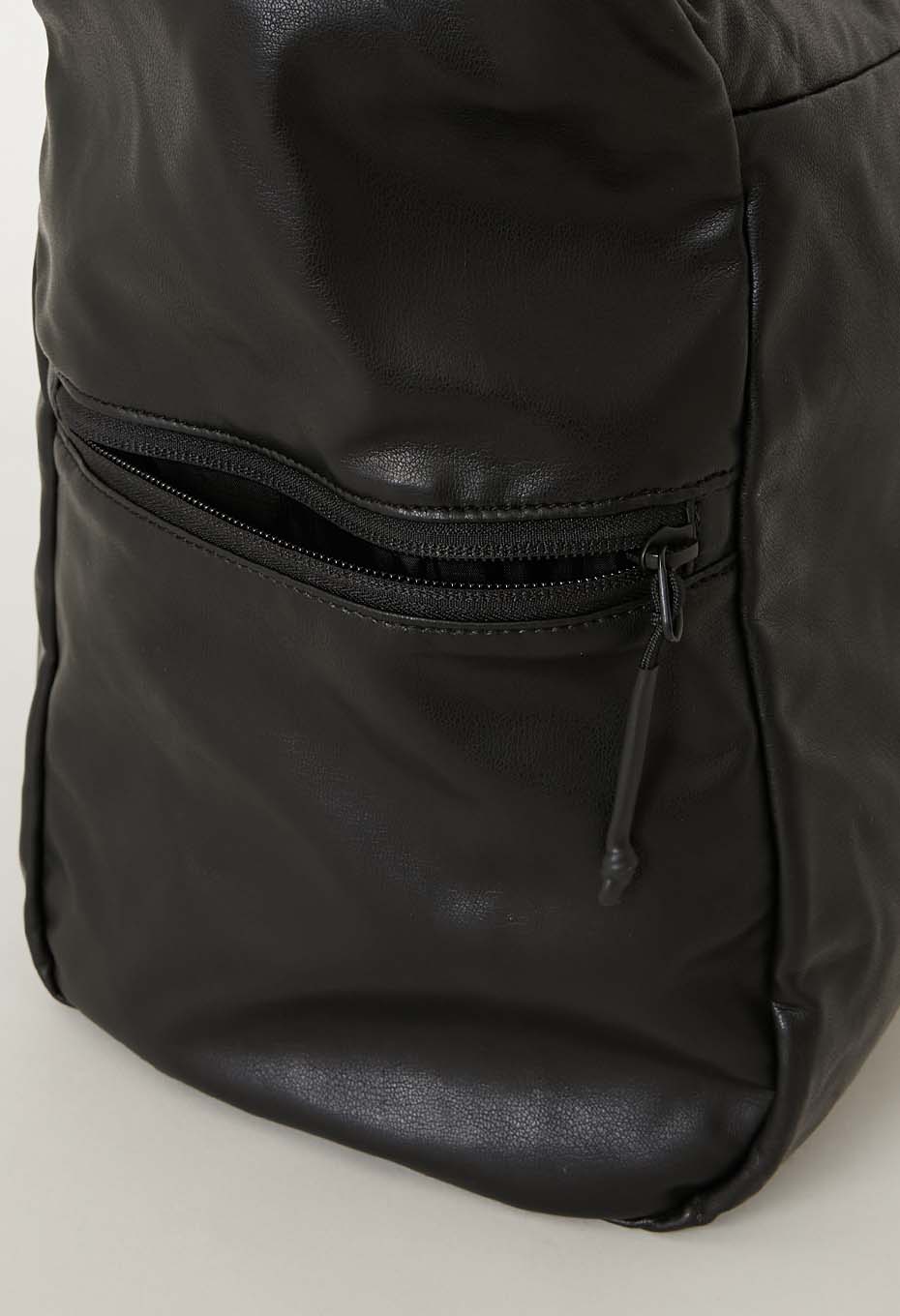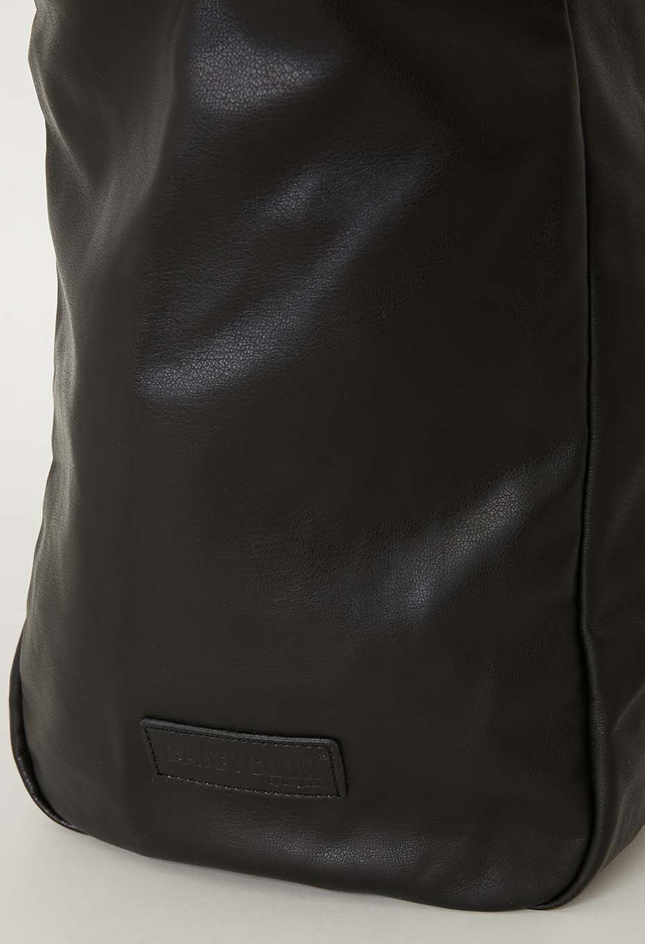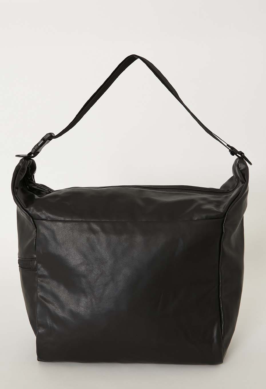 たっぷり荷物が入る大容量サイズで、側面にファスナーポケット、内側にポケットを搭載しています。表生地には柔らかくしなやかな素材感の合成皮革を、裏生地には薄くて丈夫なナイロン素材のリップストップ生地を使用しています。