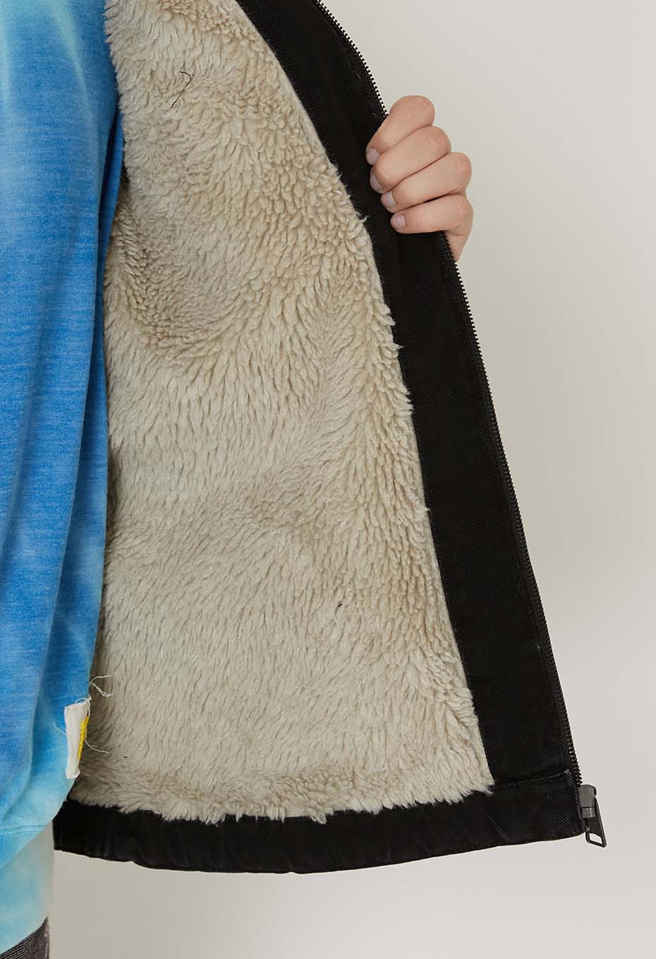 表地は厚手のコットンデニム、ボディはパイル裏地、袖はダイヤモンドキルト加工を採用しています。コントラストを効かせたコーデュロイの襟、フロントジップ、ジップ付き胸ポケット、人工皮革のスクエアラベルがアクセントです。オリジナルルーズフィット。