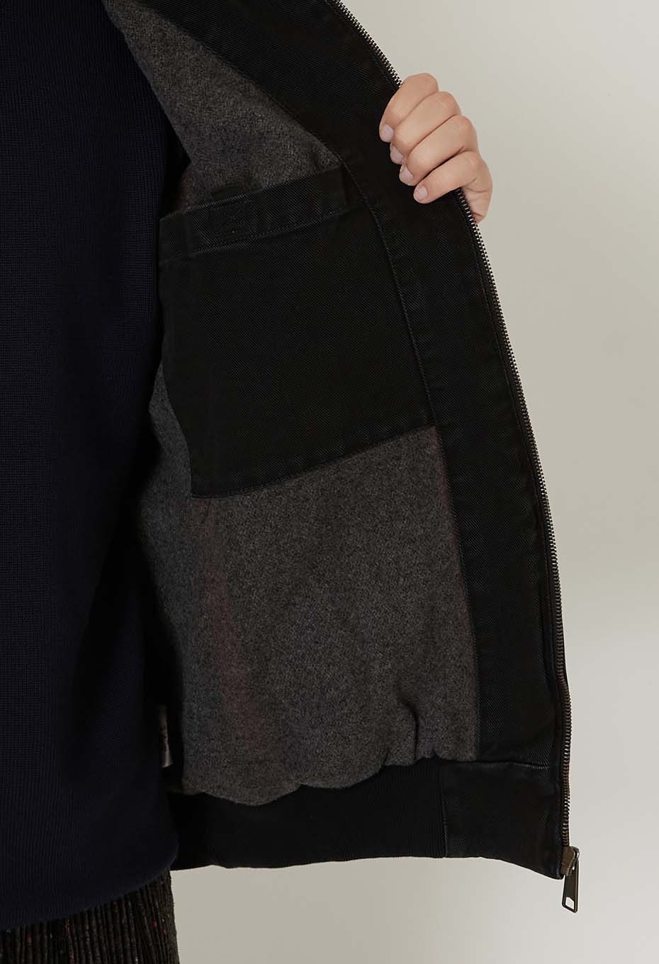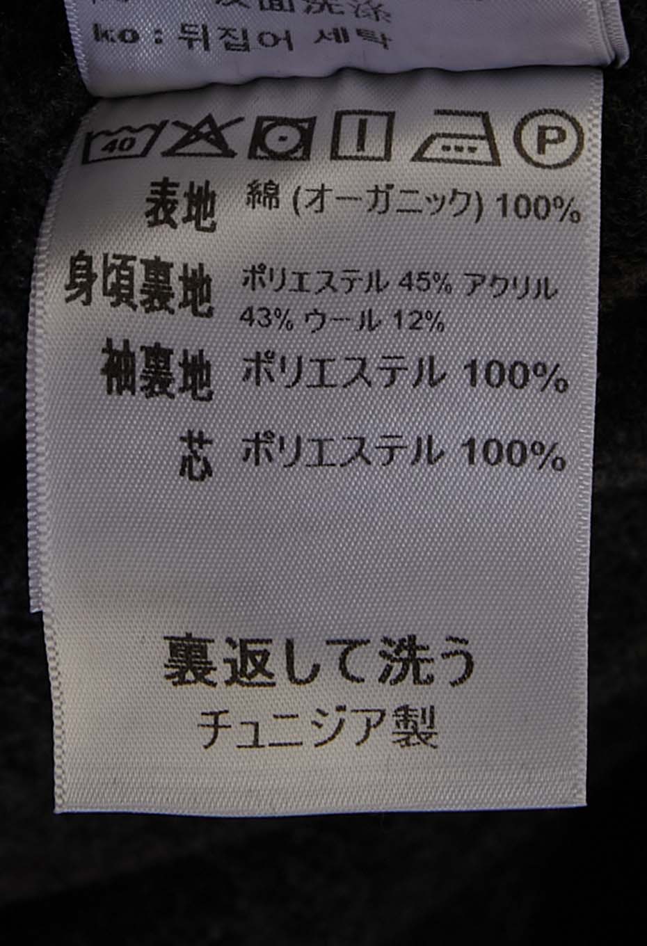 身頃裏地:ポリエステル45% アクリル43% ウール12%