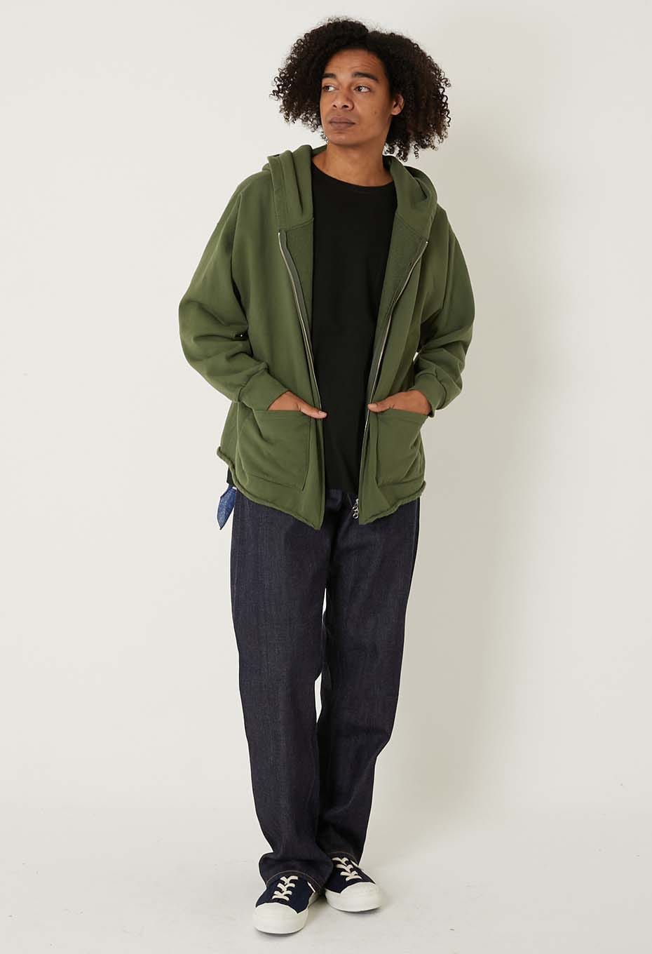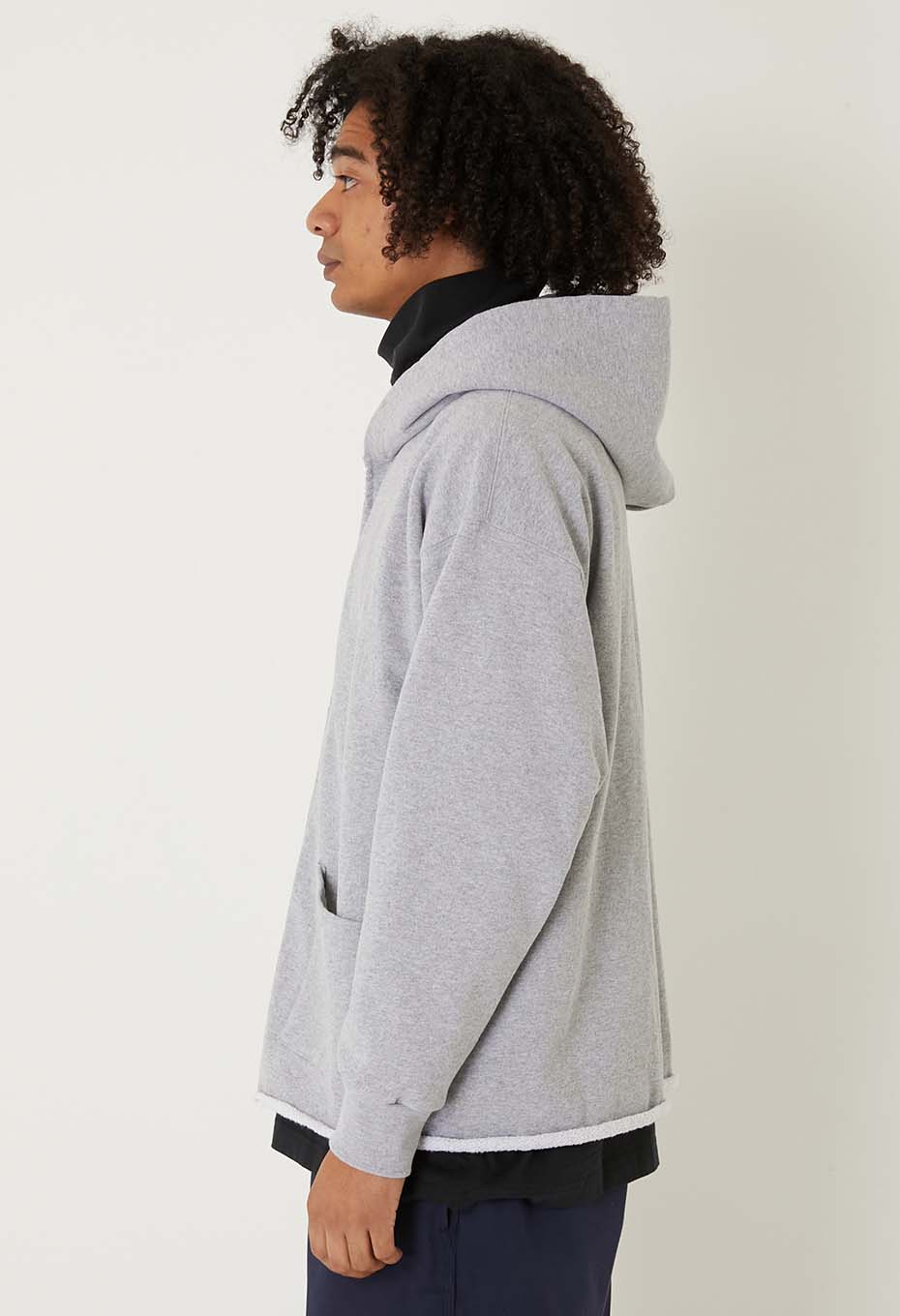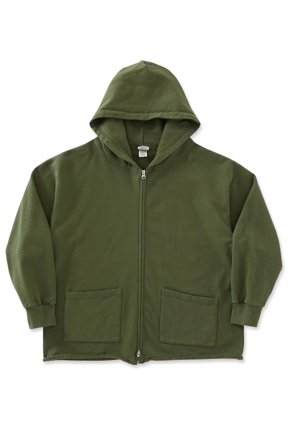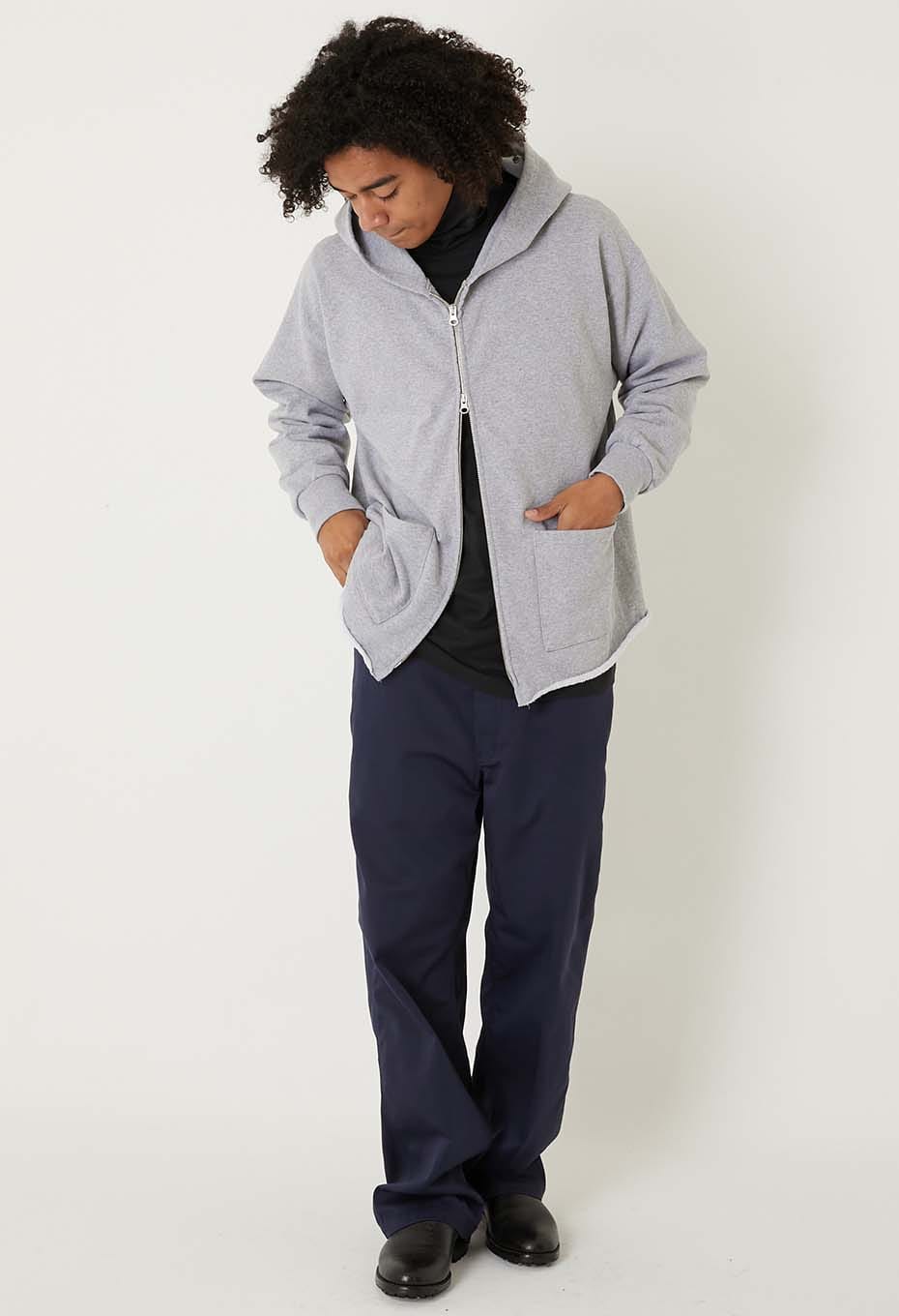 切りっぱなしの裾がカジュアルな表情を引き立てます。フードはダブル仕様で、着用時の立ち上がりが美しく見えます。下からの開閉が可能なダブルジップを採用し、動きのあるスタイリングを演出。ゆとりのあるリラックスフィットです。