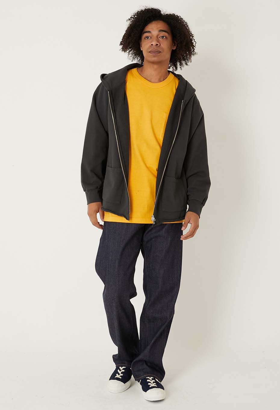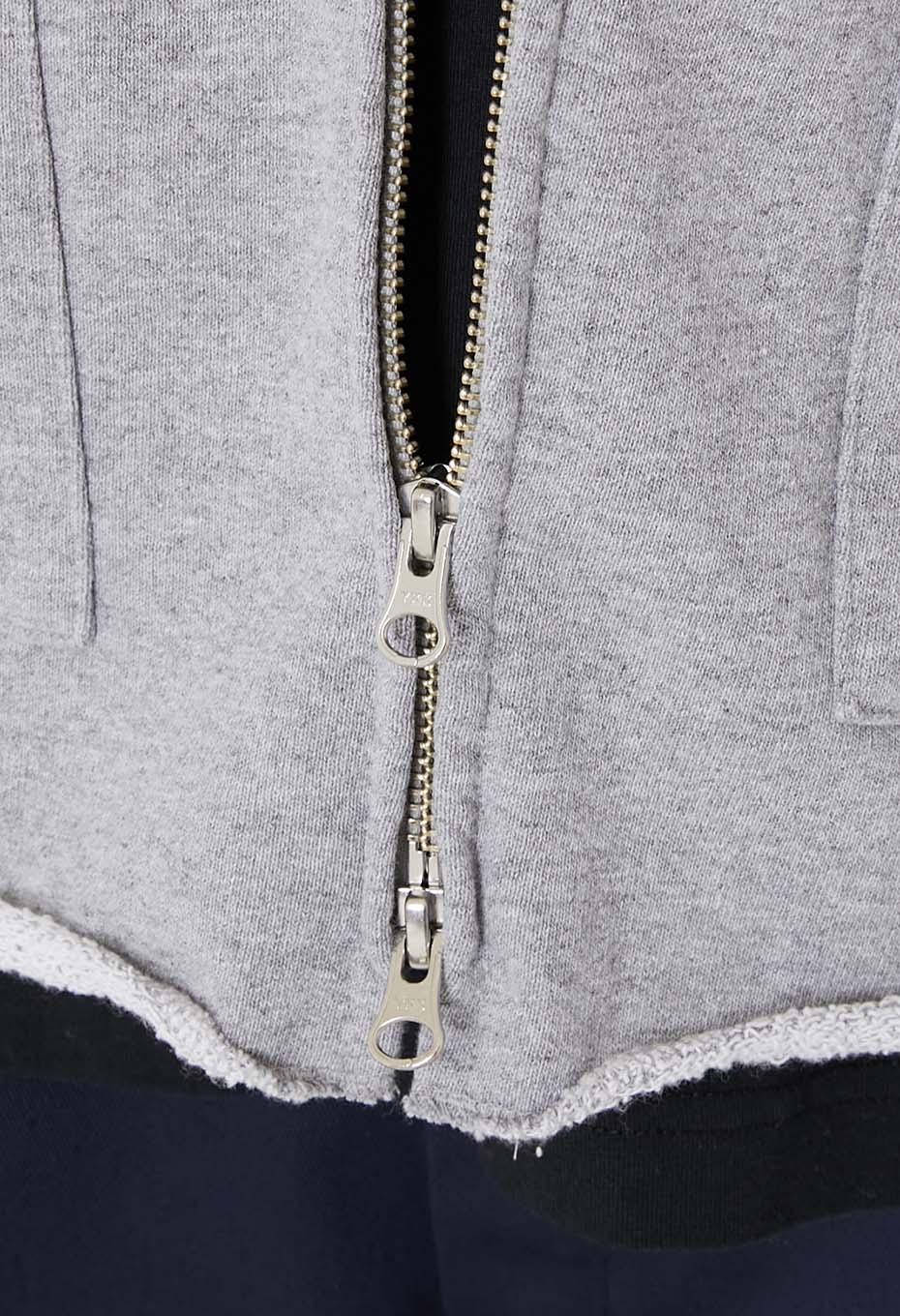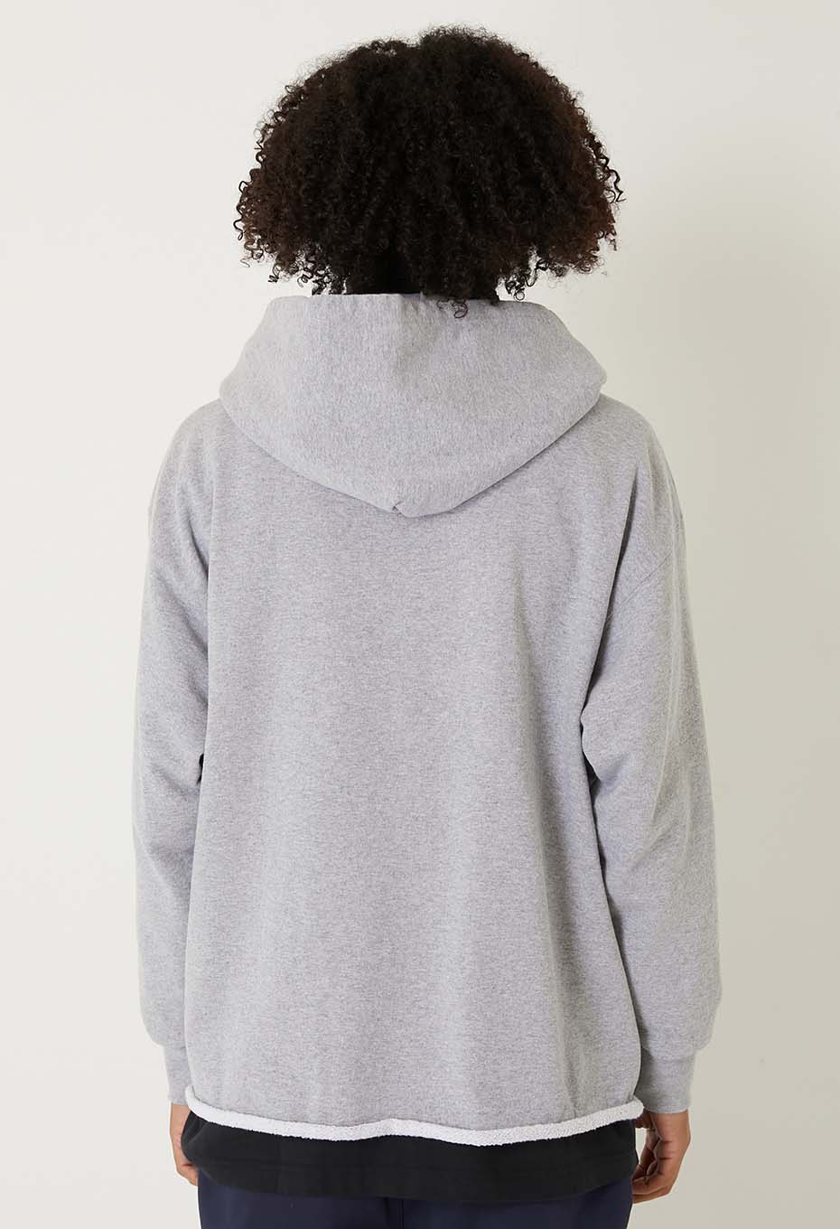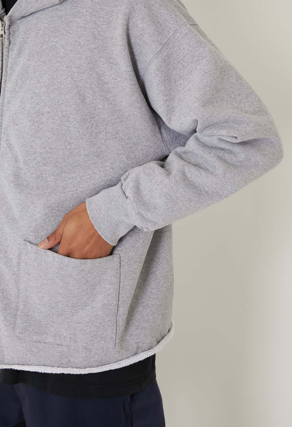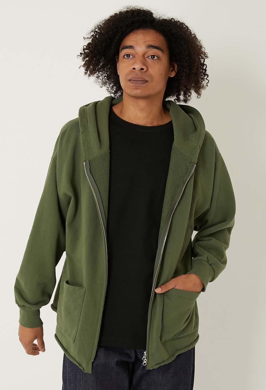 切りっぱなしの裾がカジュアルな表情を引き立てます。フードはダブル仕様で、着用時の立ち上がりが美しく見えます。下からの開閉が可能なダブルジップを採用し、動きのあるスタイリングを演出。ゆとりのあるリラックスフィットです。