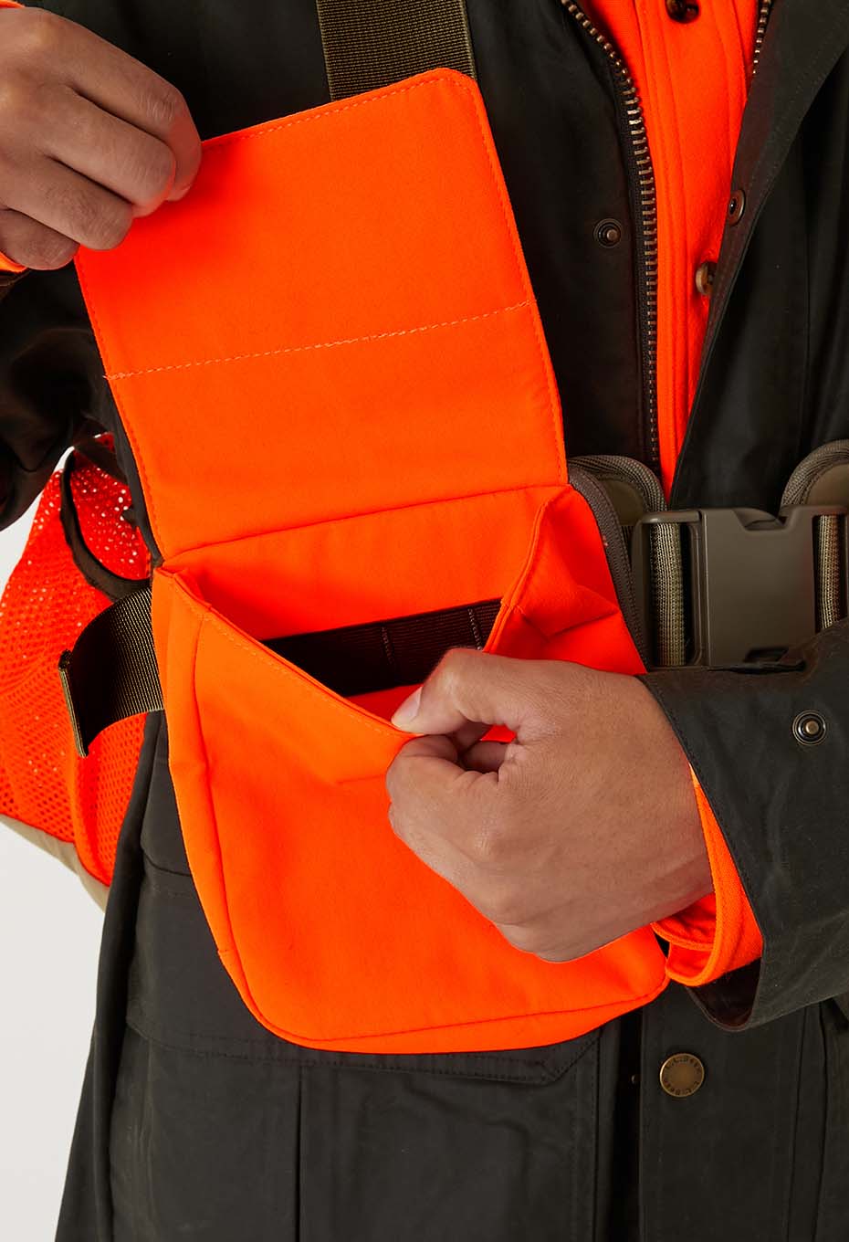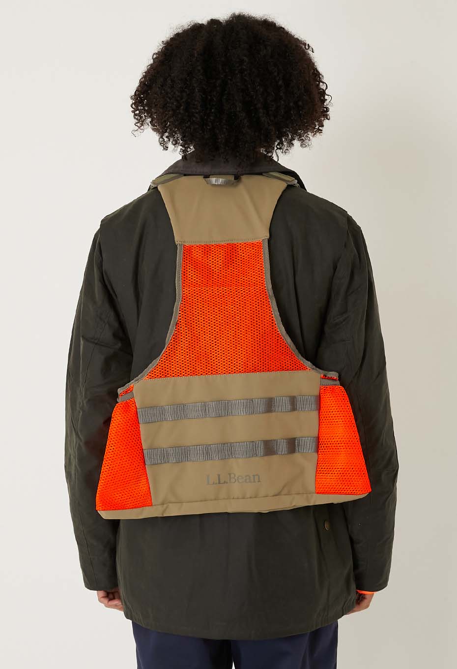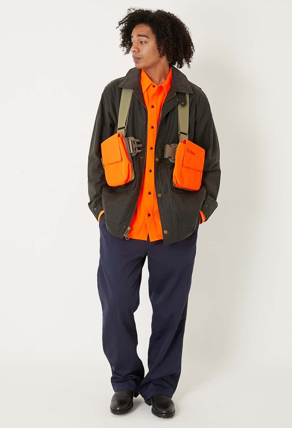 コーディネートのポイントとして、アウターやシャツの上から着用するスタイルがお勧めです。背面にも複数の収納ポケットを配しており、発色の良いハンターオレンジが目を引く一着です。