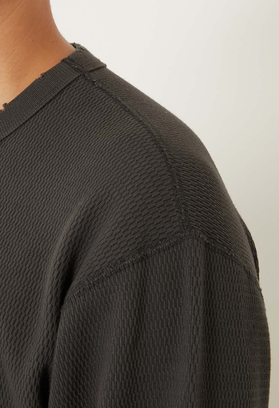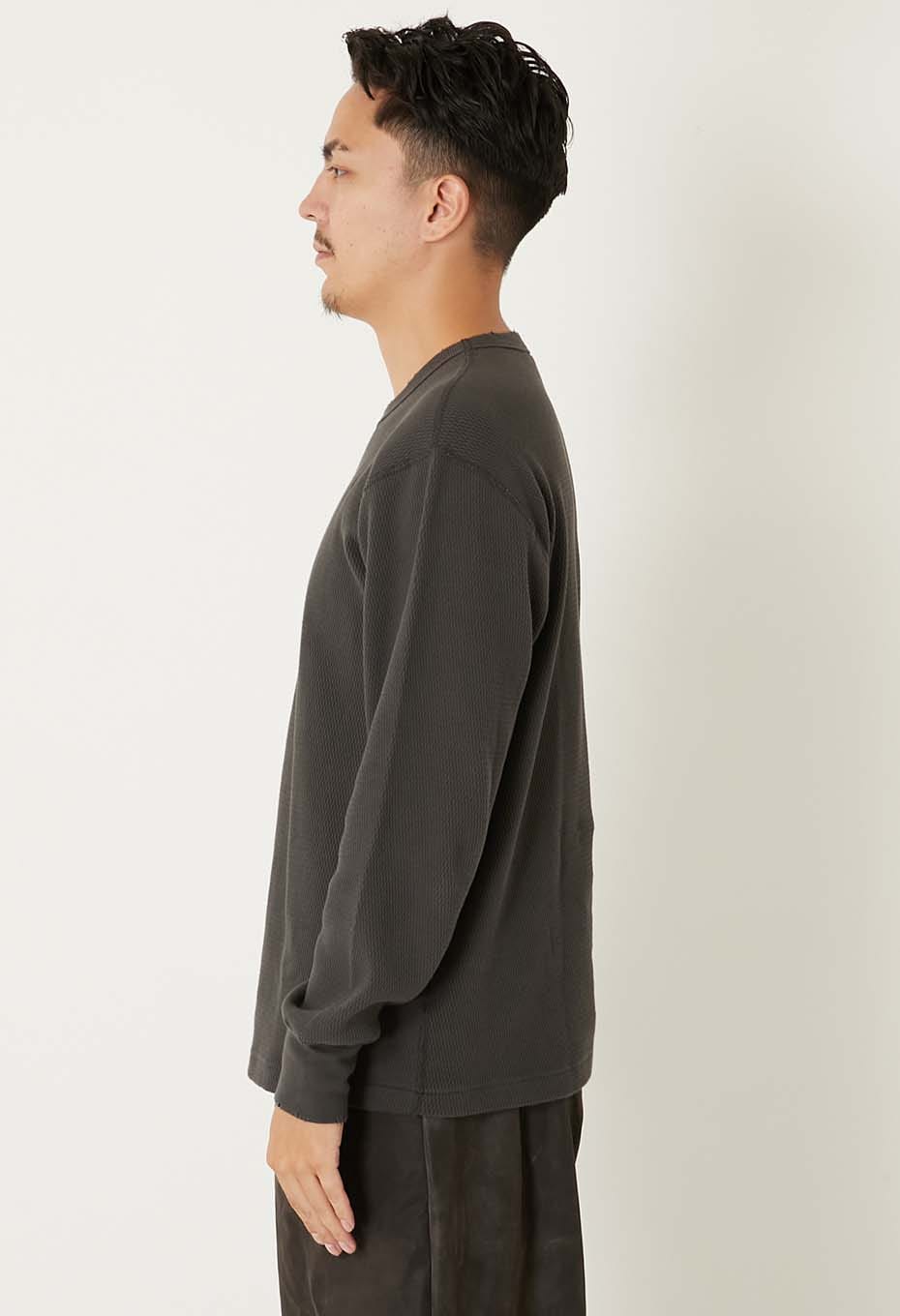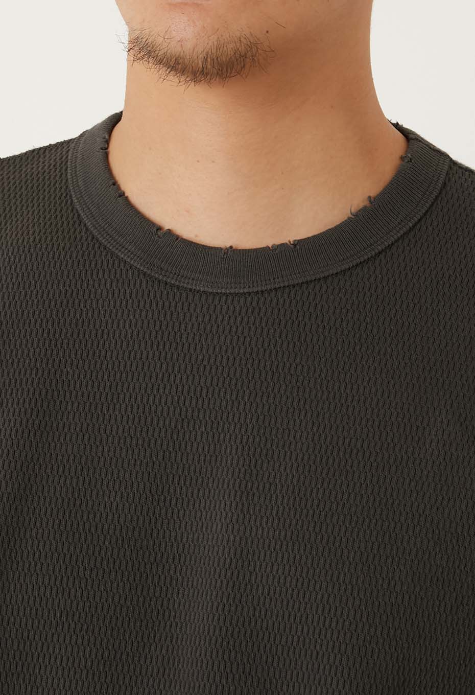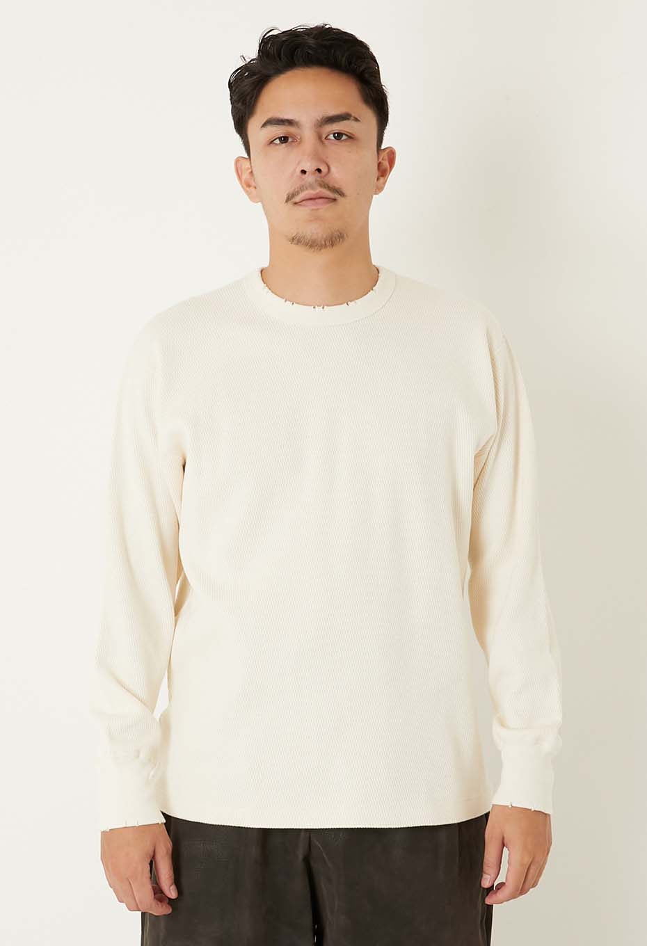 - 気温が氷点下になる北極での活動用にアメリカ海軍が開発した、3次元構造のハニカムサーマルです。立体的な編地により体温を逃がさず、高い吸水性により穏やかな天候でも屋内でも快適さを保ち続けることができます。今回はこのサーマルにダメージ加工を施し、一枚で着用しても様になるよう仕上げました。