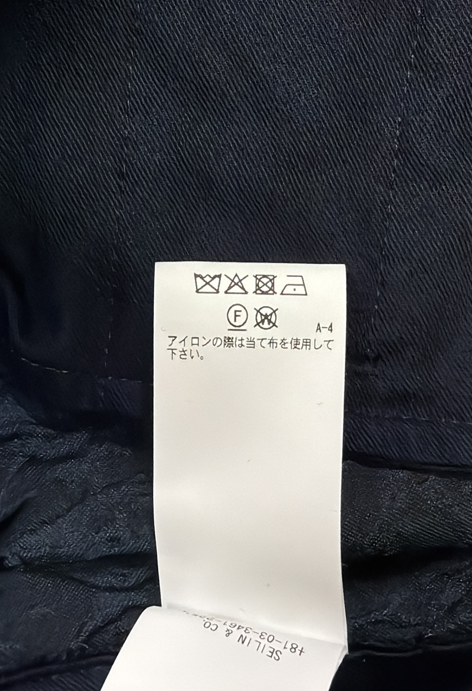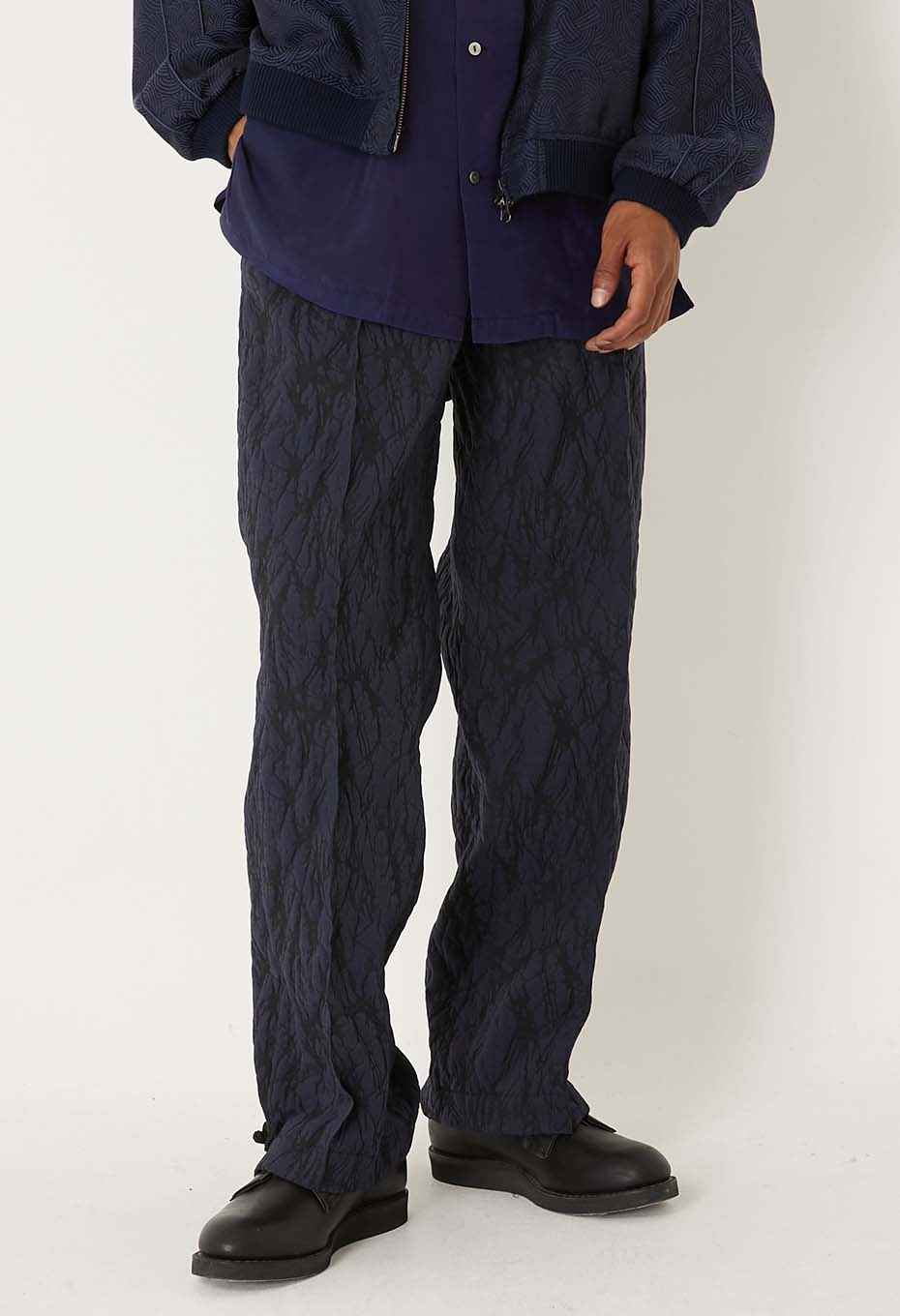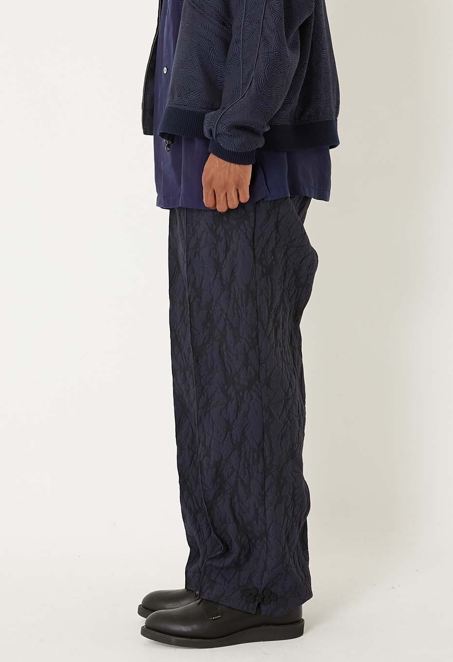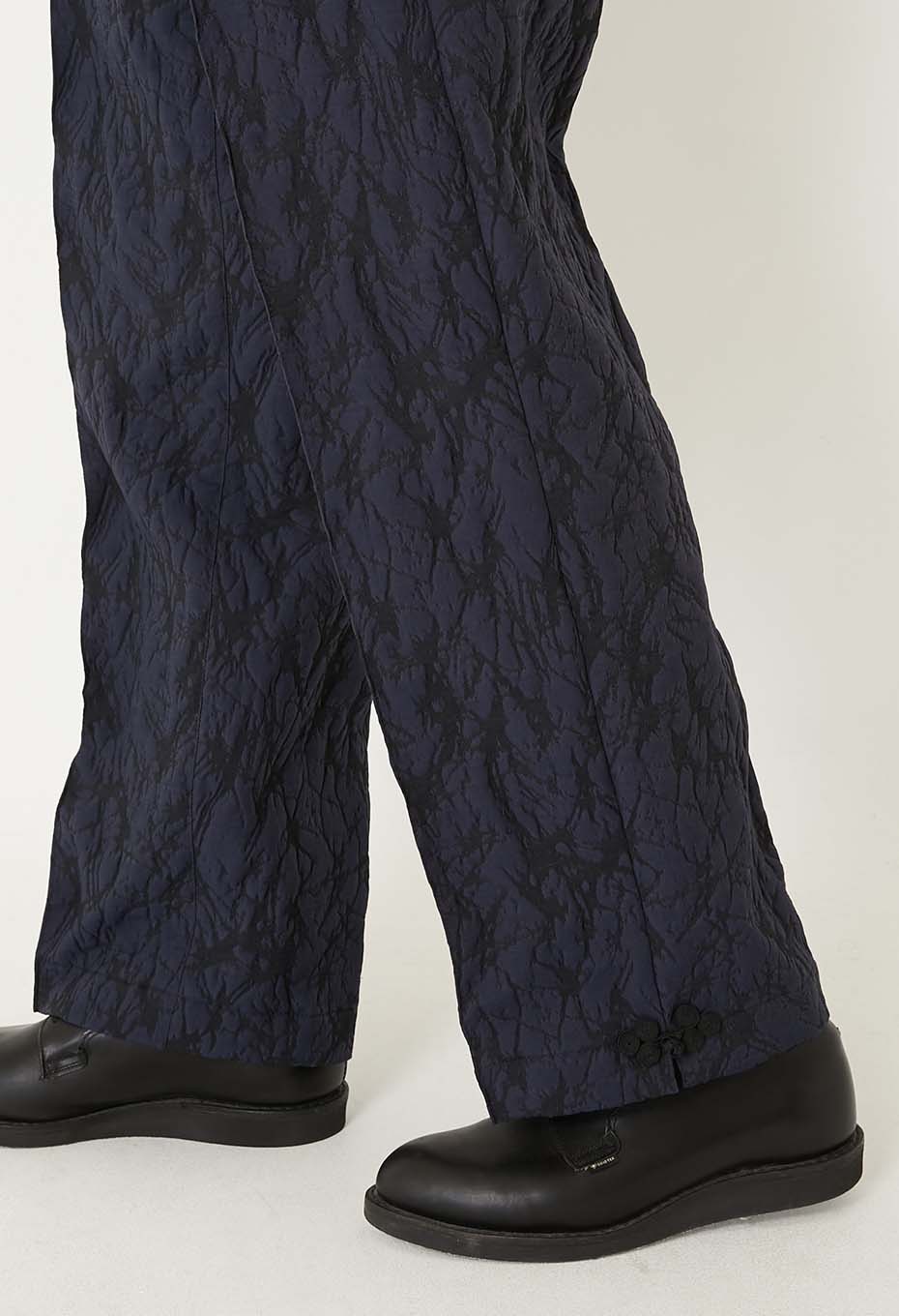 表に出るステッチをできる限り減らし、すっきりとしたセンタープリーツタックに仕上げました。太すぎず、ゆとりのあるきれいなストレートシルエットです。裾スリットに施した水引を思わせるノットディテールが特徴的な一本となっています。