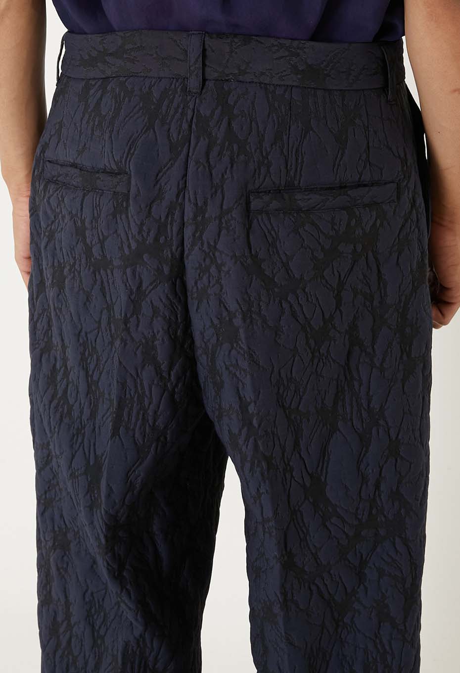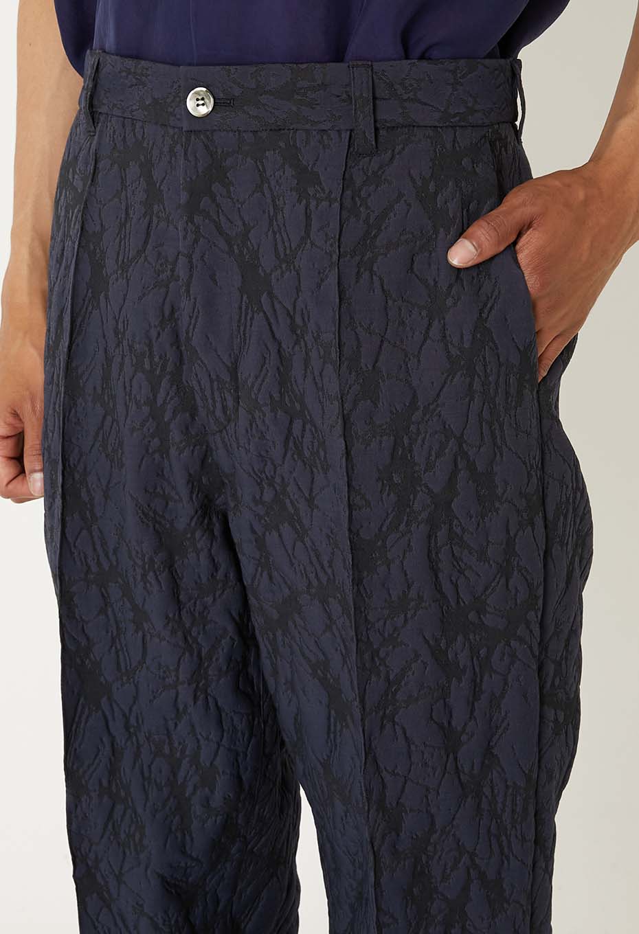 複合ジャカード織物で名高い桐生にて織り上げたジャカード生地を使用しています。タテ糸に用いている3種類の糸のうち1本をストレッチ性のある糸にすることで、柄が立体的に仕上がります。シーズンテーマの「玻璃」から着想を得たガラスパターンを表現しています。