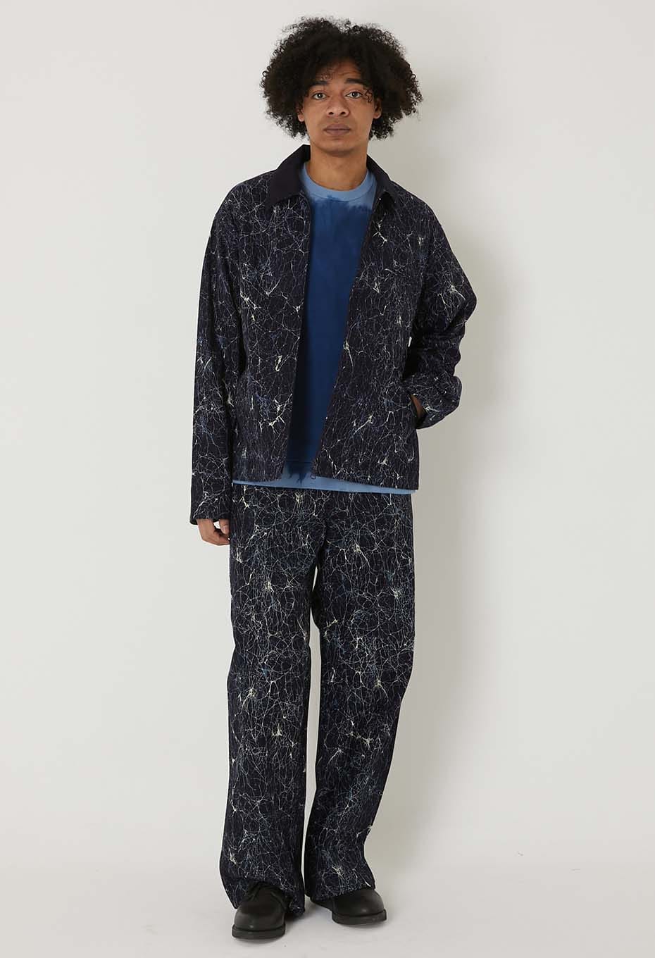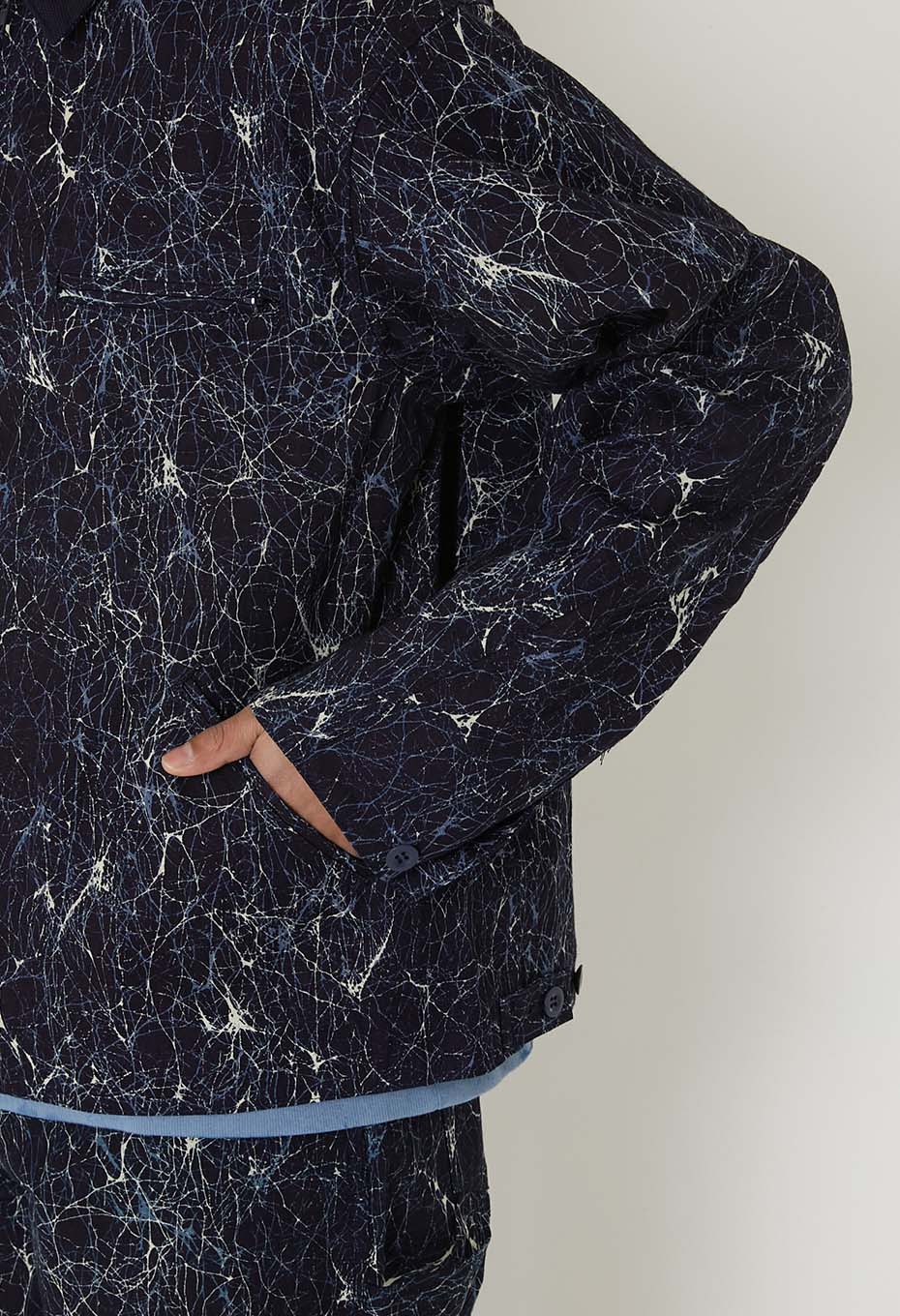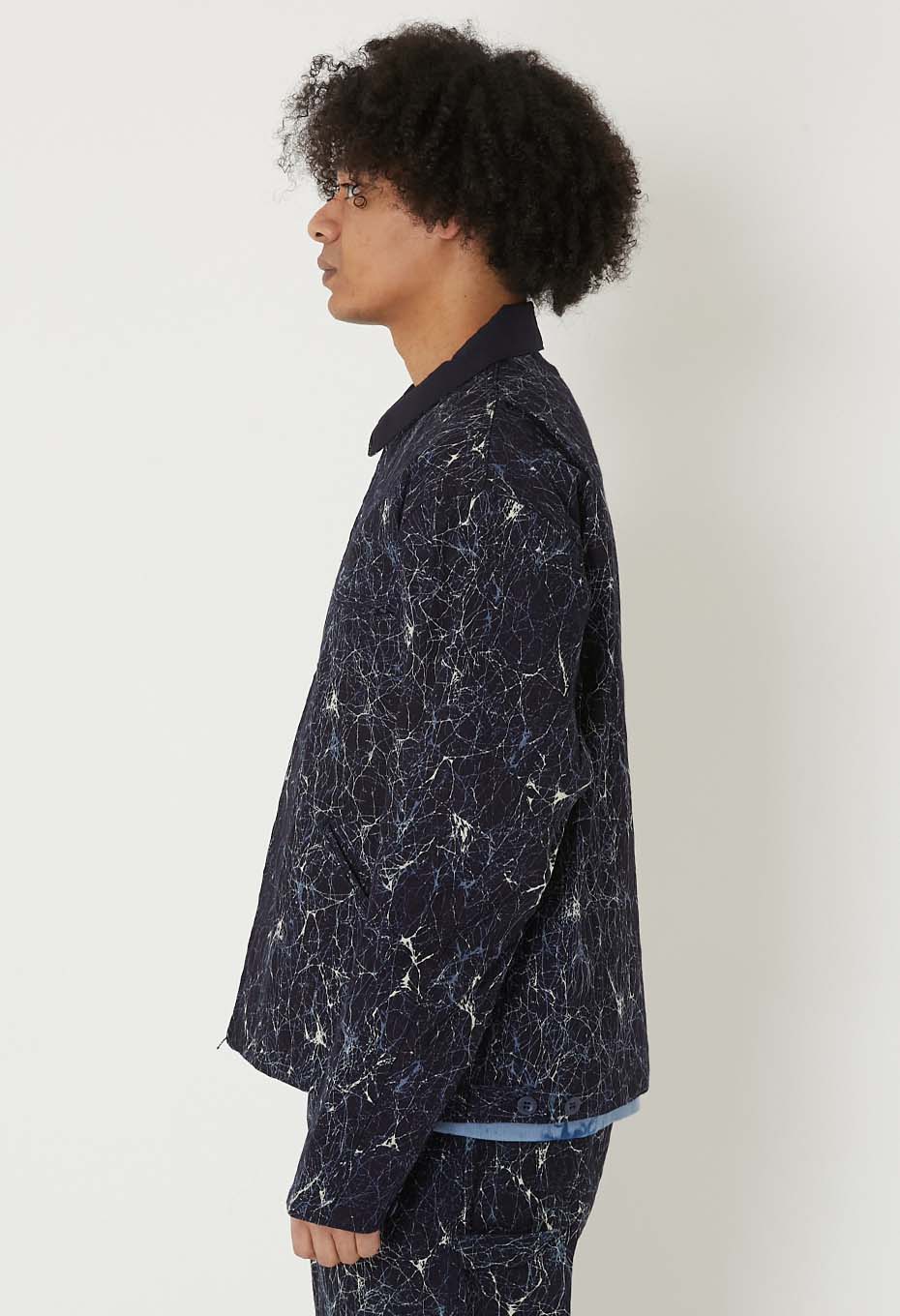 通常は太番の綿糸を使用するところ、インディゴ糸を用いて密に平織りで織り上げ、ダック素材を製作しました。高密度で美しいインディゴダックをベースに使用しています。ガラスをイメージしたろうけつ染めのようなパターンを、着抜プリントで表現しました。しなやかで適度なハリ感のある生地です。襟にはインディゴドビーサシコ生地を採用しています。