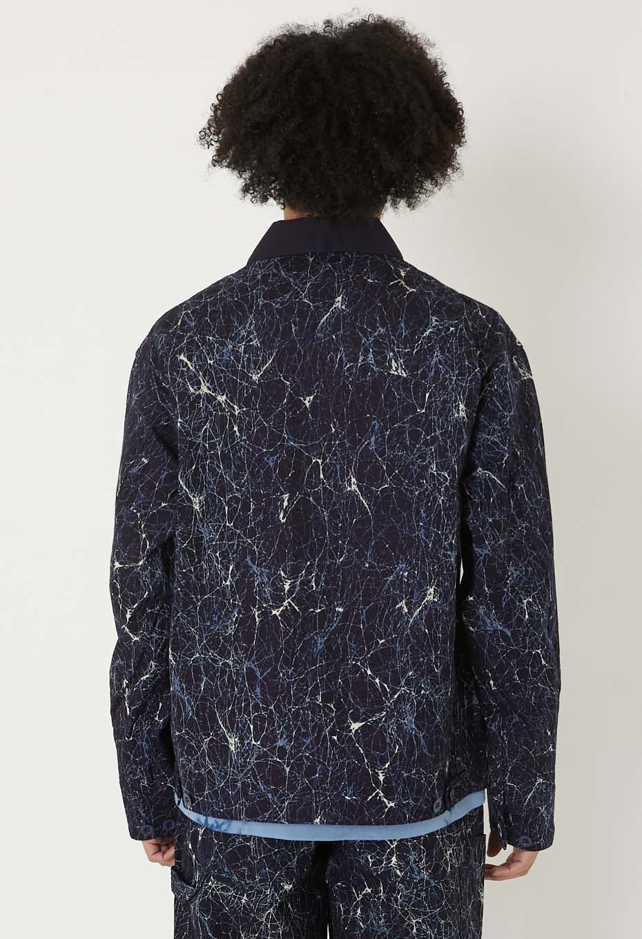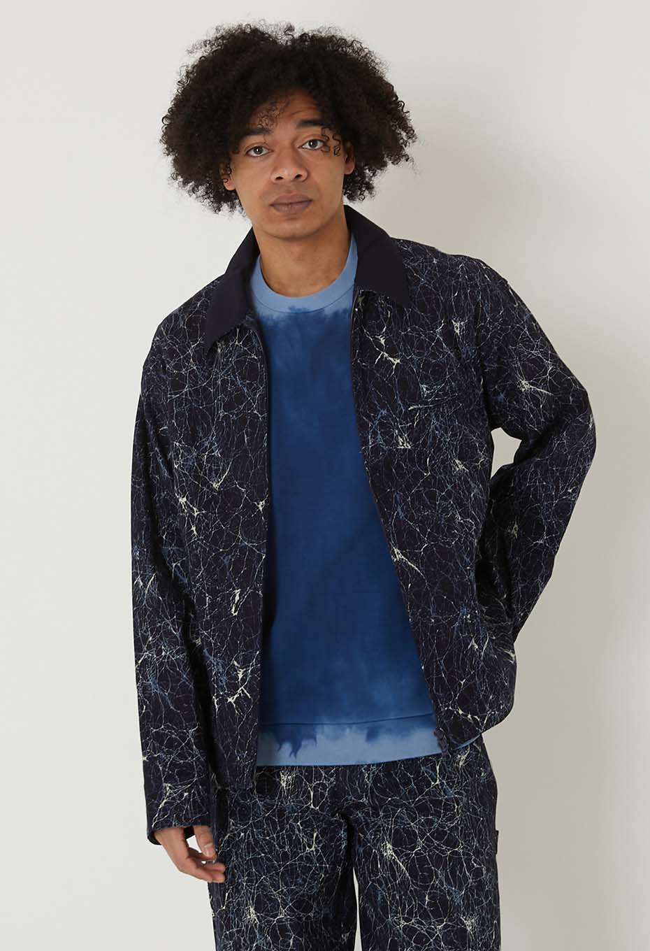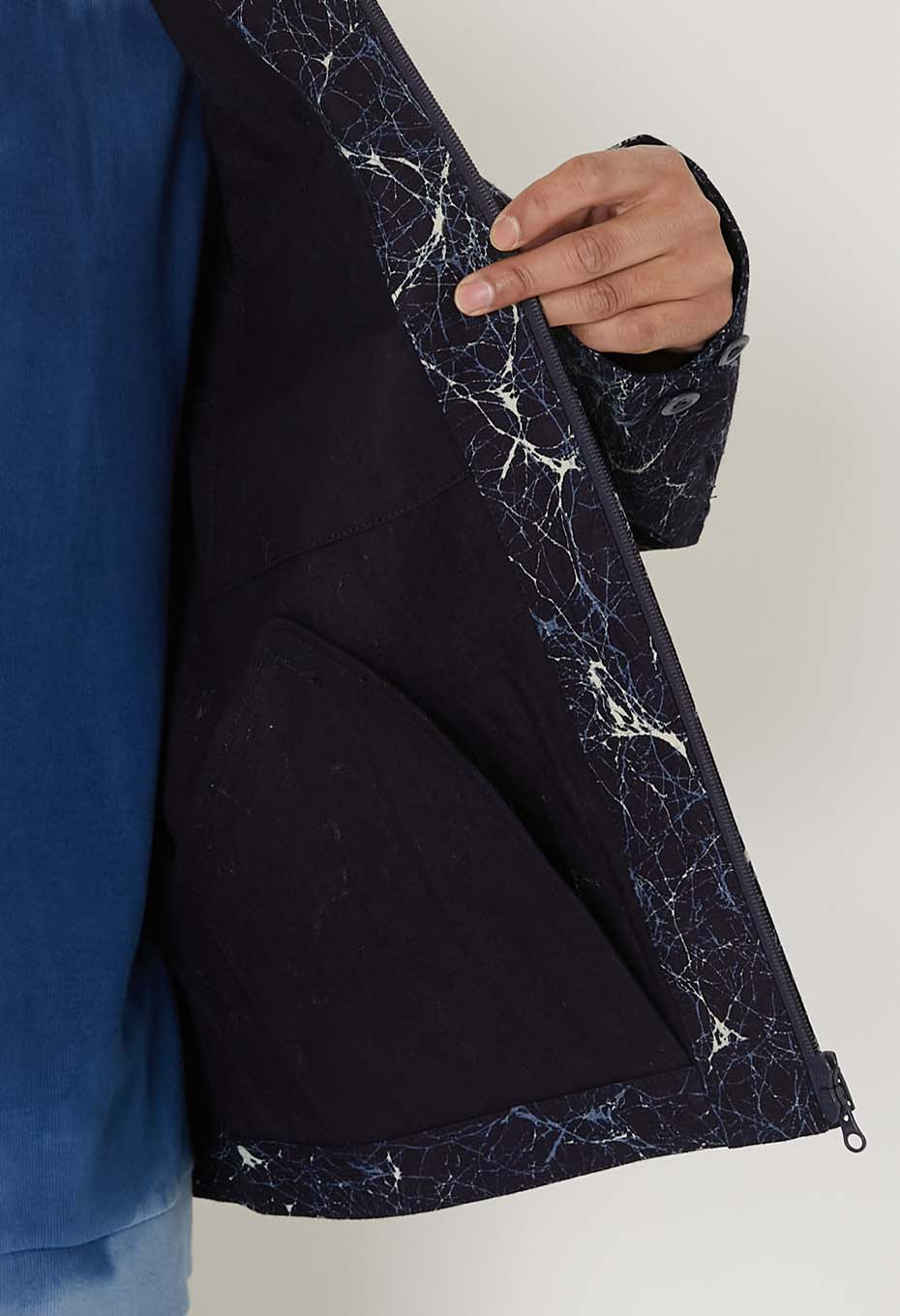 通常は太番の綿糸を使用するところ、インディゴ糸を用いて密に平織りで織り上げ、ダック素材を製作しました。高密度で美しいインディゴダックをベースに使用しています。ガラスをイメージしたろうけつ染めのようなパターンを、着抜プリントで表現しました。しなやかで適度なハリ感のある生地です。襟にはインディゴドビーサシコ生地を採用しています。