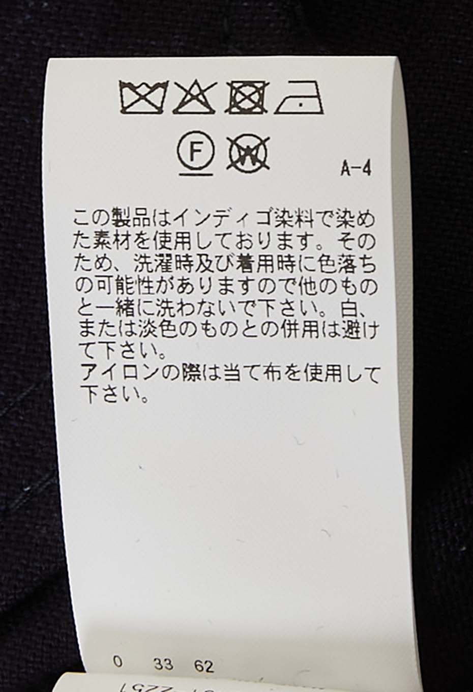 この製品は、インディゴ染料で染めた素材を使用しておりますので、繰り返し着たり、何度も洗濯することにより、濃いブルーから淡いブルーに移り変わっていきます。白又は淡色のものと組み合わせて着たり、重ね着をすると色が移りますので避けてください。洗濯の際は色が落ちますので単独洗いでお願いします。