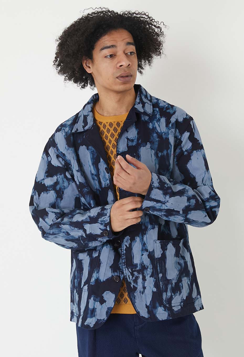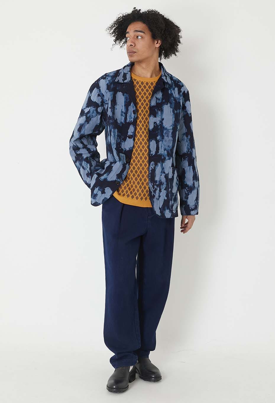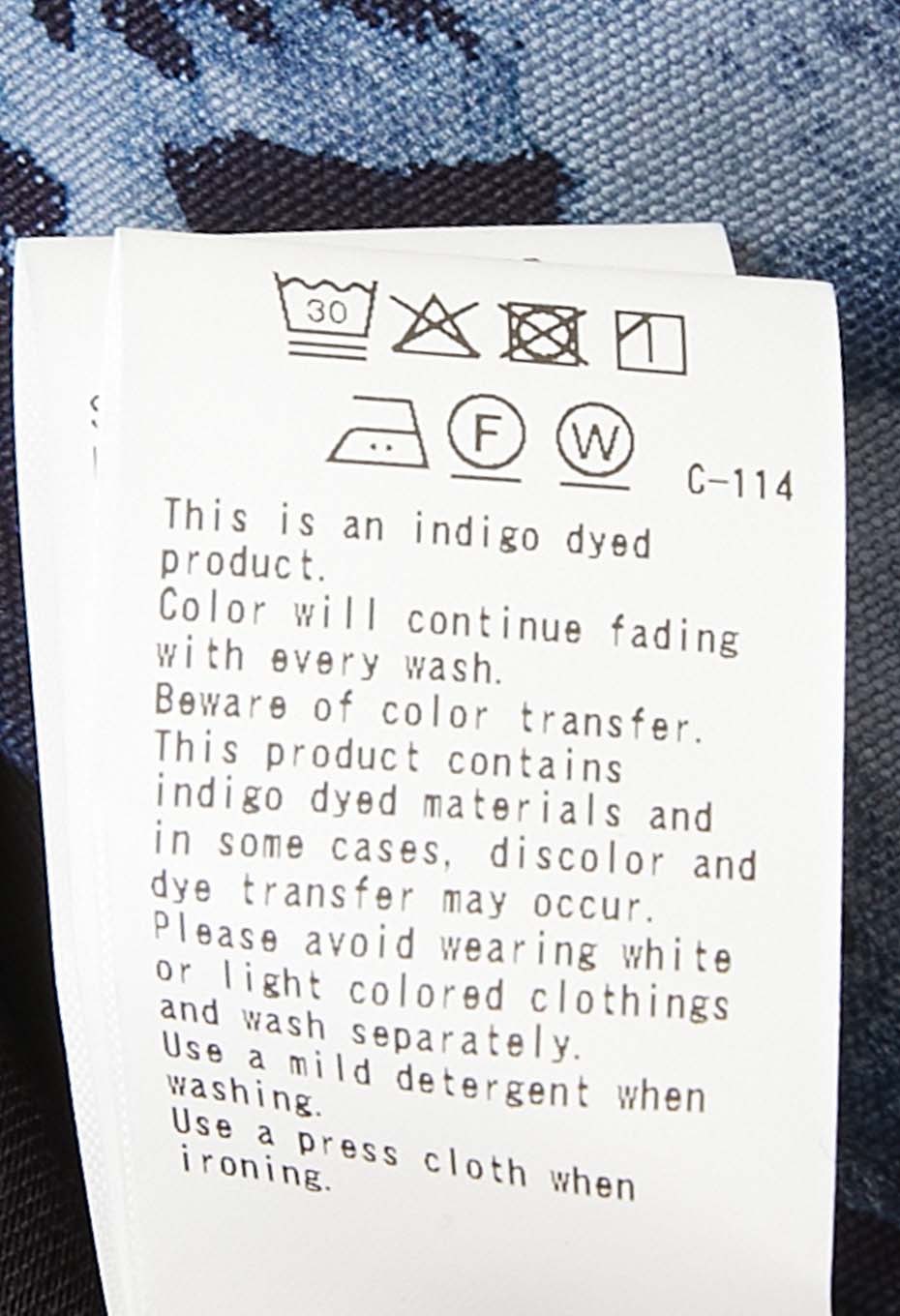 この製品は、インディゴ染料で染めた素材を使用しておりますので、繰り返し着たり、何度も洗濯することにより、濃いブルーから淡いブルーに移り変わっていきます。白又は淡色のものと組み合わせて着たり、重ね着をすると色が移りますので避けてください。洗濯の際は色が落ちますので単独洗いでお願いします。また、保管の際は光が当たらないように気を付けてください。また、折りたたんだ状態で放置すると、折り目が退色することがあります。