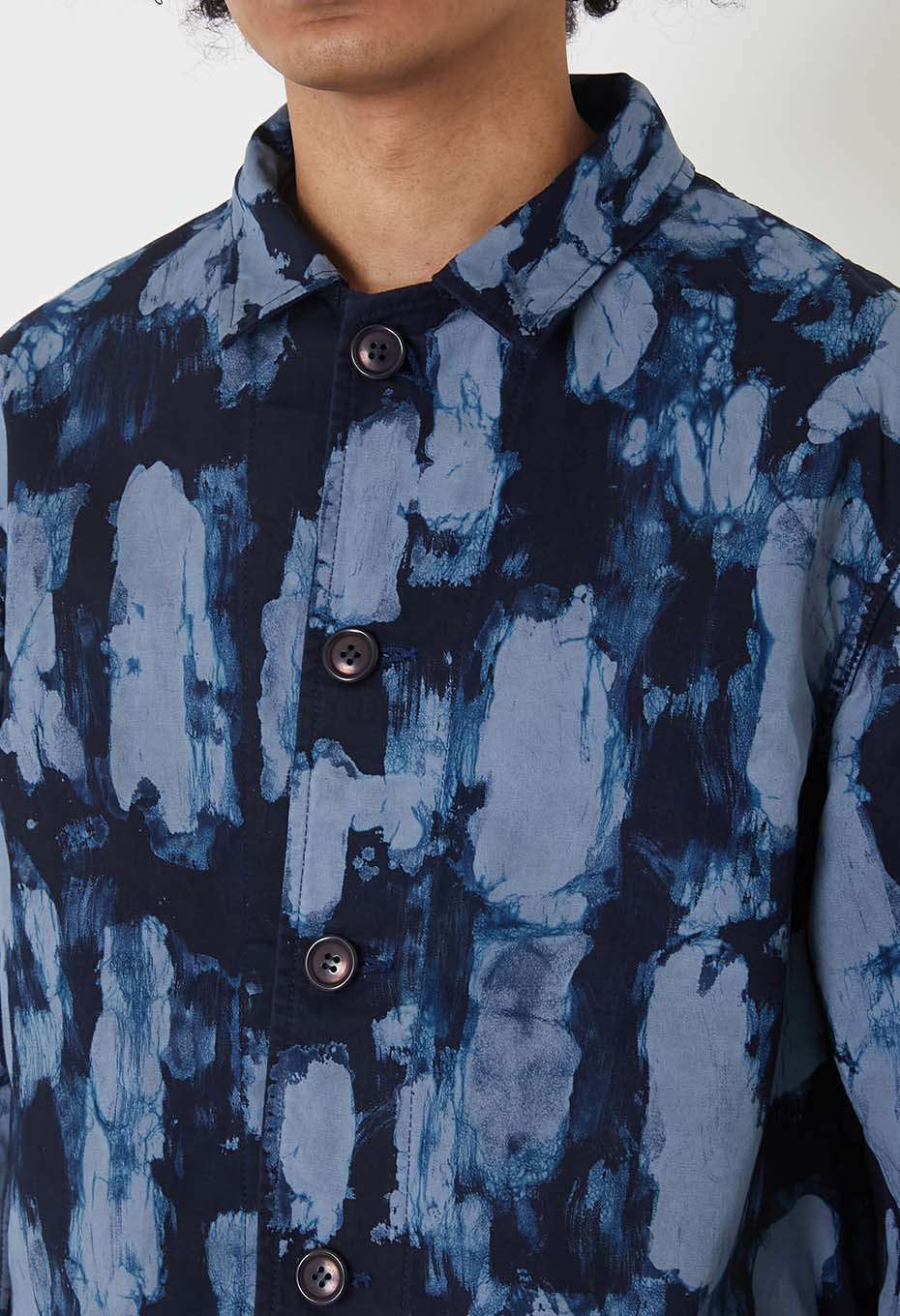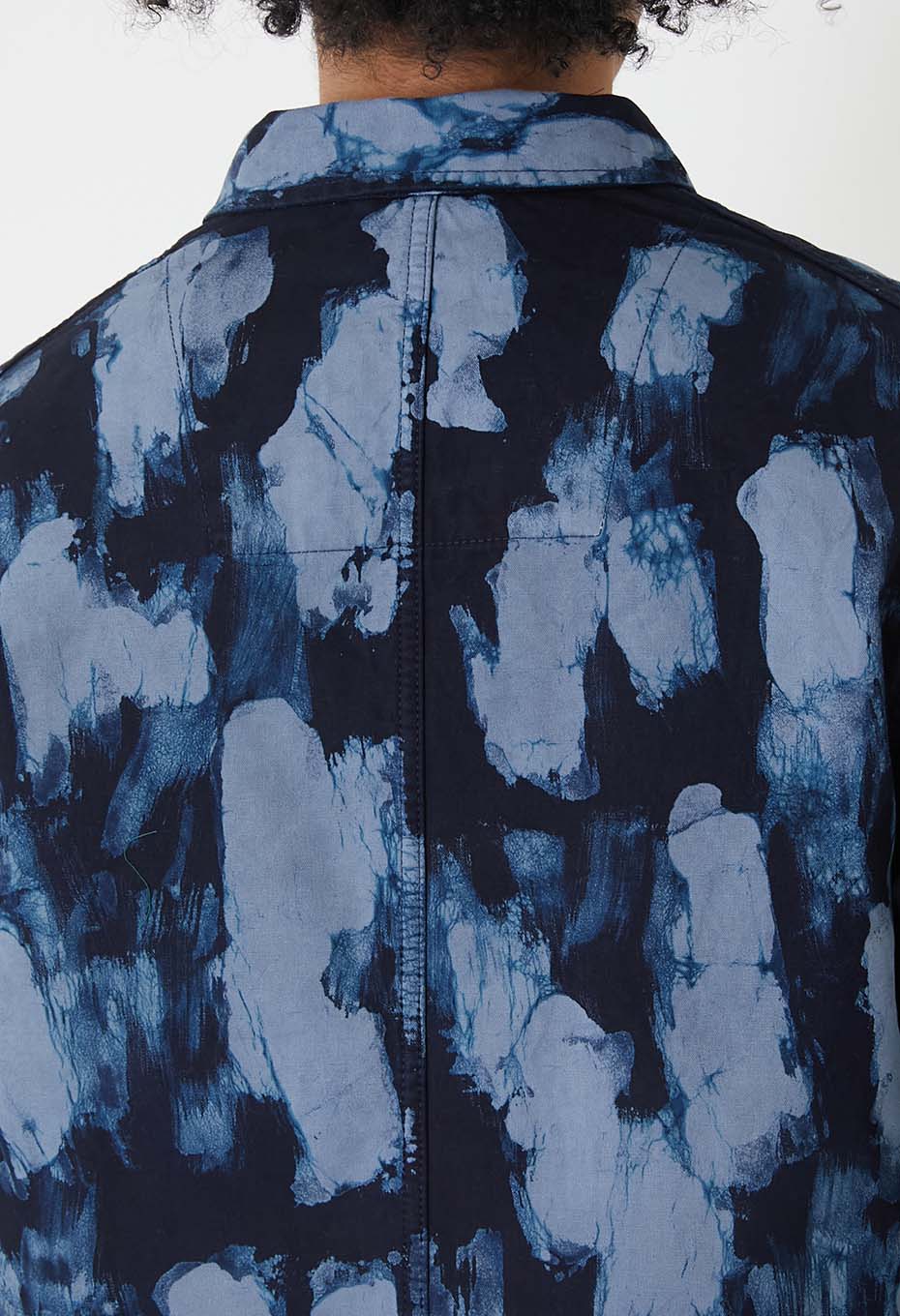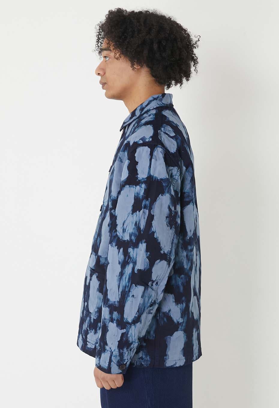 高密度なコットンキャンバスをベースに、一枚一枚ろうけつ絞りを施しています。蝋を筆で塗り柄を作り、その上から絞り染めを施したのち、蝋を溶かし落とすという長い工程を踏む技法です。職人さんの手作業による、昔ながらの手仕事が表情豊かな素材に仕上げています。