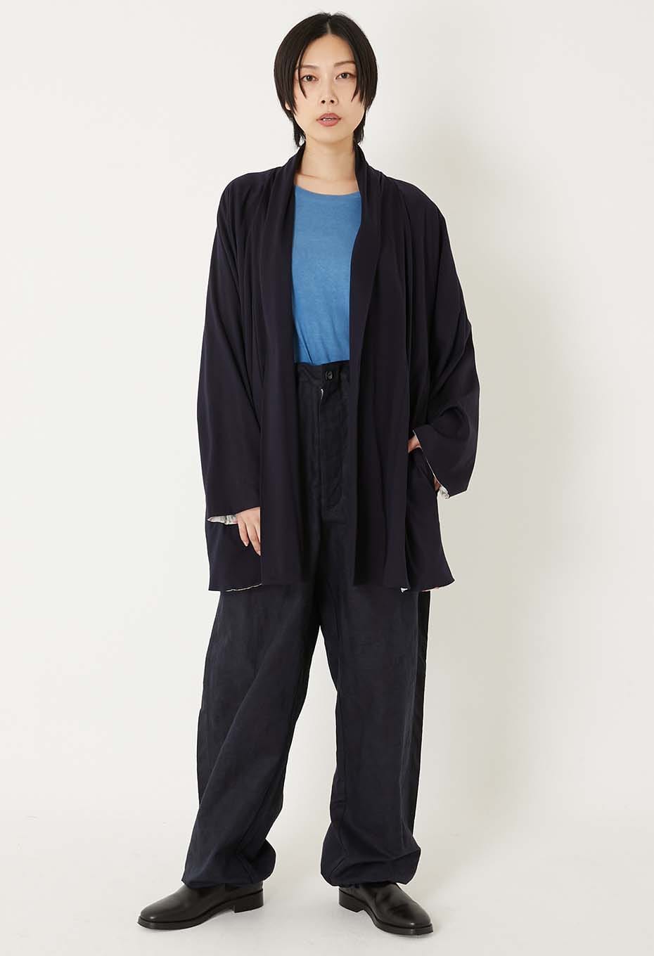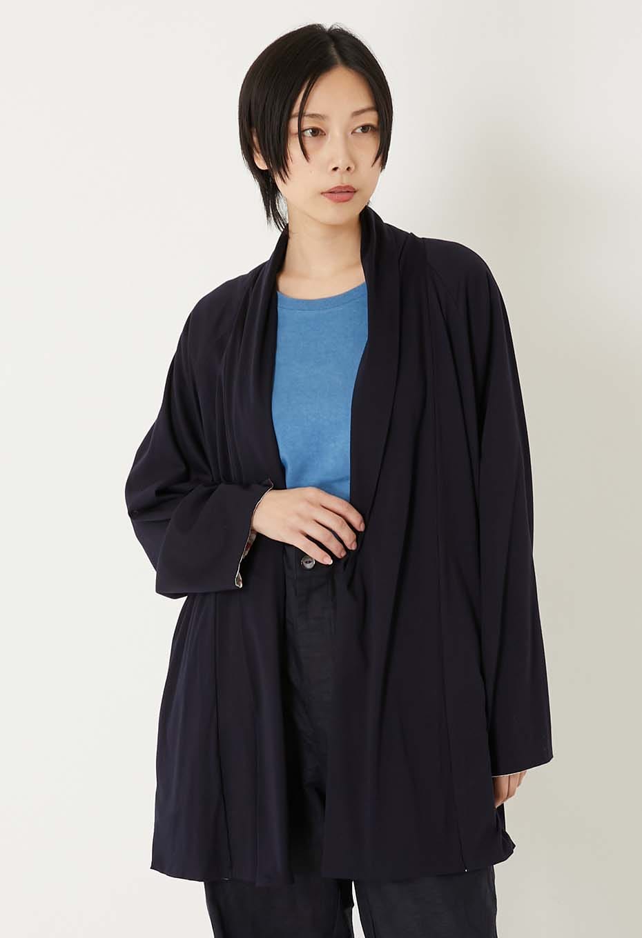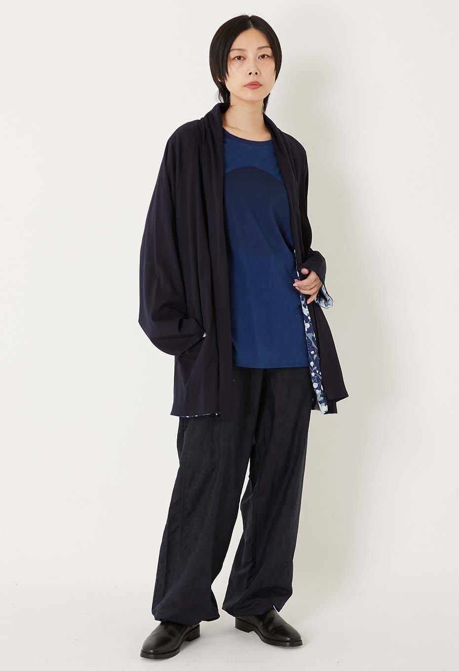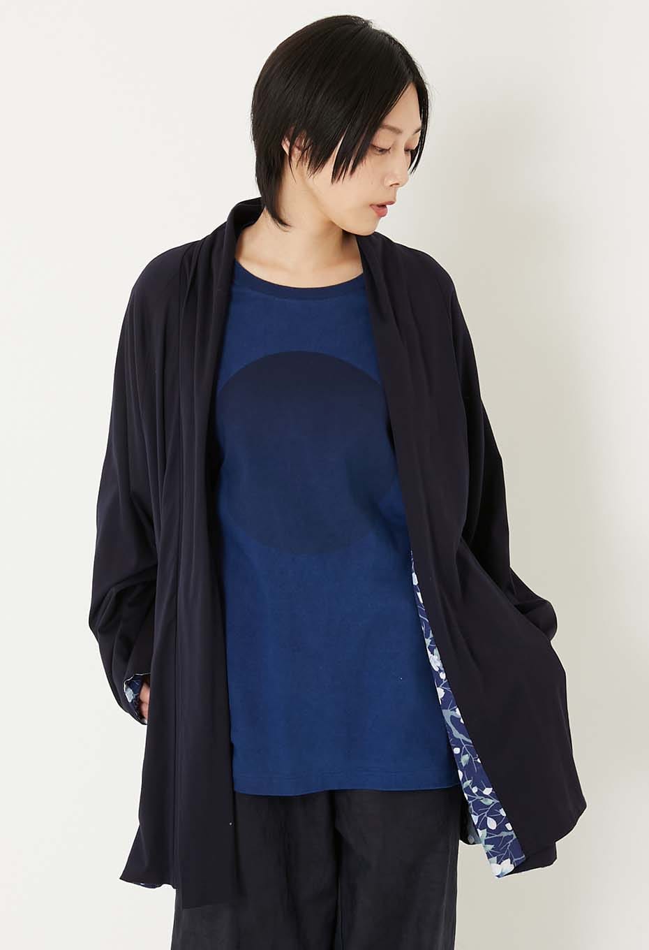 表面と裏面の二つの素材を袖口と裾で突合せで仕立て、ちらっと無地からプリントがのぞくところは、着物の”ふき”と呼ばれる部分をイメージしています。ラグランスリーブにすることで肩のラインに柔らかい素材が優しくフィットしきれいなラインがでます。デイリーにさらりと羽織るカジュアルな着こなしから、きれいなコーディネートまで幅広く着用できます。