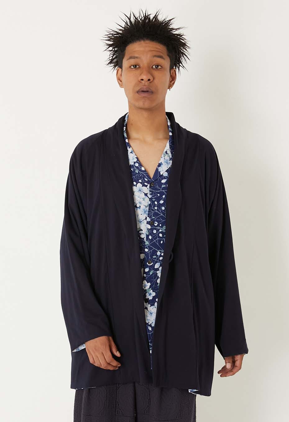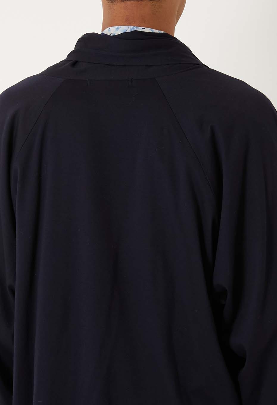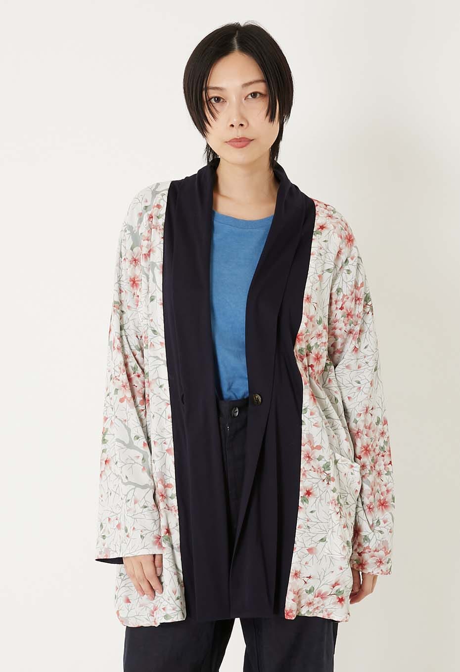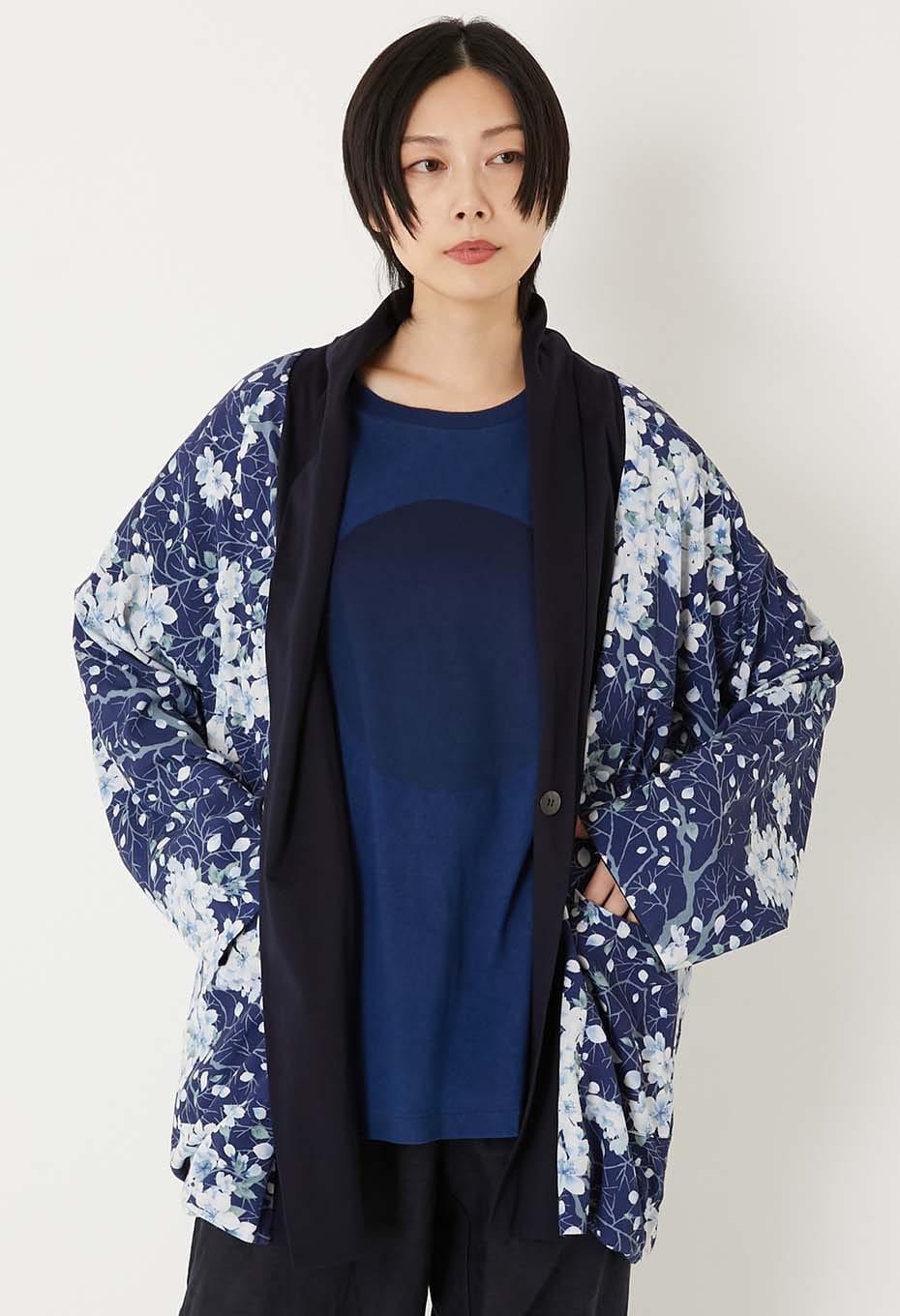 表面と裏面の二つの素材を袖口と裾で突合せで仕立て、ちらっと無地からプリントがのぞくところは、着物の”ふき”と呼ばれる部分をイメージしています。ラグランスリーブにすることで肩のラインに柔らかい素材が優しくフィットしきれいなラインがでます。デイリーにさらりと羽織るカジュアルな着こなしから、きれいなコーディネートまで幅広く着用できます。