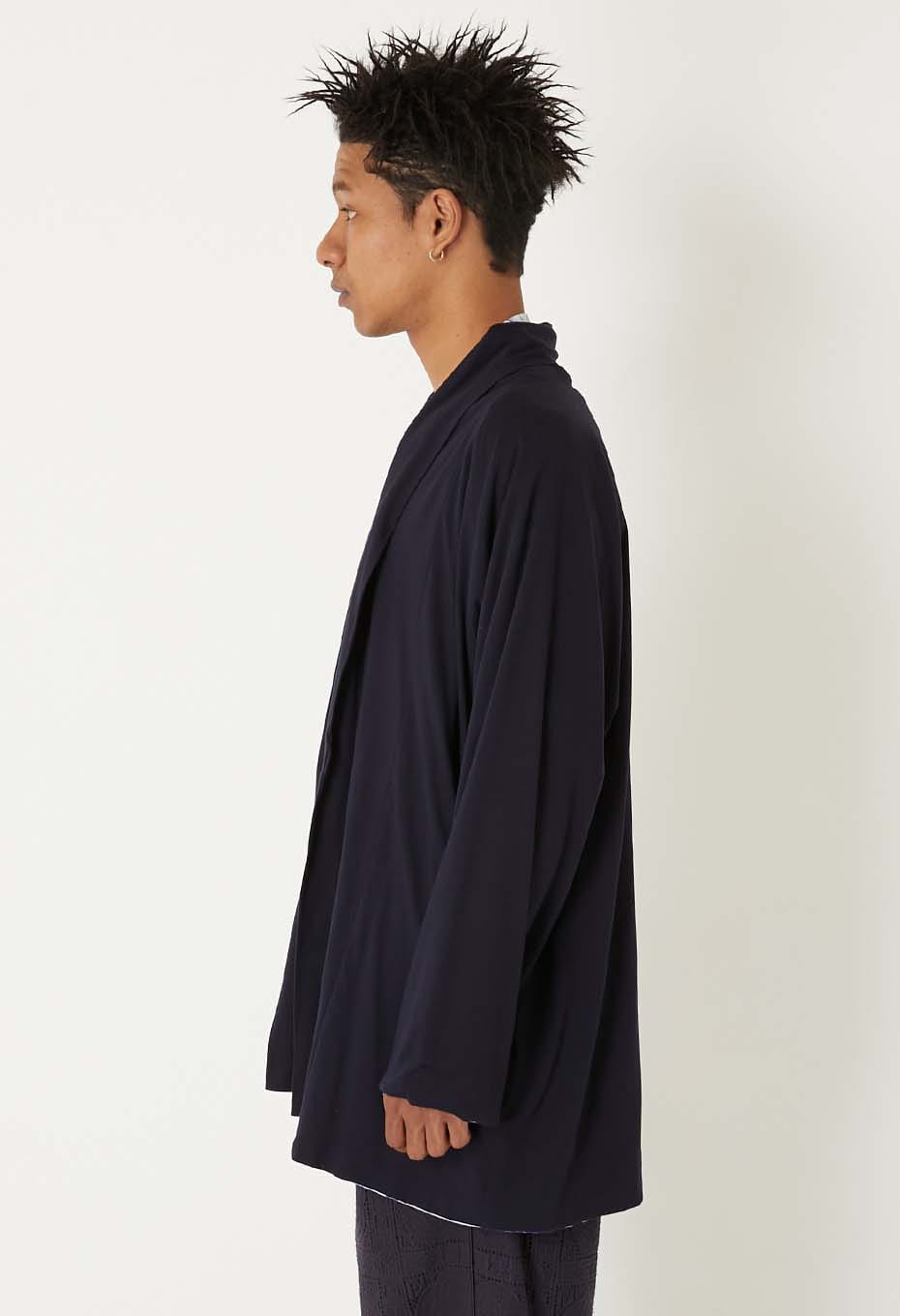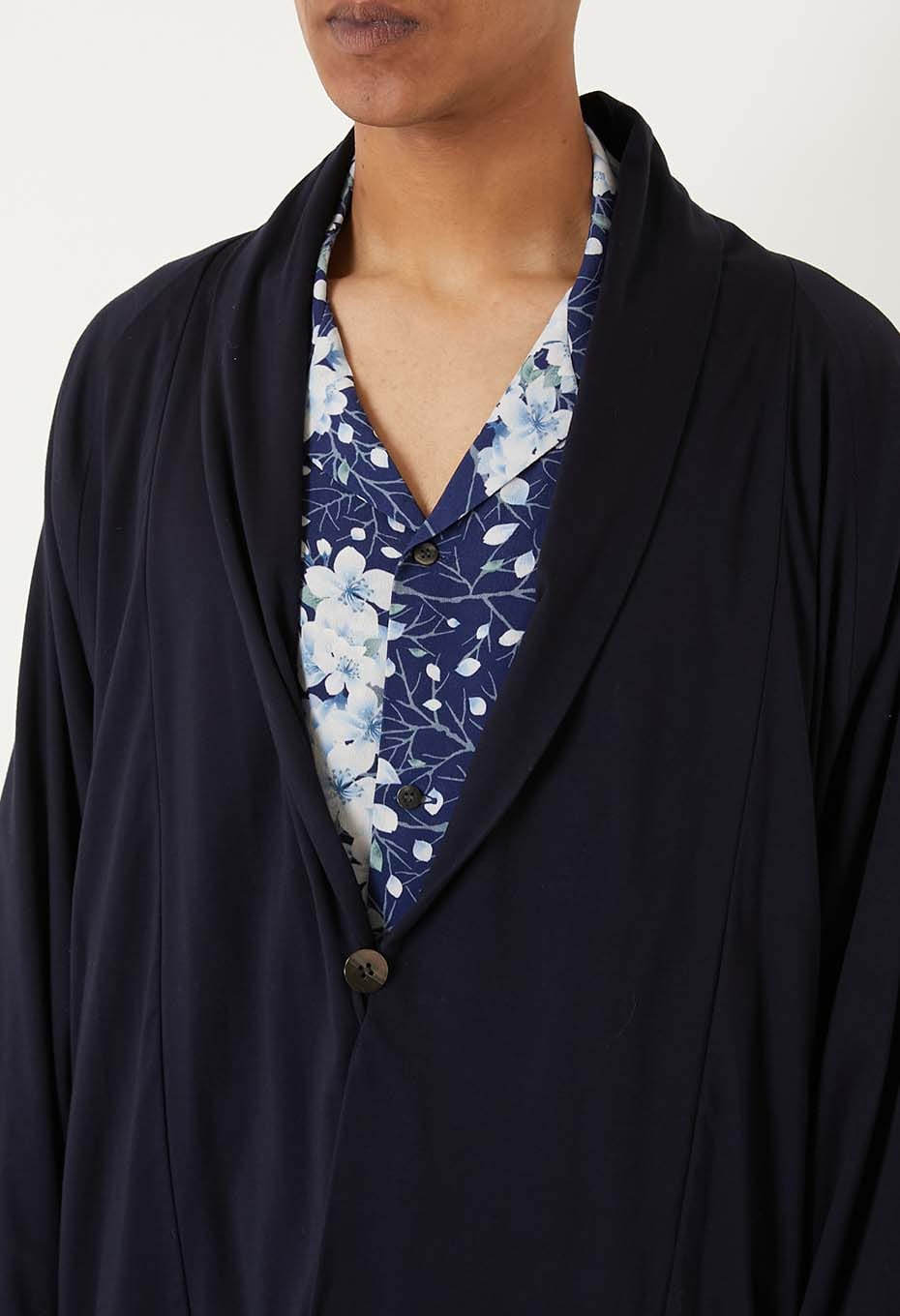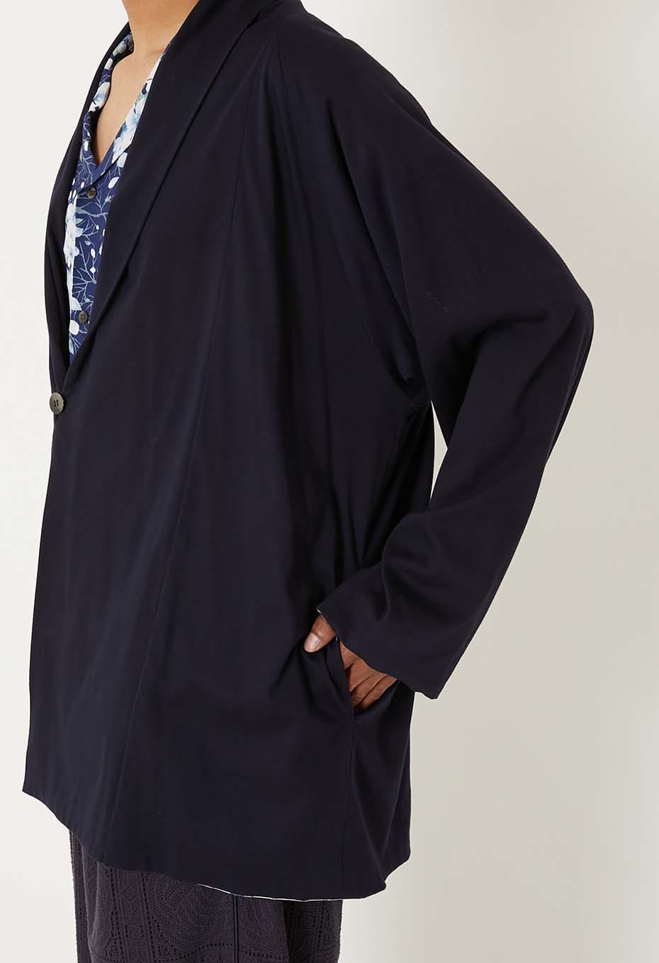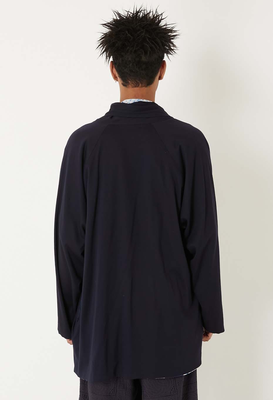 表面と裏面の二つの素材を袖口と裾で突合せで仕立て、ちらっと無地からプリントがのぞくところは、着物の”ふき”と呼ばれる部分をイメージしています。ラグランスリーブにすることで肩のラインに柔らかい素材が優しくフィットしきれいなラインがでます。デイリーにさらりと羽織るカジュアルな着こなしから、きれいなコーディネートまで幅広く着用できます。