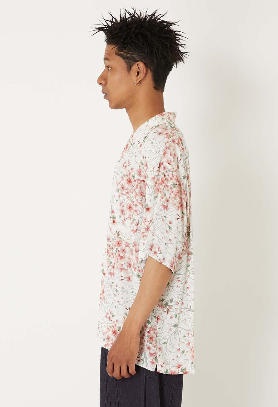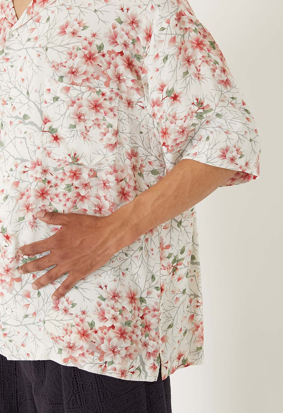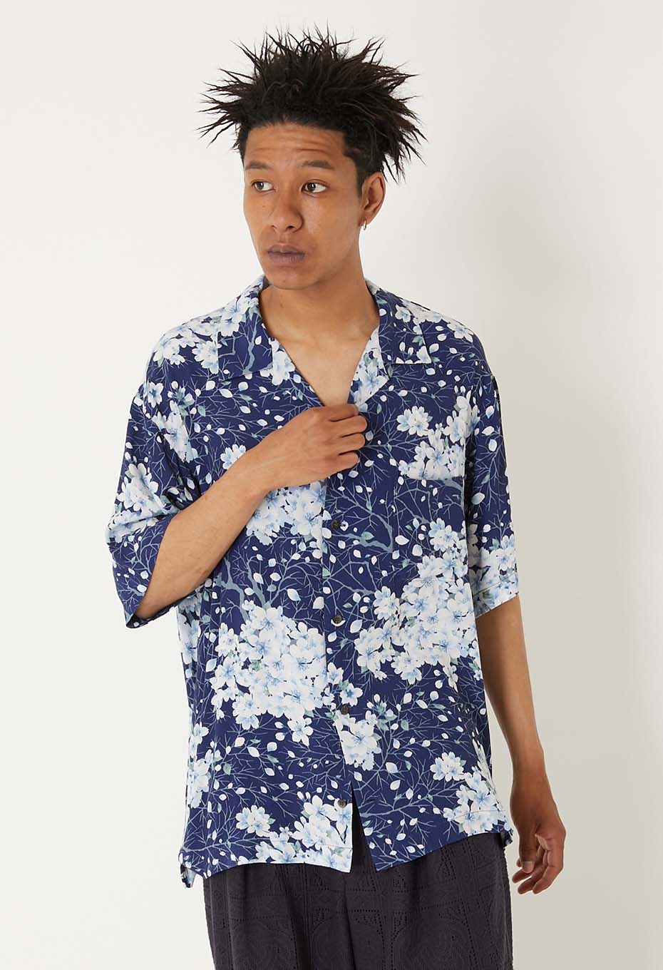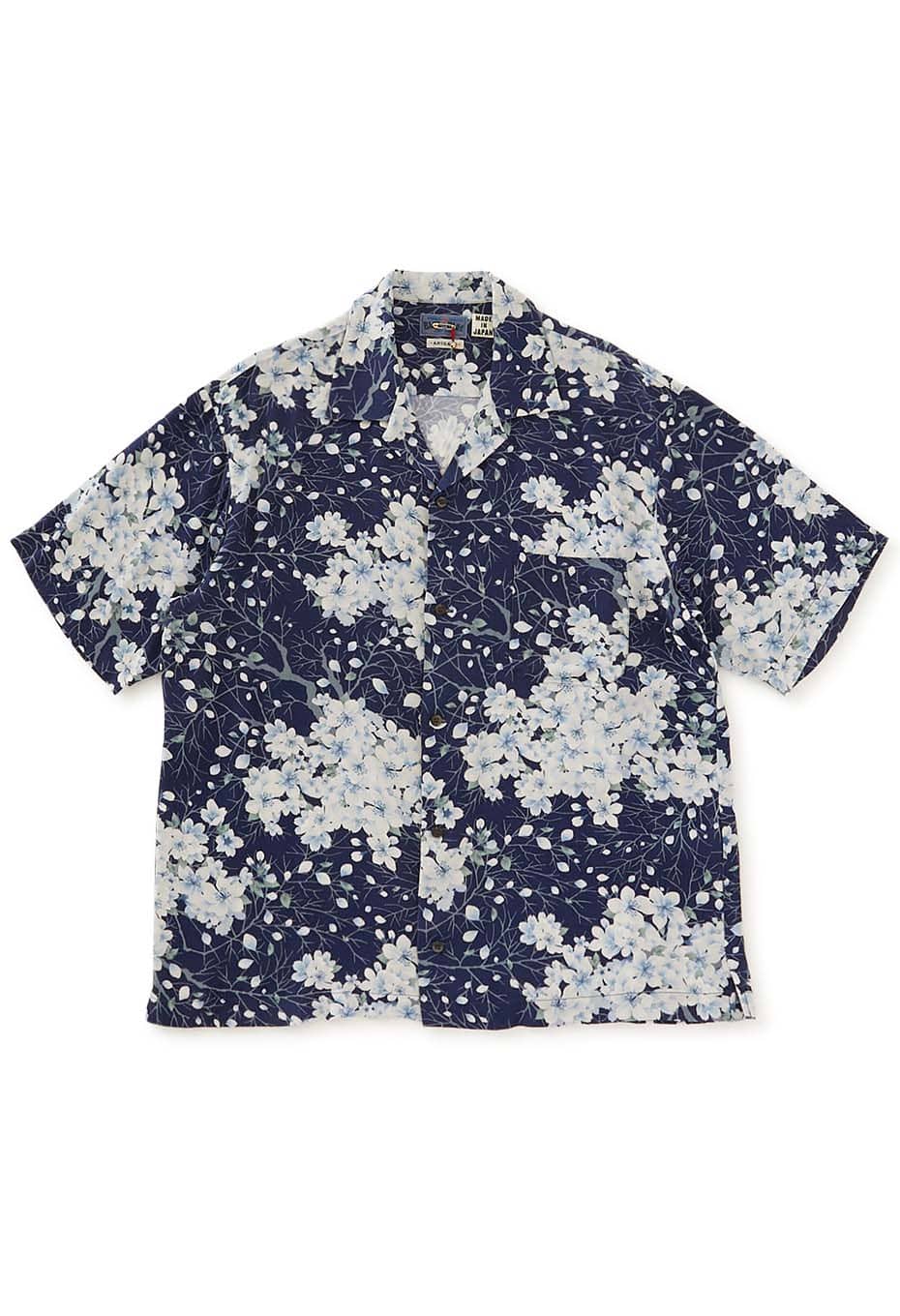柔らかで、風になびくようなゆとりを持ったアロハスタイルの開襟シャツです。BLUE BLUE JAPANの花びら舞うサクラカザ柄を楽しんでいただきたいです。
