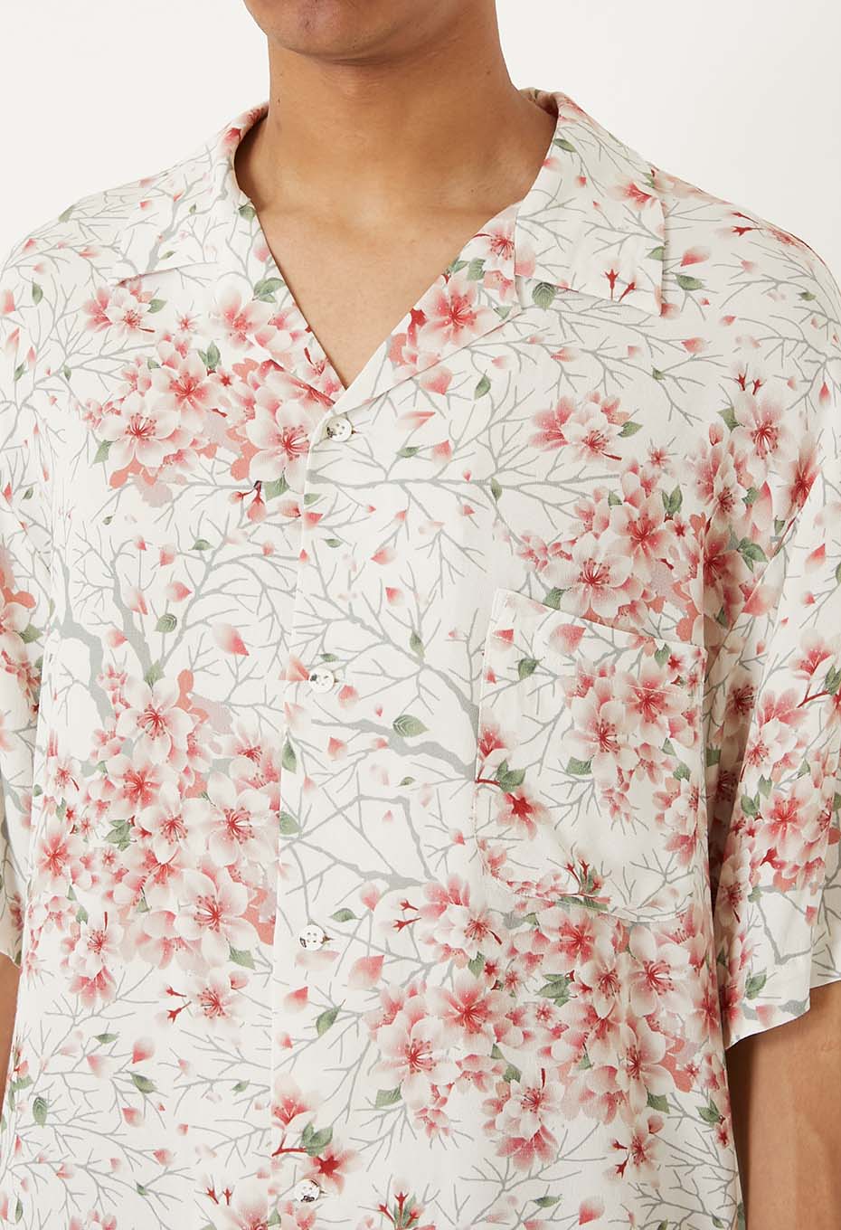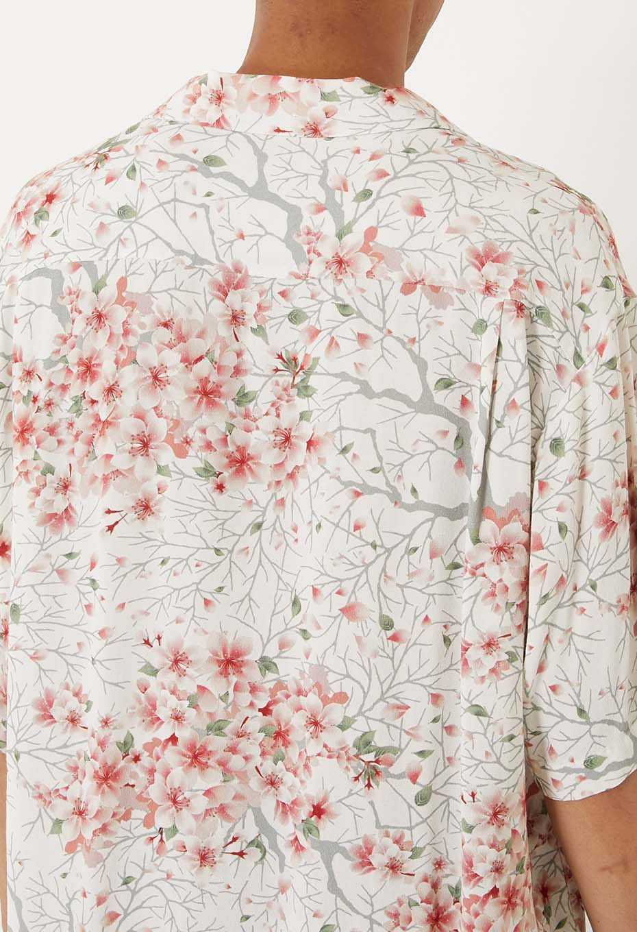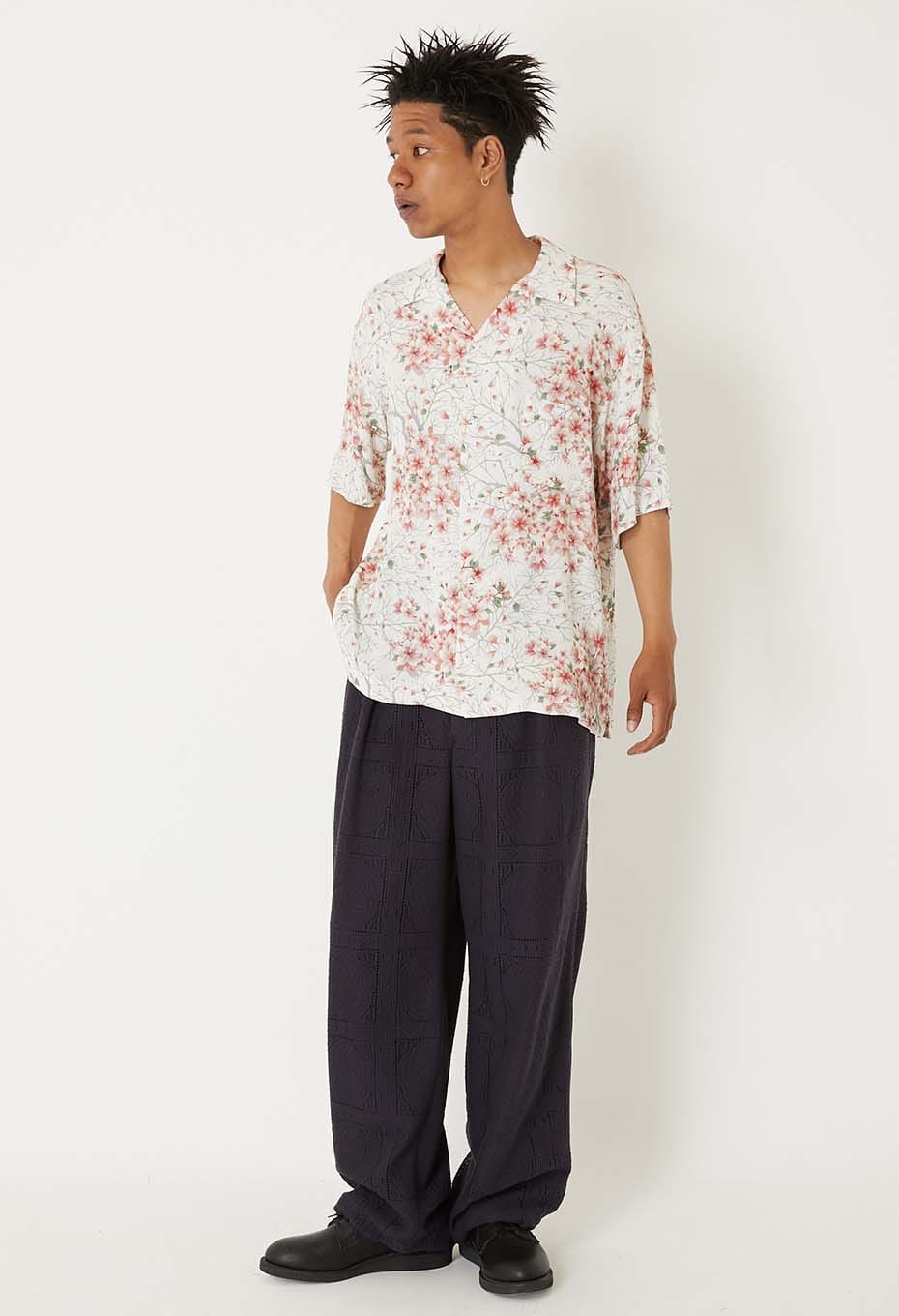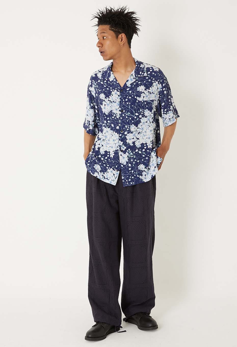 柔らかで、風になびくようなゆとりを持ったアロハスタイルの開襟シャツです。BLUE BLUE JAPANの花びら舞うサクラカザ柄を楽しんでいただきたいです。