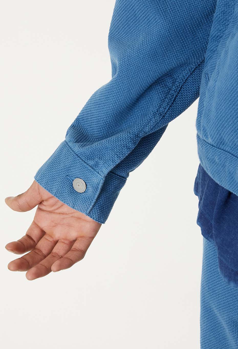 サシコのタテ糸とヨコ糸に異番手の糸を用いることで、表情のある生地感にしています。ナチュラルな素材を活かし、職人さんの手作業で染めを施した一着です。
