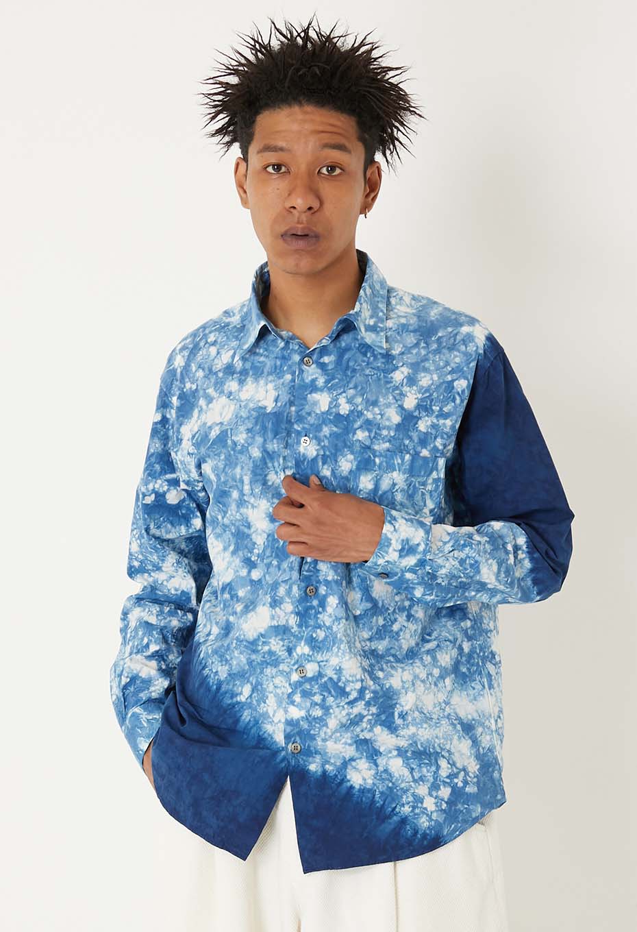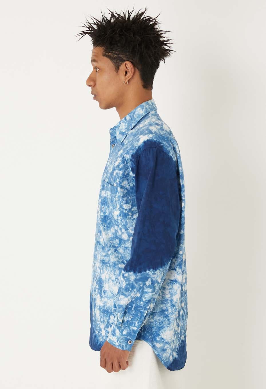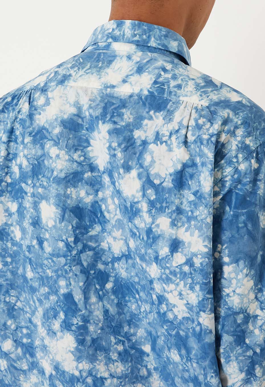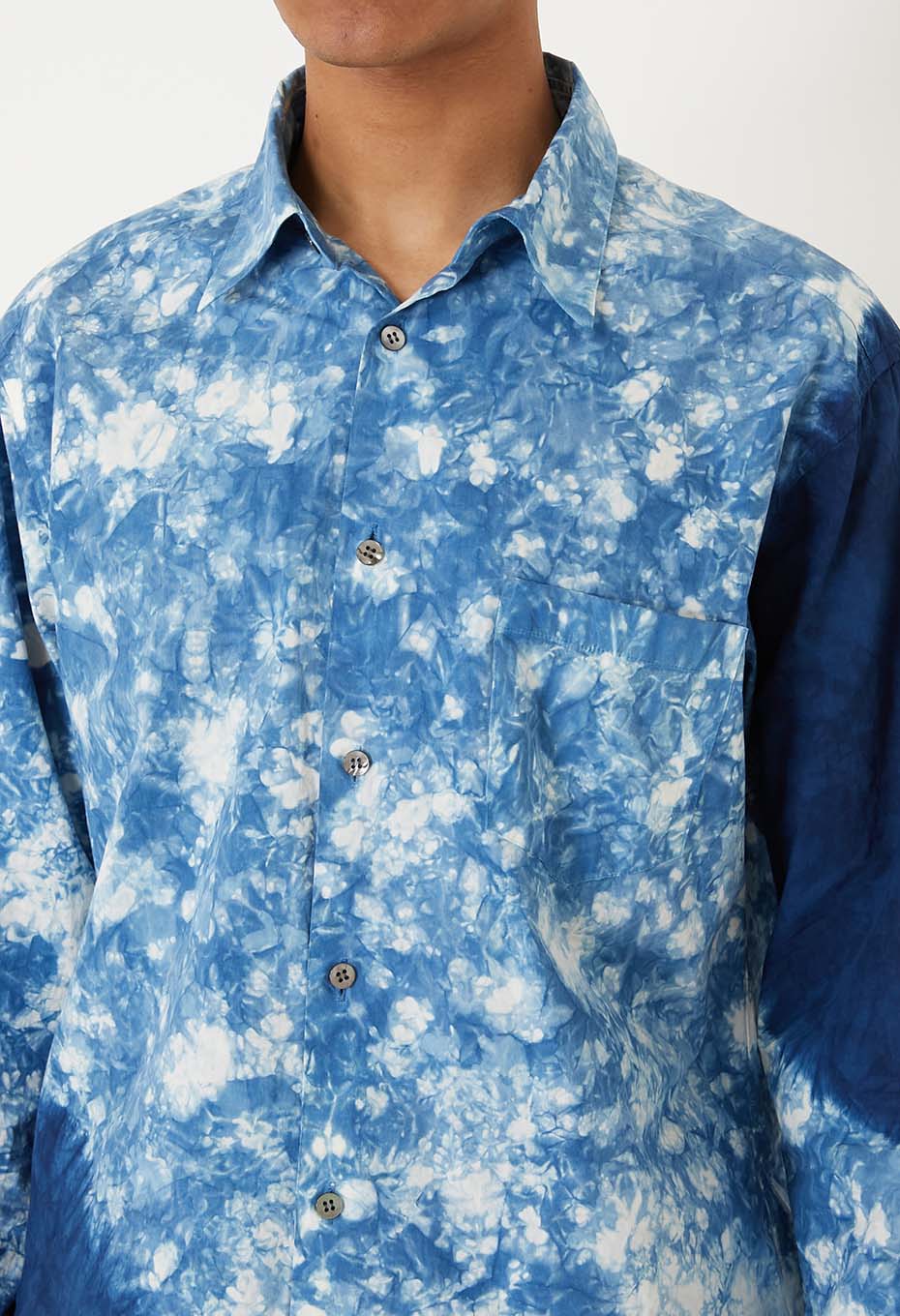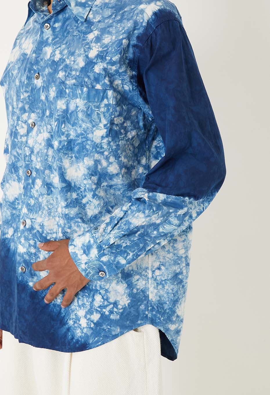 出来上がったシャツを職人さんの手で一枚一枚ムラクモ絞りという手法で藍染絞りをしていきます。すっきりした衿の形にゆとりのあるシルエットで一枚でも様になります。襟元はタイドアップしても収まりがよく、ジャケットを羽織りドレスアップにもおすすめ。もちろんカジュアルにも合わせやすく、幅広い着こなしが楽しめるフォルムです。本藍絞りの一枚一枚の表情を楽しんでいただけます。