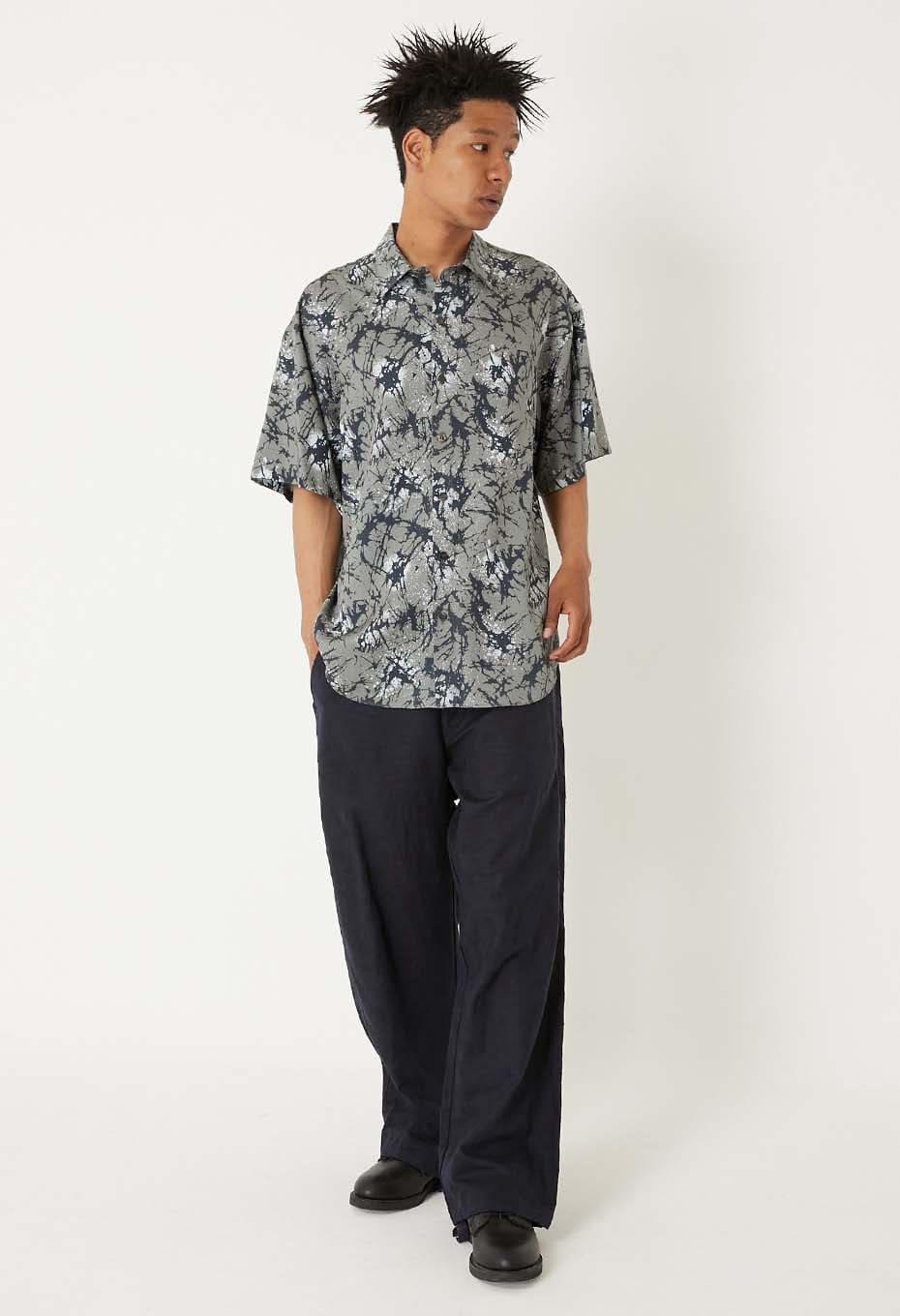 コットンとリネンの交織平織りで、洗いざらしの様なドライなタッチと柔らかさが特徴です。顔料プリントでガラスパターンを表現しており、柄の表情が陰影の様に見える印象的な仕上がりとなっています。