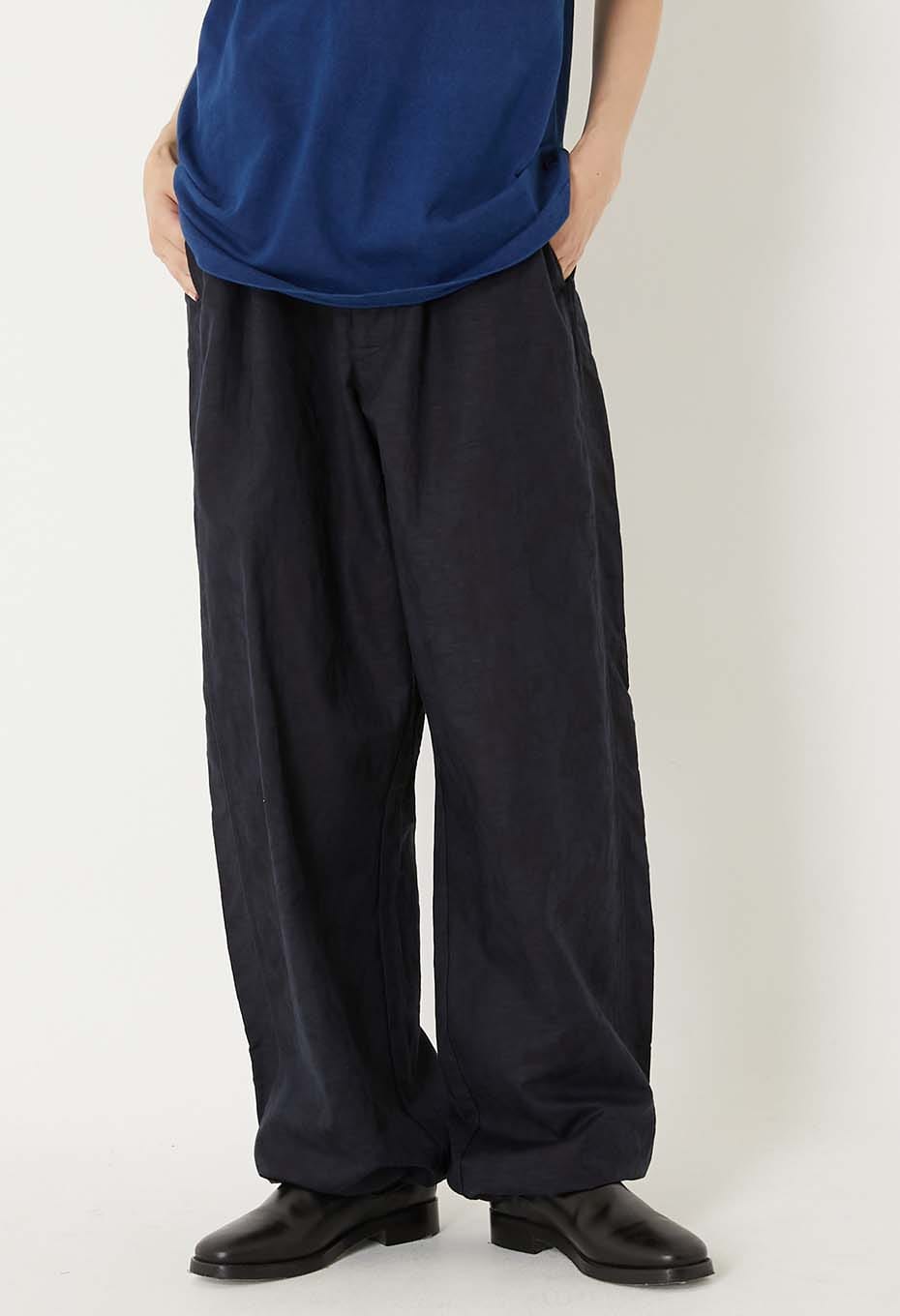 ウエストと裾にドローコードを配したドローパンツです。ゆったりとした着用感ときれいなシルエットが印象的です。