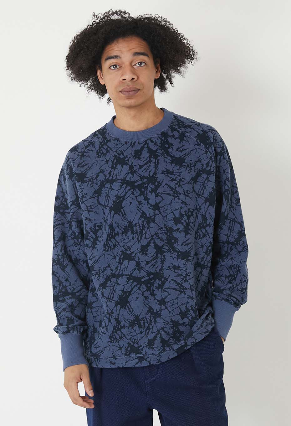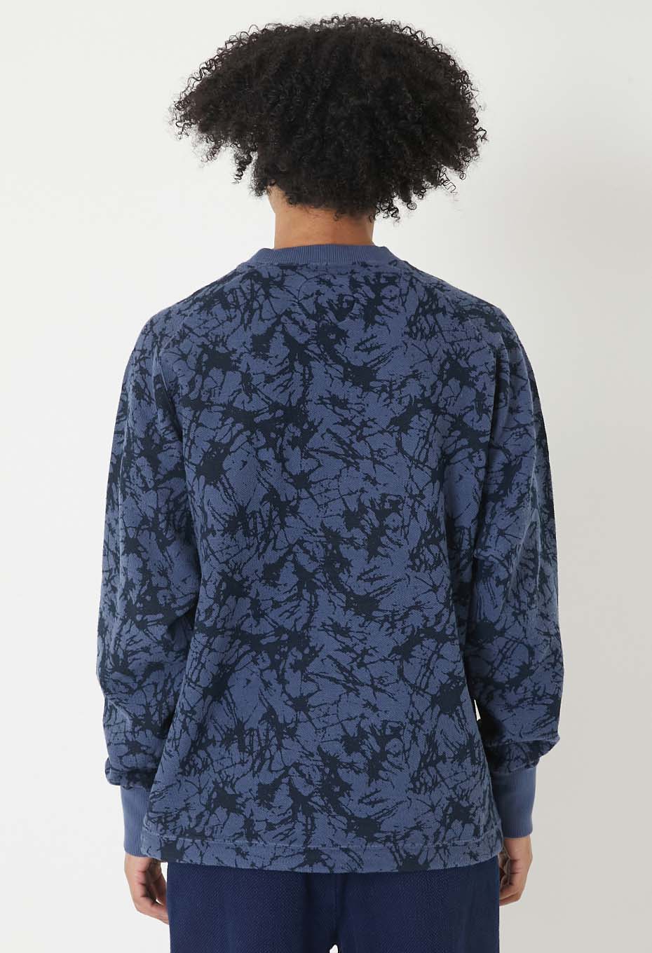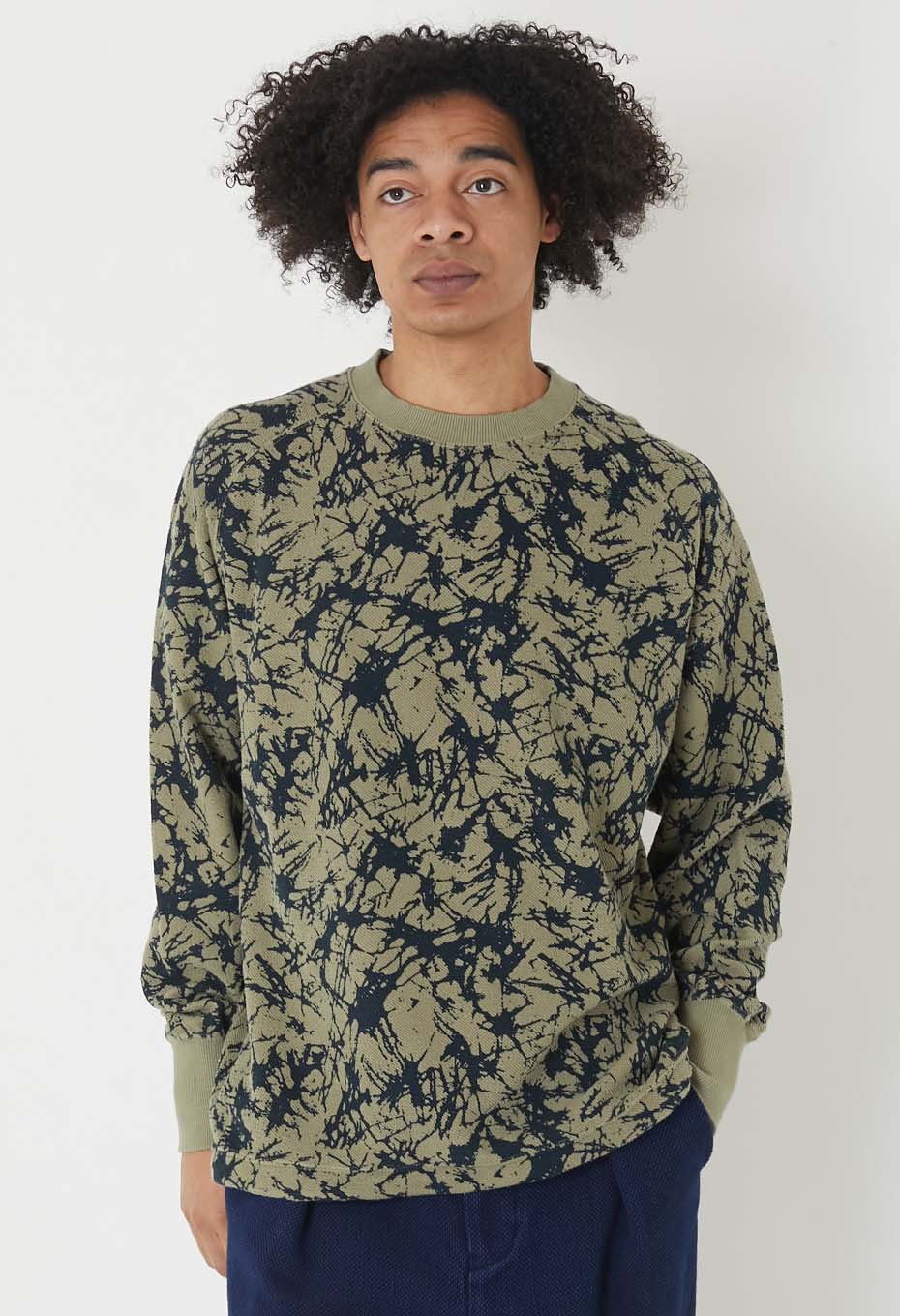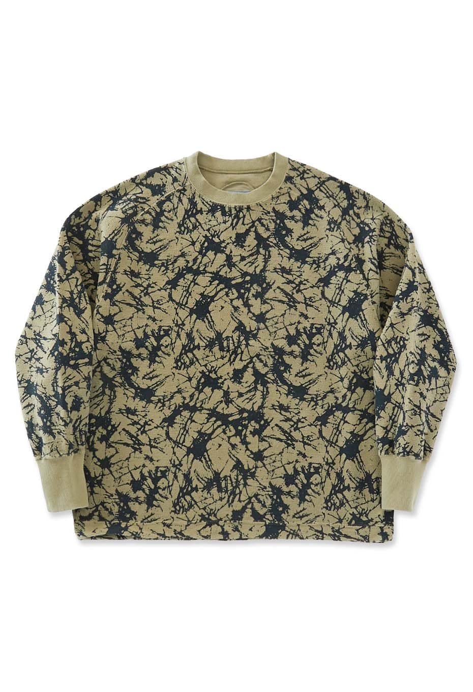 スウェット生地の裏ループ側に施したプリントの表情を活かしたシンプルなクルーネックプル。ラグランラインがポイントになりリラックスした着心地もお勧めです。裾にはドローコードディテールを用いています。