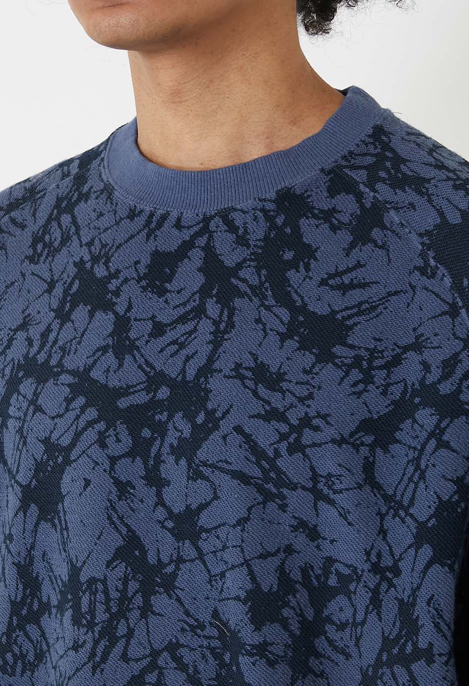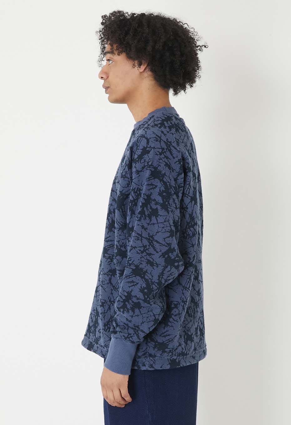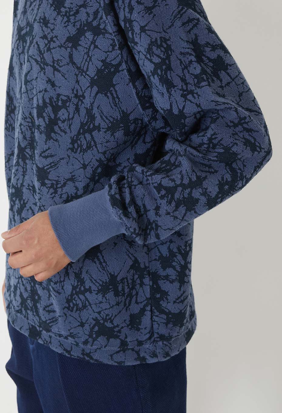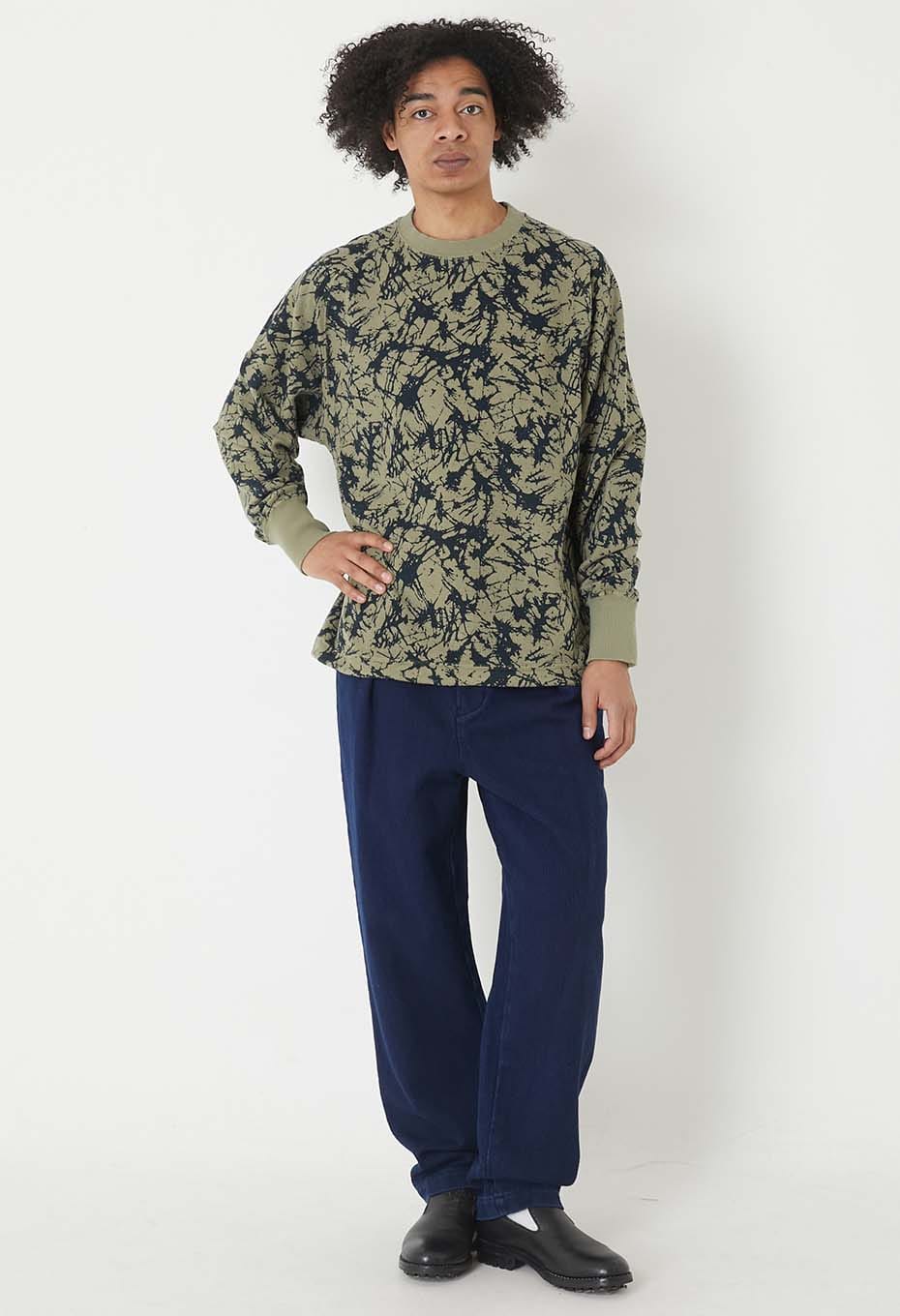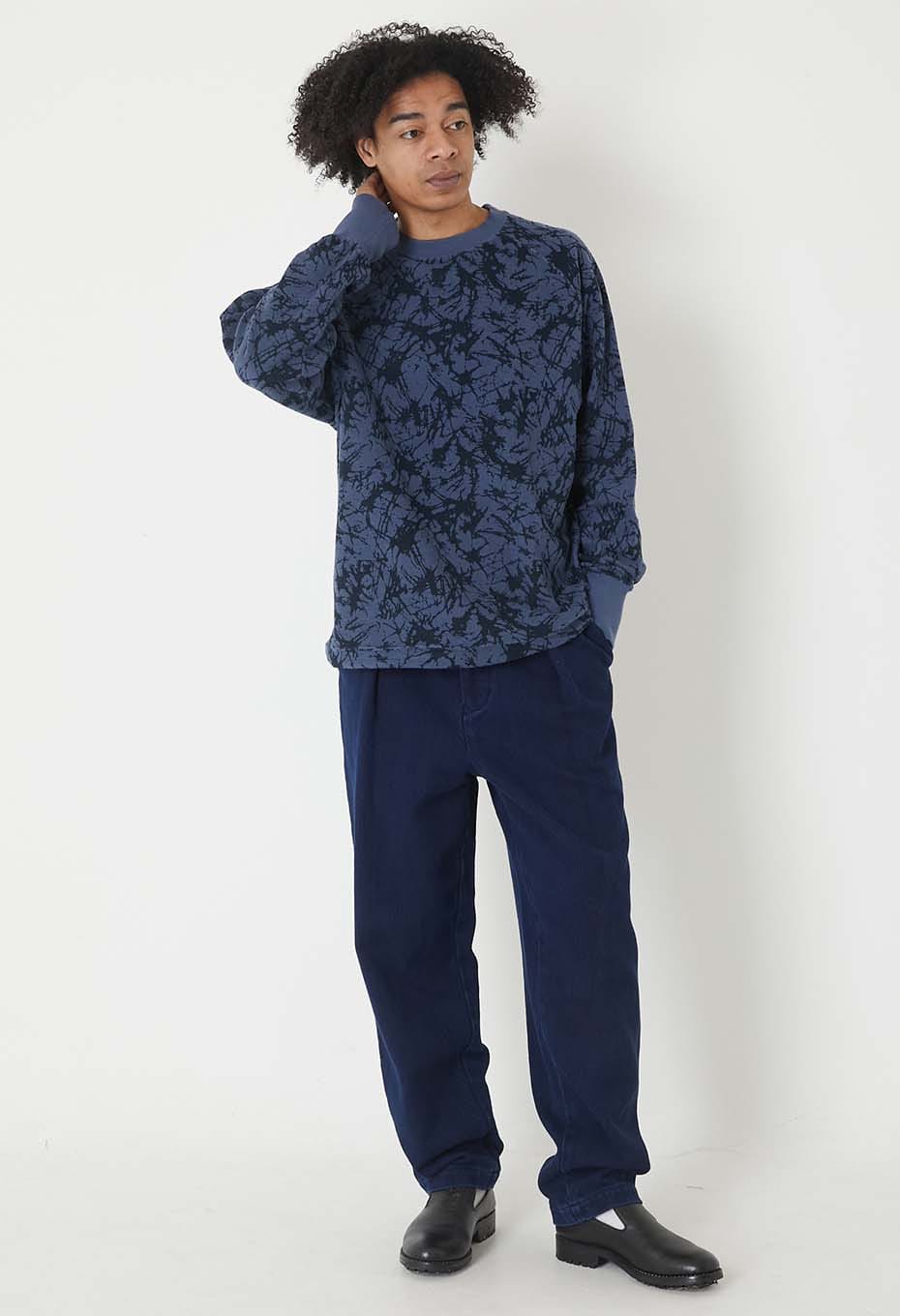 ソフトな質感と軽めの肉感が特徴のコットンスウエットです。この裏ループ面にガラスパターン柄を顔料プリントで施しました。洗いざらしのドライなタッチと着用面の柔らかな着心地がお勧めです。