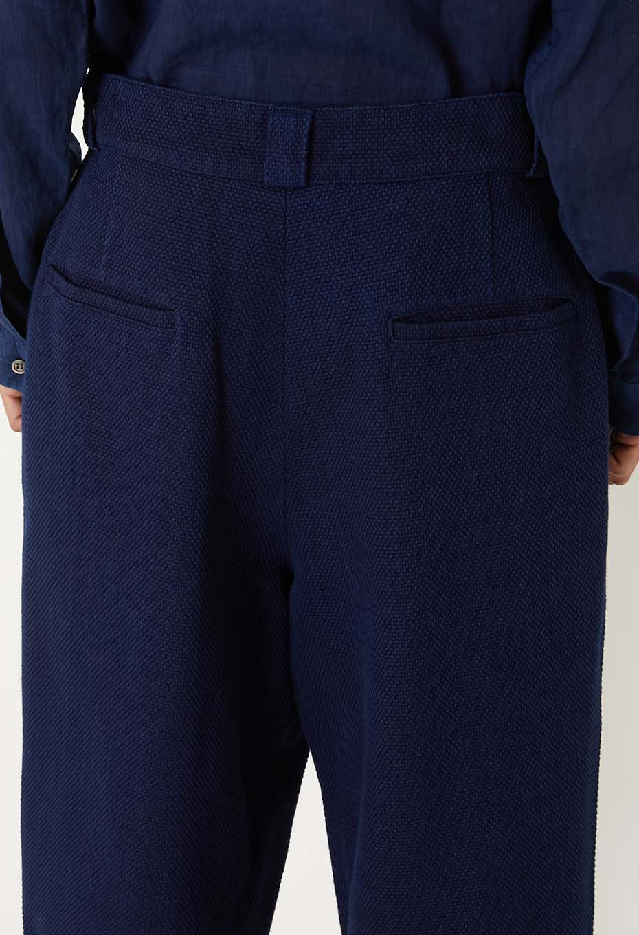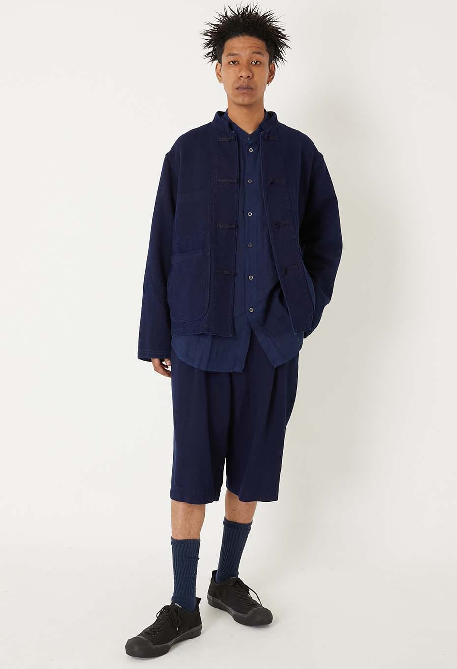カセ染めにした本藍の糸を使用しているため、うっすらと縦に走るムラが特徴です。ドビー織機で二重織にすることで、重たくならずに厚みと弾力が出ます。糸を染色する工程、生地を織り上げ仕上げをする工程のそれぞれで、高温の熱を使わずに乾燥させることで、柔らかくふくらみのある風合いに仕上げています。BLUE BLUE JAPANの代表的素材として使い続けているホンアイサシコ。さらに軽い着心地を追求し、従来の生地よりヨコ糸の打ち込み本数を調整して作ったサシコ素材です。