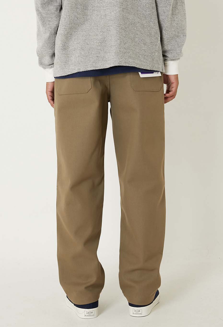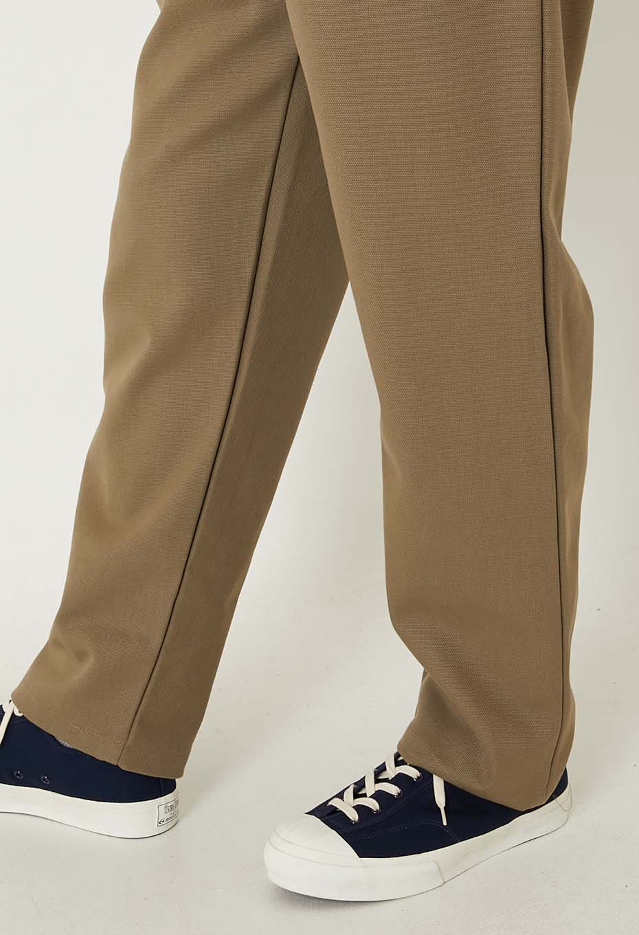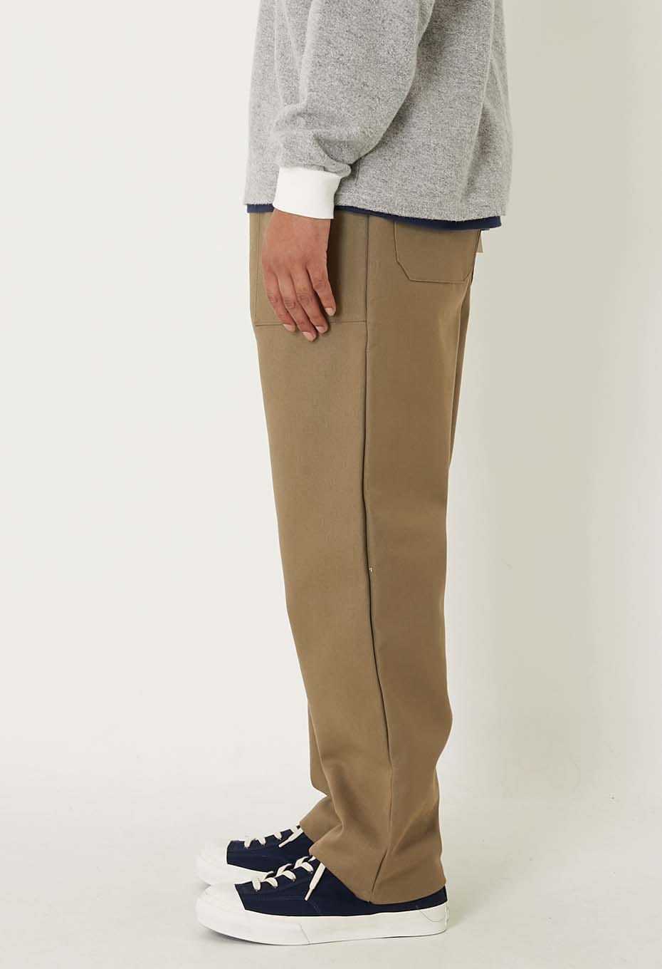 ポリエステルとコットンの混紡生地を使用しており、ハリとコシのあるタフな仕上がりとなっています。ワークウェアらしい耐久性、幅広いコーディネートにマッチするデザイン性を併せ持つベーシックな一本。仕入後に自社でウエスト調節が可能な紐を施し、イージーかつしっかりとしたホールド感のある仕様にカスタムを加えています。