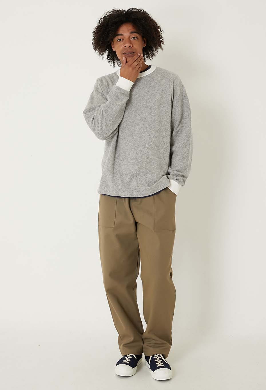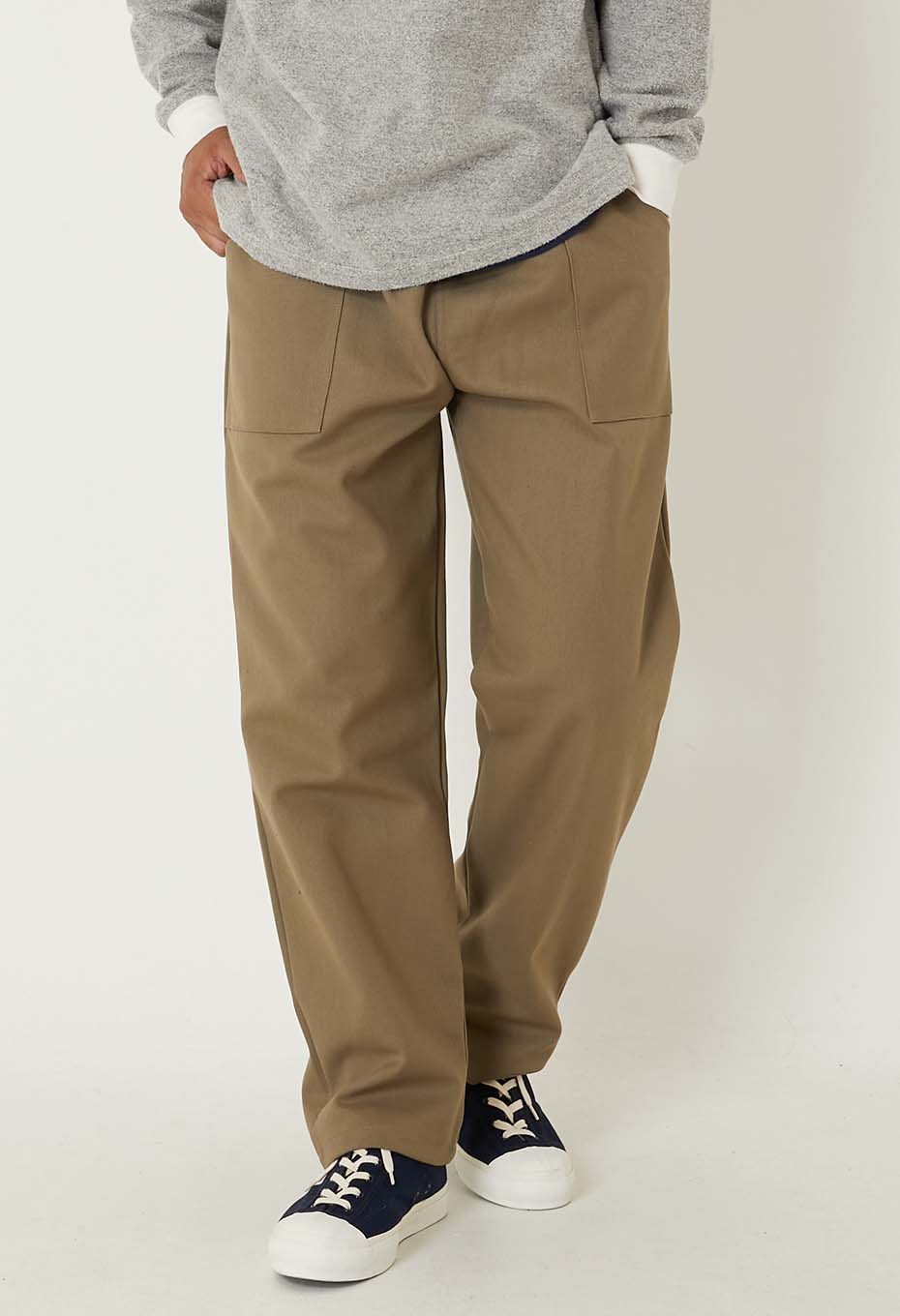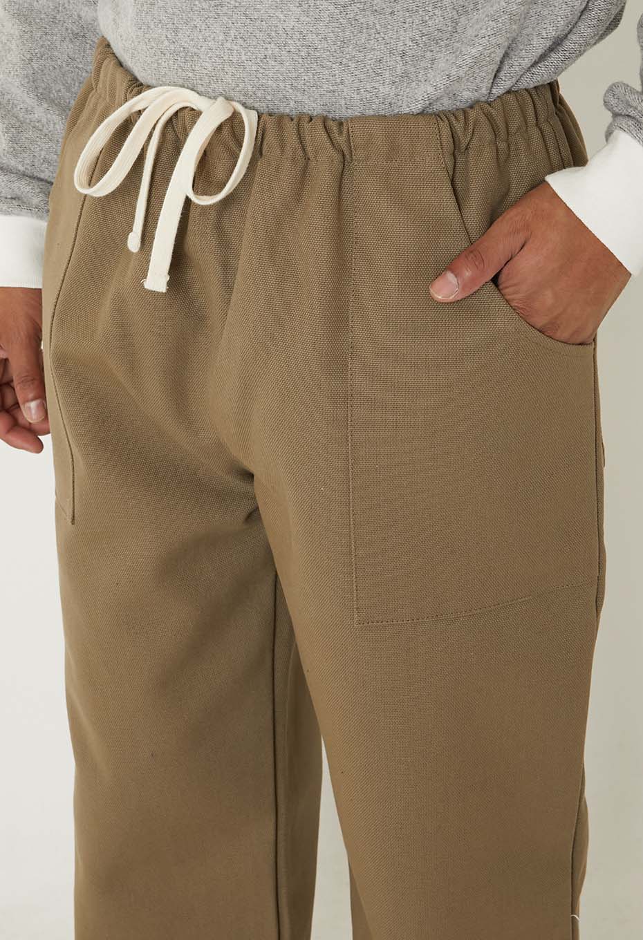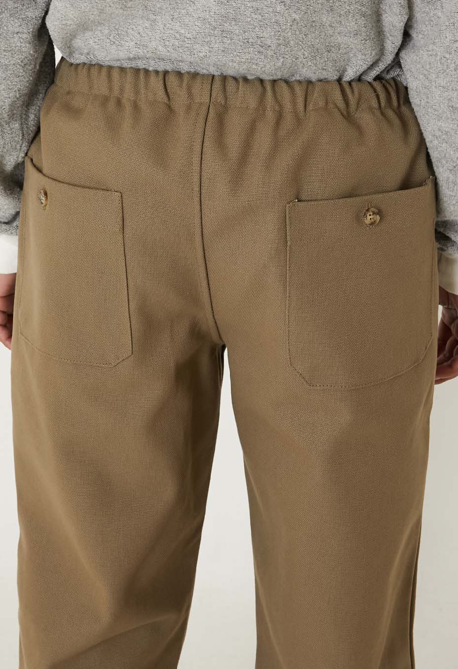 ポリエステルとコットンの混紡生地を使用しており、ハリとコシのあるタフな仕上がりとなっています。ワークウェアらしい耐久性、幅広いコーディネートにマッチするデザイン性を併せ持つベーシックな一本。仕入後に自社でウエスト調節が可能な紐を施し、イージーかつしっかりとしたホールド感のある仕様にカスタムを加えています。