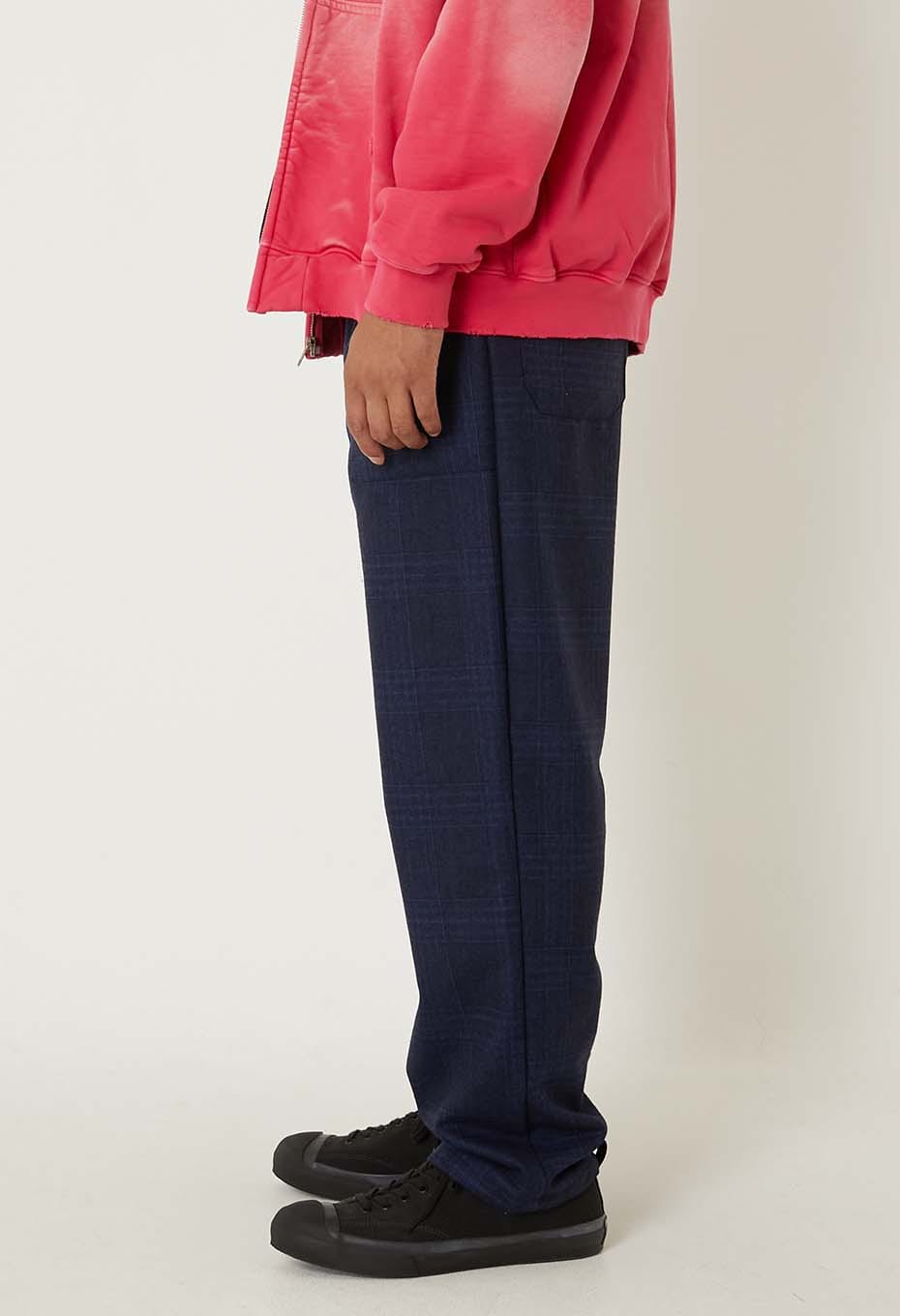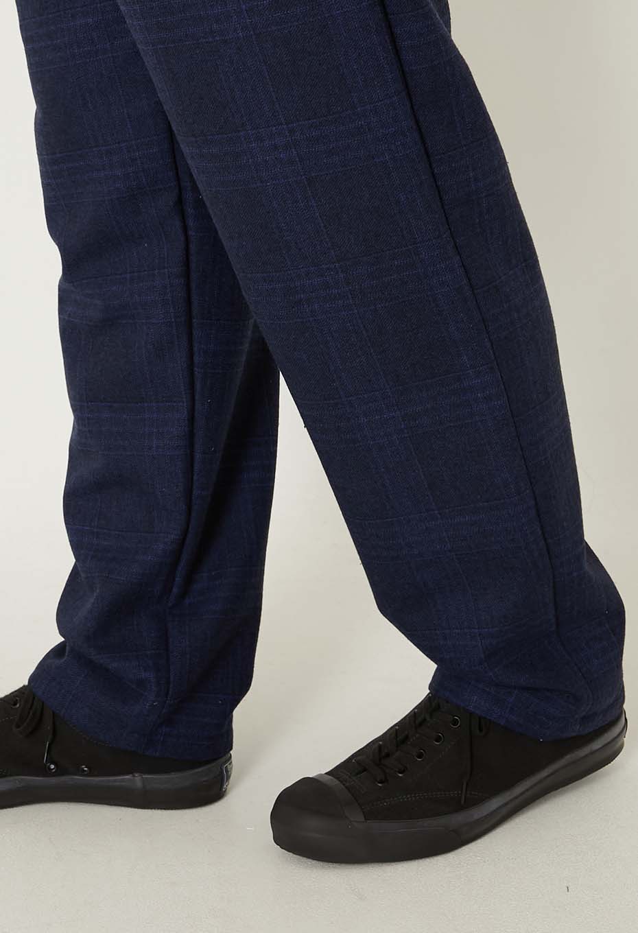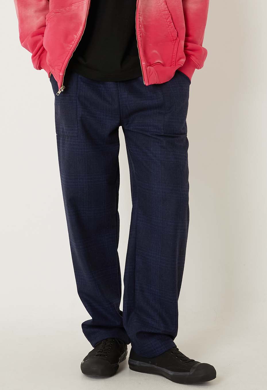 ポリエステルとウールの混紡生地にチェック柄を施し、マニッシュで上品な雰囲気を演出しています。ワークウェアらしい耐久性、シンプルさと上質さを兼ね備え、ビジネススタイルからカジュアルスタイルまで、幅広いシーンで活躍する一本です。仕入後に自社でウエスト調節が可能な紐を施し、イージーかつしっかりとしたホールド感のある仕様にカスタムを加えています。