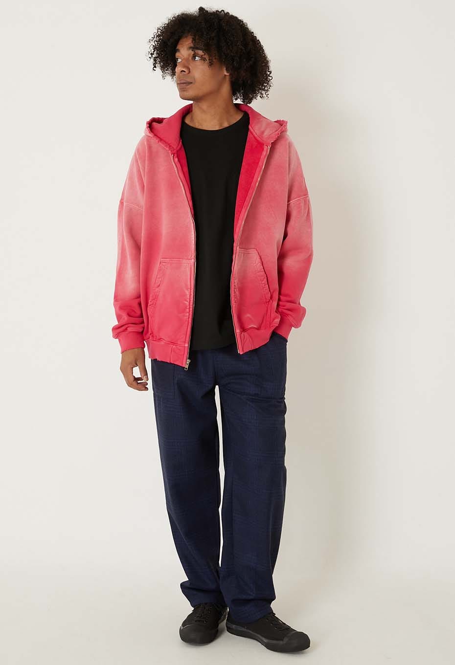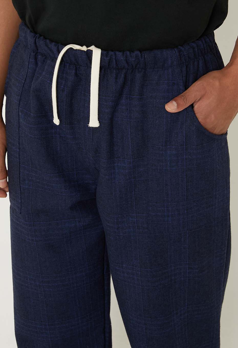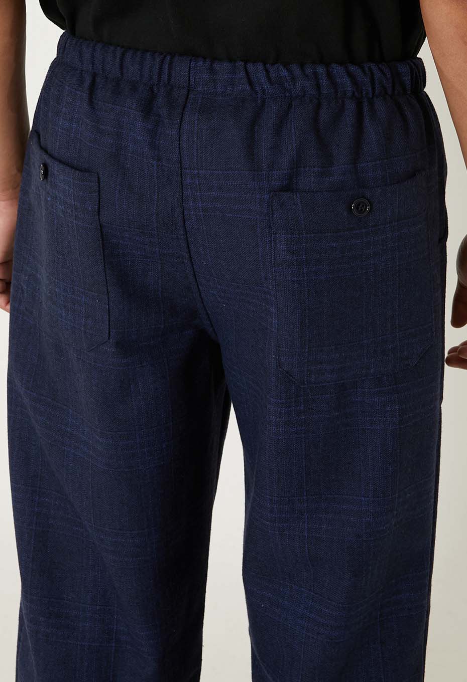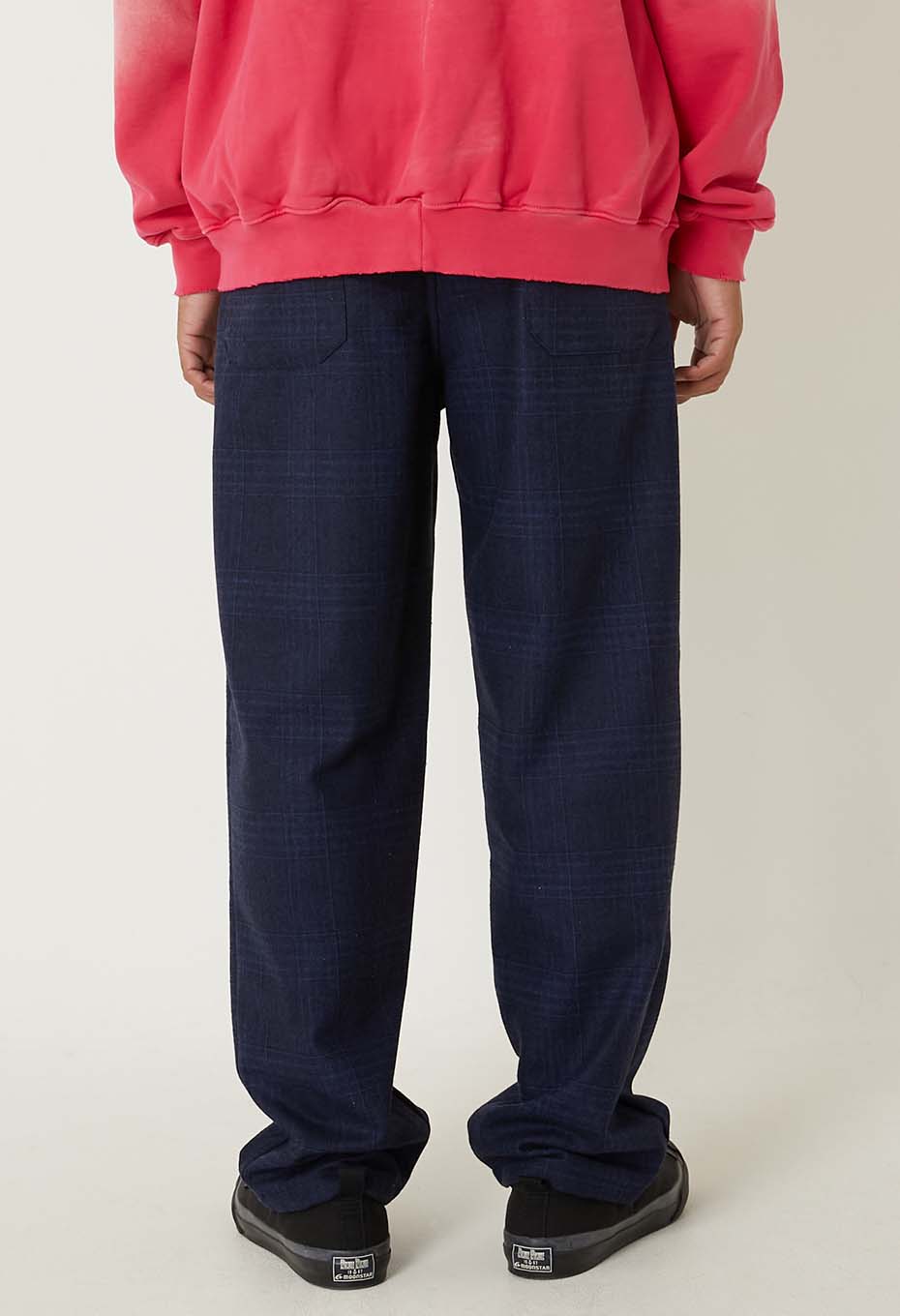 ポリエステルとウールの混紡生地にチェック柄を施し、マニッシュで上品な雰囲気を演出しています。ワークウェアらしい耐久性、シンプルさと上質さを兼ね備え、ビジネススタイルからカジュアルスタイルまで、幅広いシーンで活躍する一本です。仕入後に自社でウエスト調節が可能な紐を施し、イージーかつしっかりとしたホールド感のある仕様にカスタムを加えています。