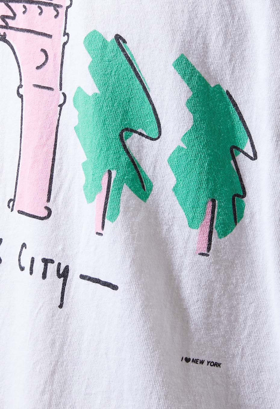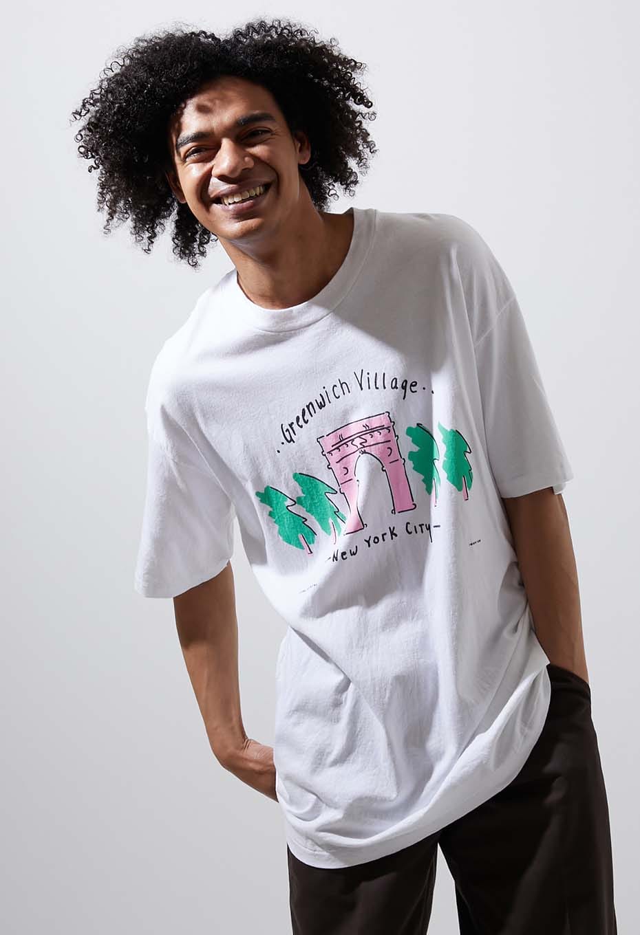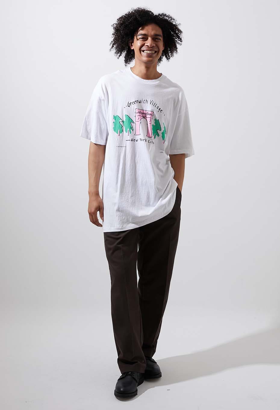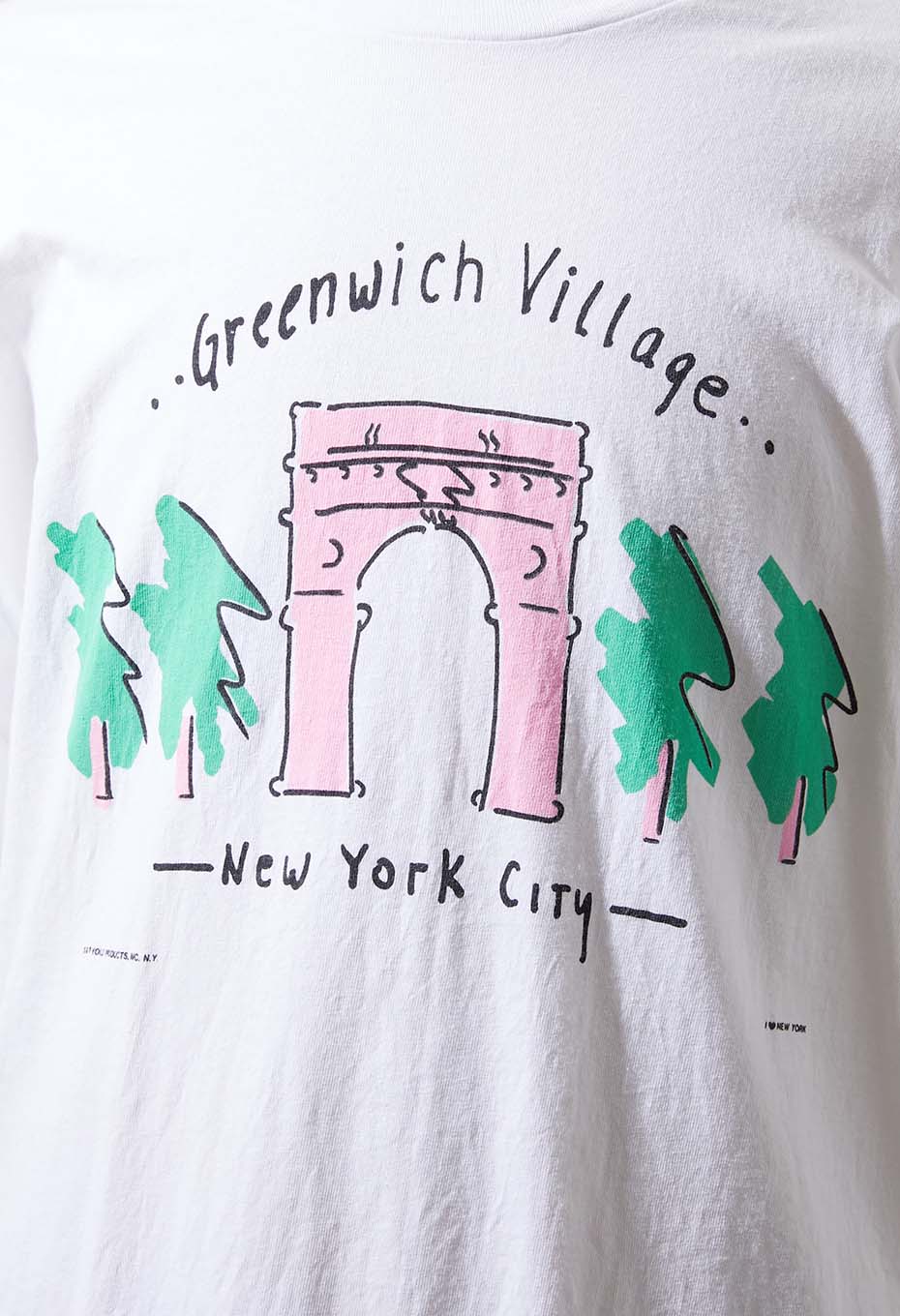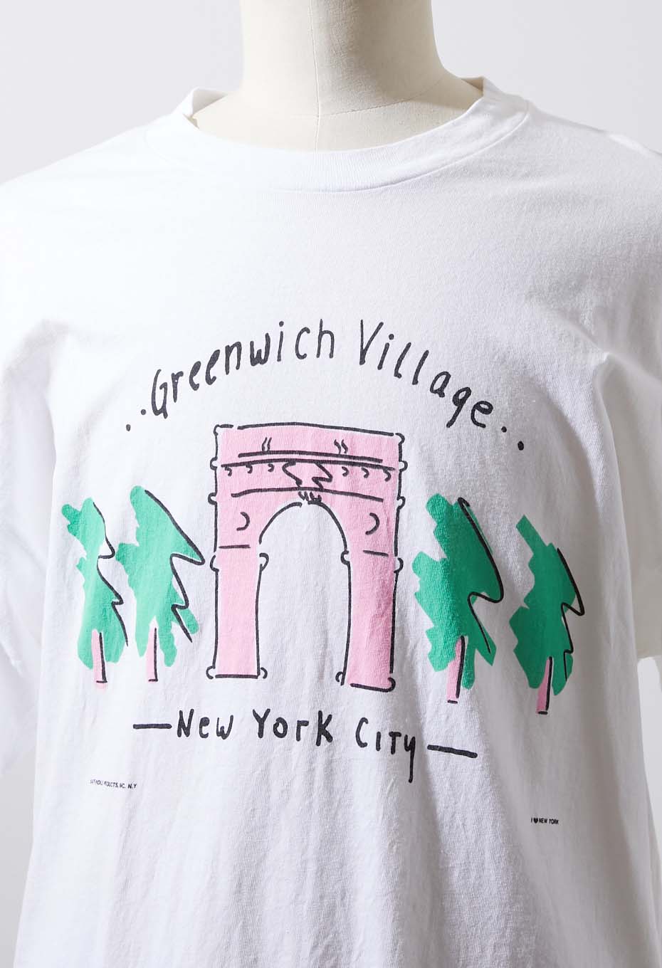 - ニューヨーク マンハッタンのダウンタウンにある地区、グリニッジヴィレッジのプリントTシャツです。ワシントン スクエア公園、ニューヨーク大学、ライブハウス ヴィレッジ ヴァンガードなど有名な施設があるエリアです。並木通りを模写デザインで、小さくI LOVE NEW YORKのプリントが施されたスーベニアアイテムです。ボディは1990年代 Hanes社のアメリカ製。