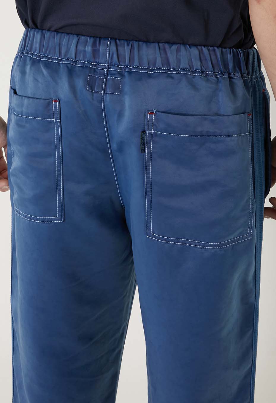 表地はナイロン、裏地はコットンの二重織生地を使用しています。インディゴ染めを施した後に洗いをかけ、とろみのある柔らかな質感に仕上げています。表地のインディゴナイロン地が持つ独特で上品な光沢と、裏側のコットン地の優しい肌当たりが特徴です。