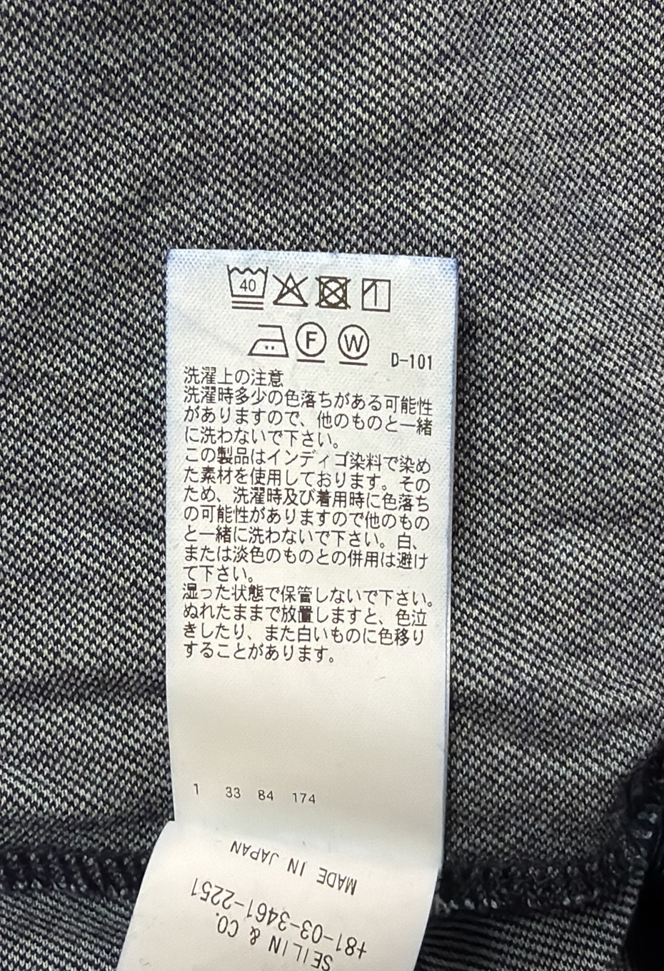 この製品は、インディゴ染料で染めた素材を使用しておりますので、繰り返し着たり、何度も洗濯することにより、濃いブルーから淡いブルーに移り変わっていきます。白又は淡色のものと組み合わせて着たり、重ね着をすると色が移りますので避けてください。洗濯の際は色が落ちますので単独洗いでお願いします。