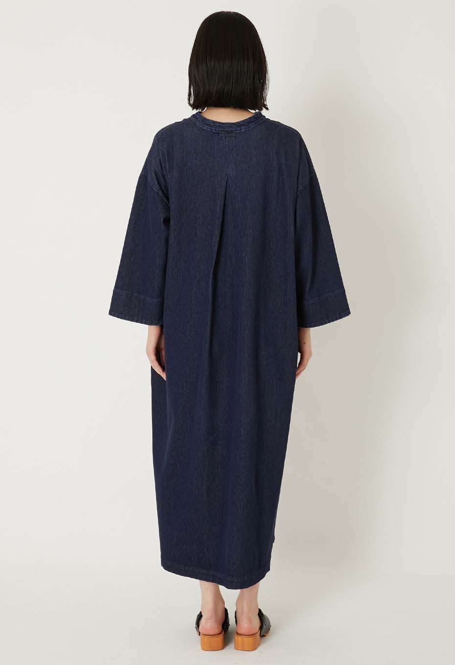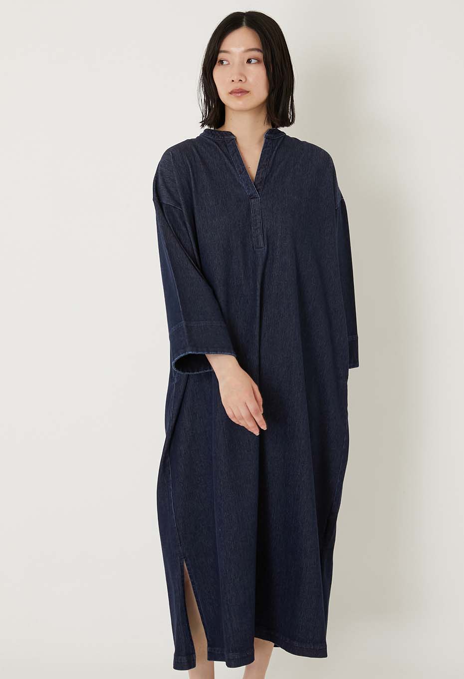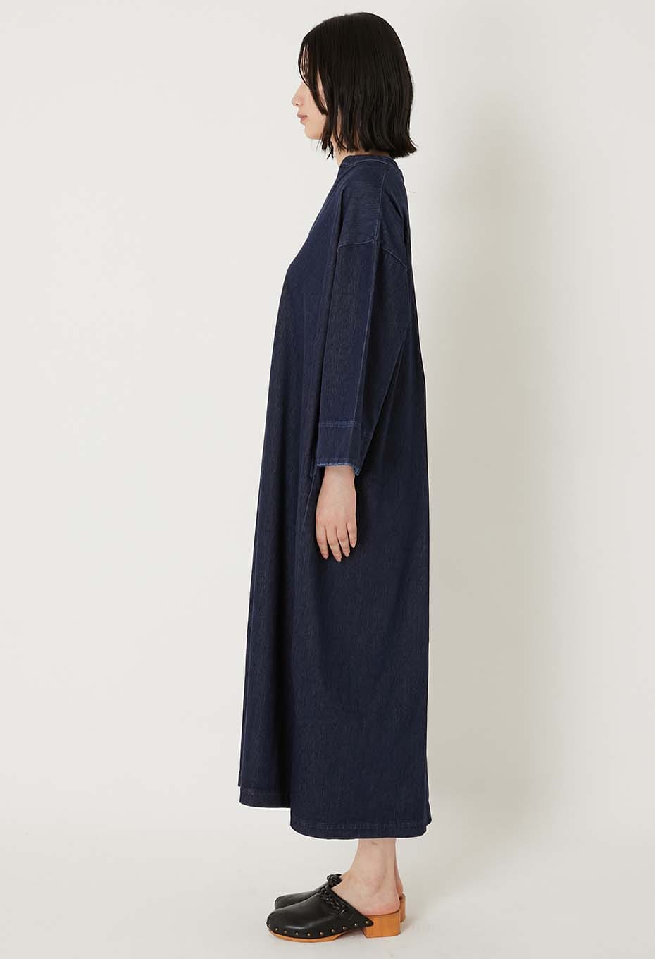 デニムライクなカットソー生地で仕立てたベーシックなワンピースです。