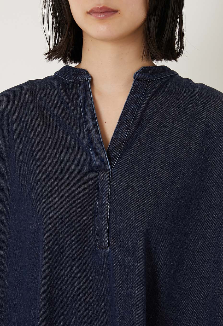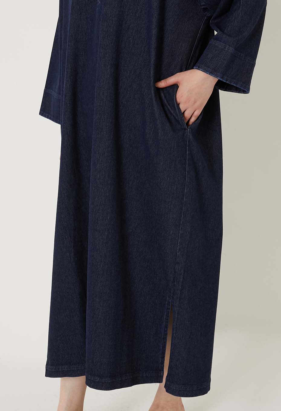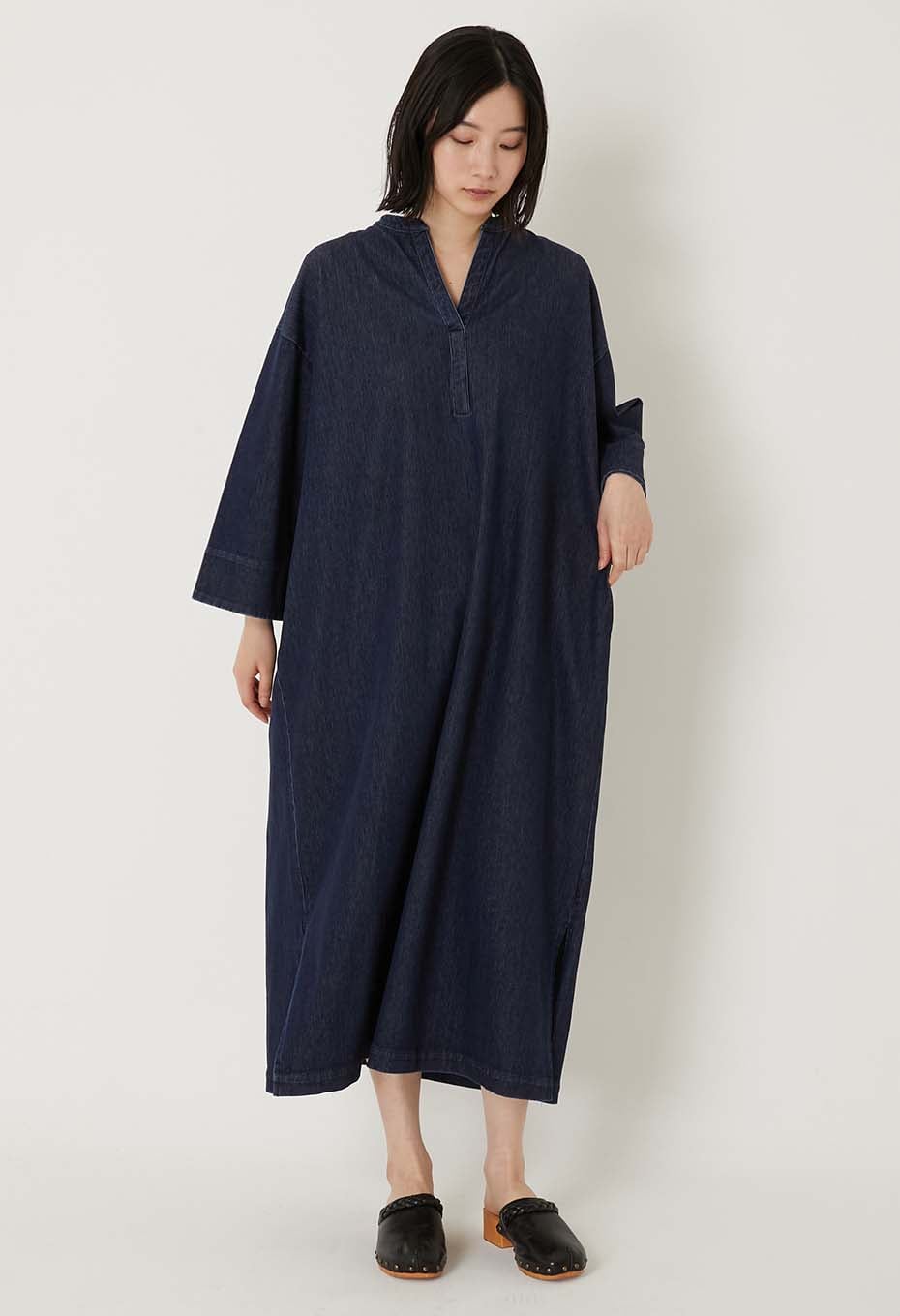 デニムライクなカットソー生地で仕立てたベーシックなワンピースです。