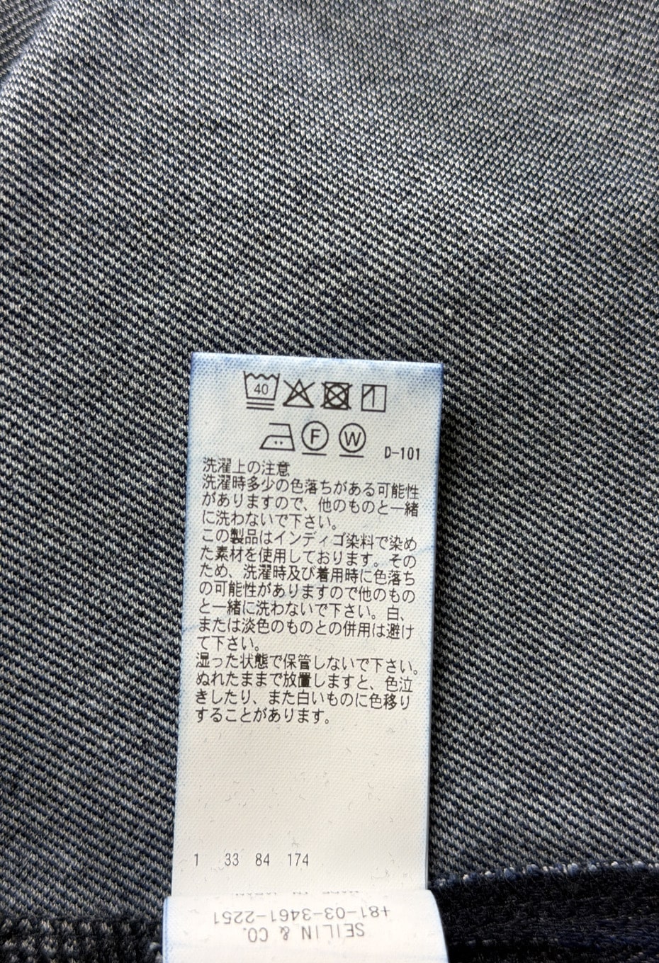 この製品は、インディゴ染料で染めた素材を使用しておりますので、繰り返し着たり、何度も洗濯することにより、濃いブルーから淡いブルーに移り変わっていきます。白又は淡色のものと組み合わせて着たり、重ね着をすると色が移りますので避けてください。洗濯の際は色が落ちますので単独洗いでお願いします。