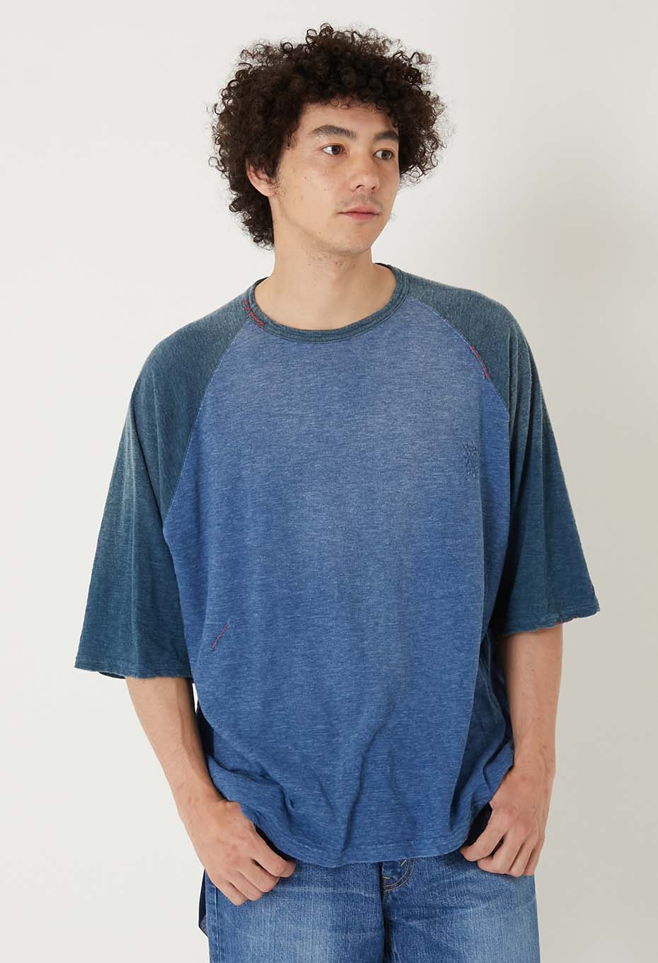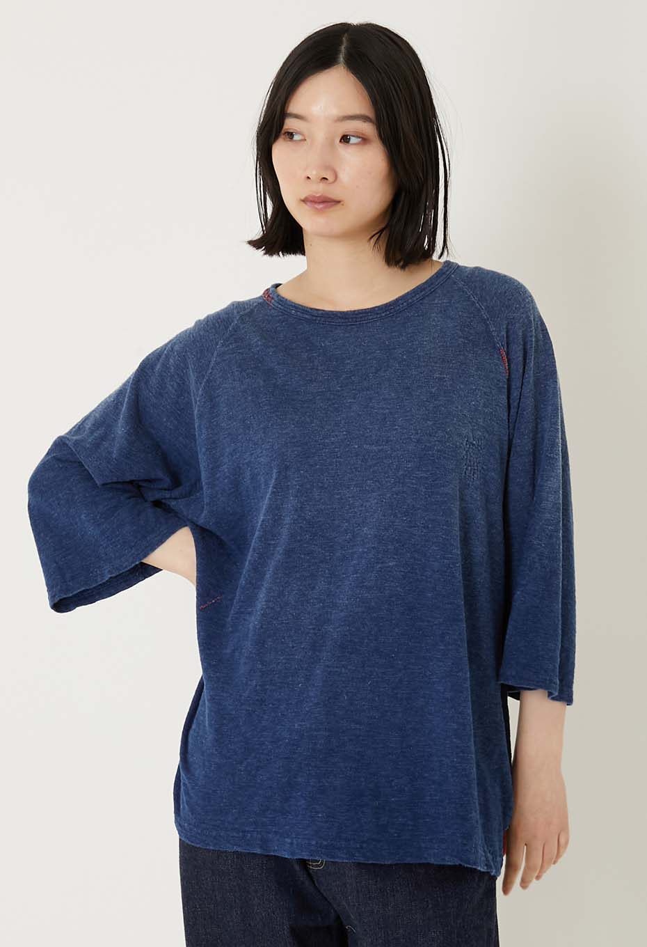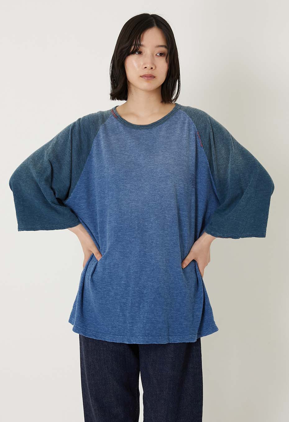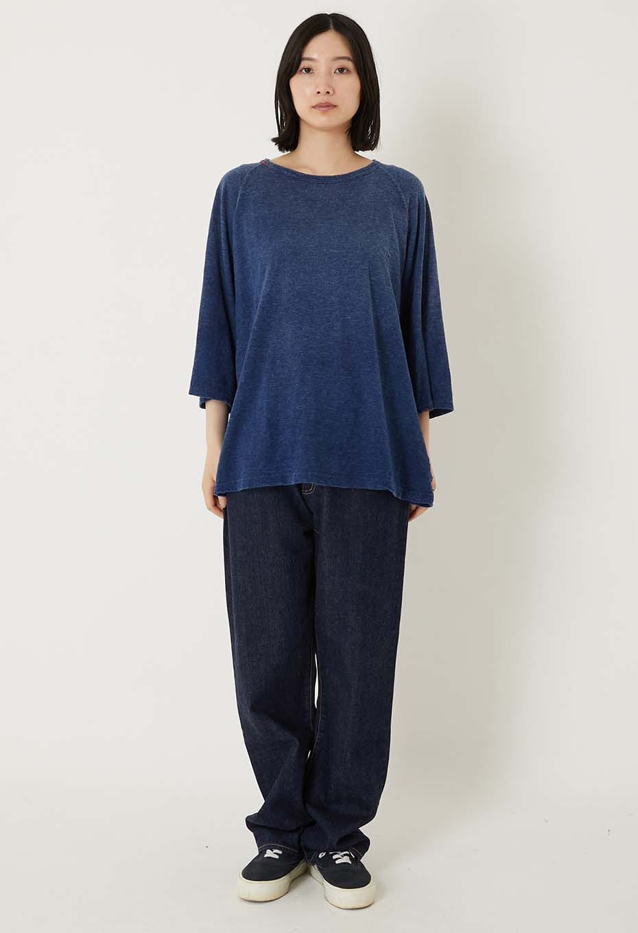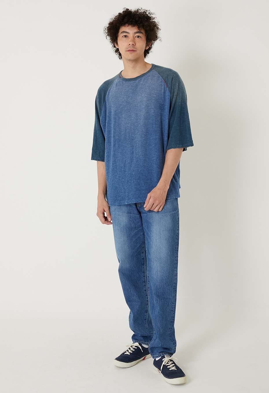 風合いの良いスラブ天竺生地をインディゴで手染めし、ハンドステッチでリペアを施しています。洗い加工により、日焼けしたようなフェード感を演出。インディゴの魅力的な表情を引き出した一着です。