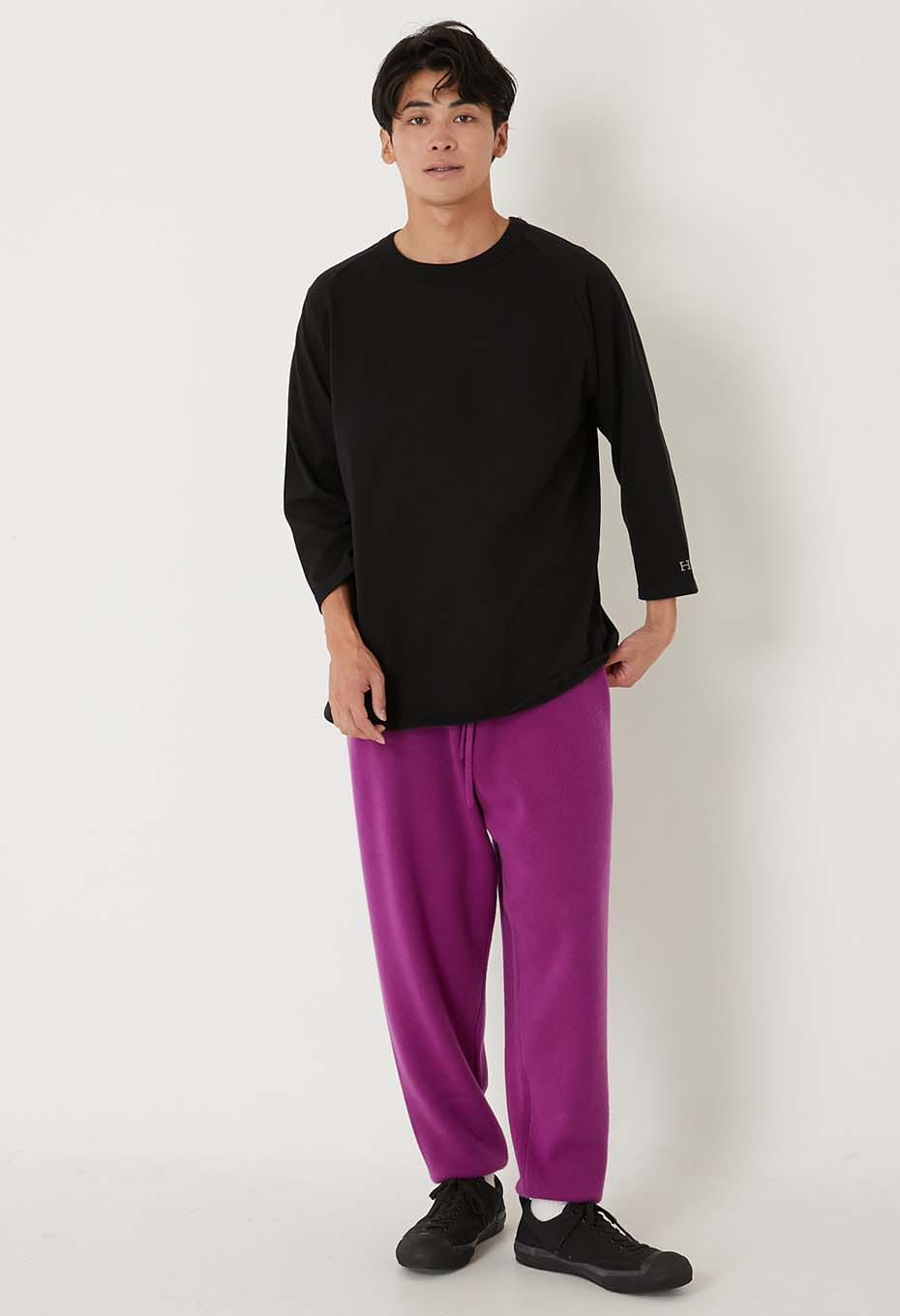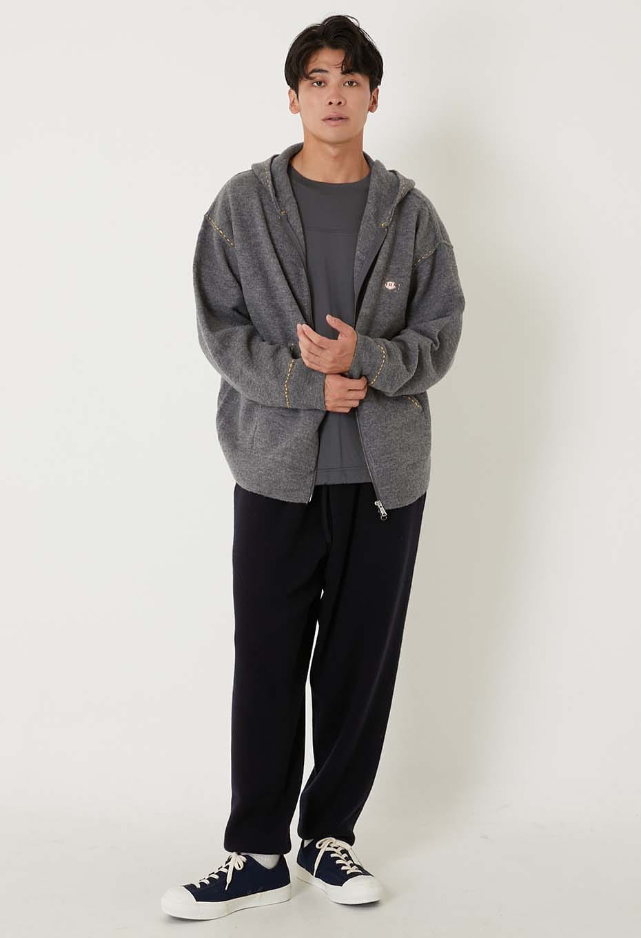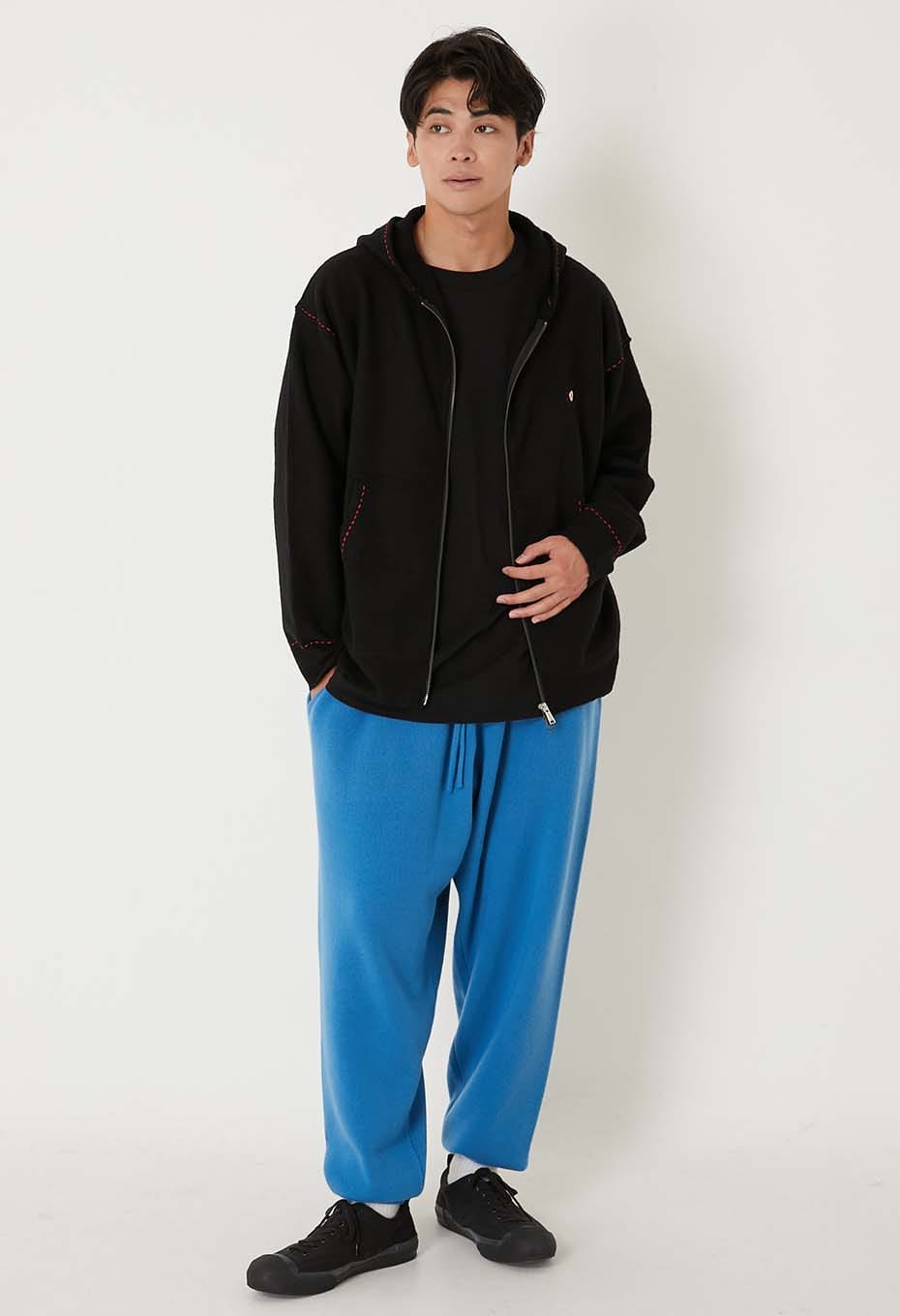 ヴィンテージスウェットパンツをデザインベースに、袖と裾のリブを少し長めに設定し、風を遮断するためにリブテンションを強めに調整しています。