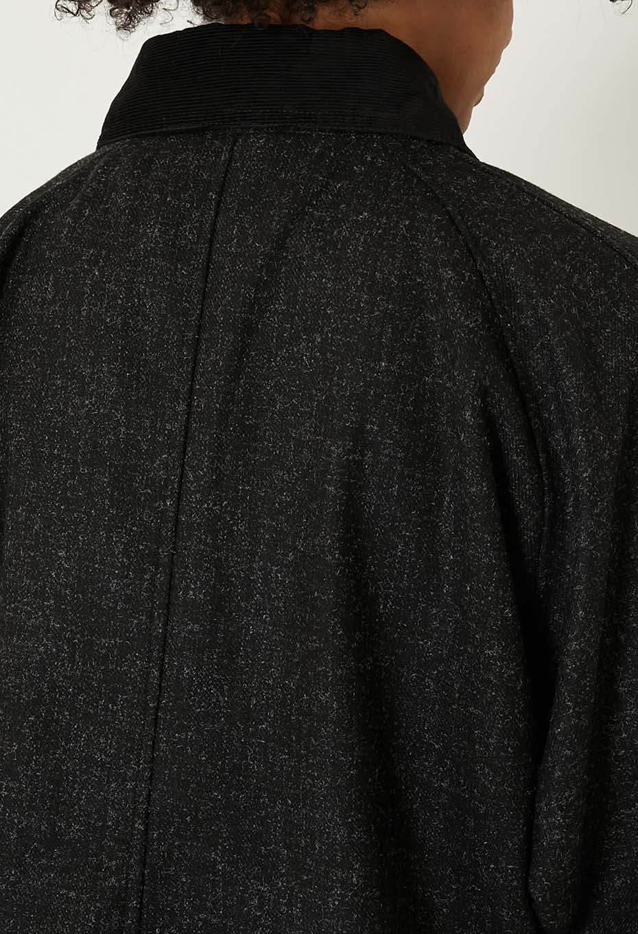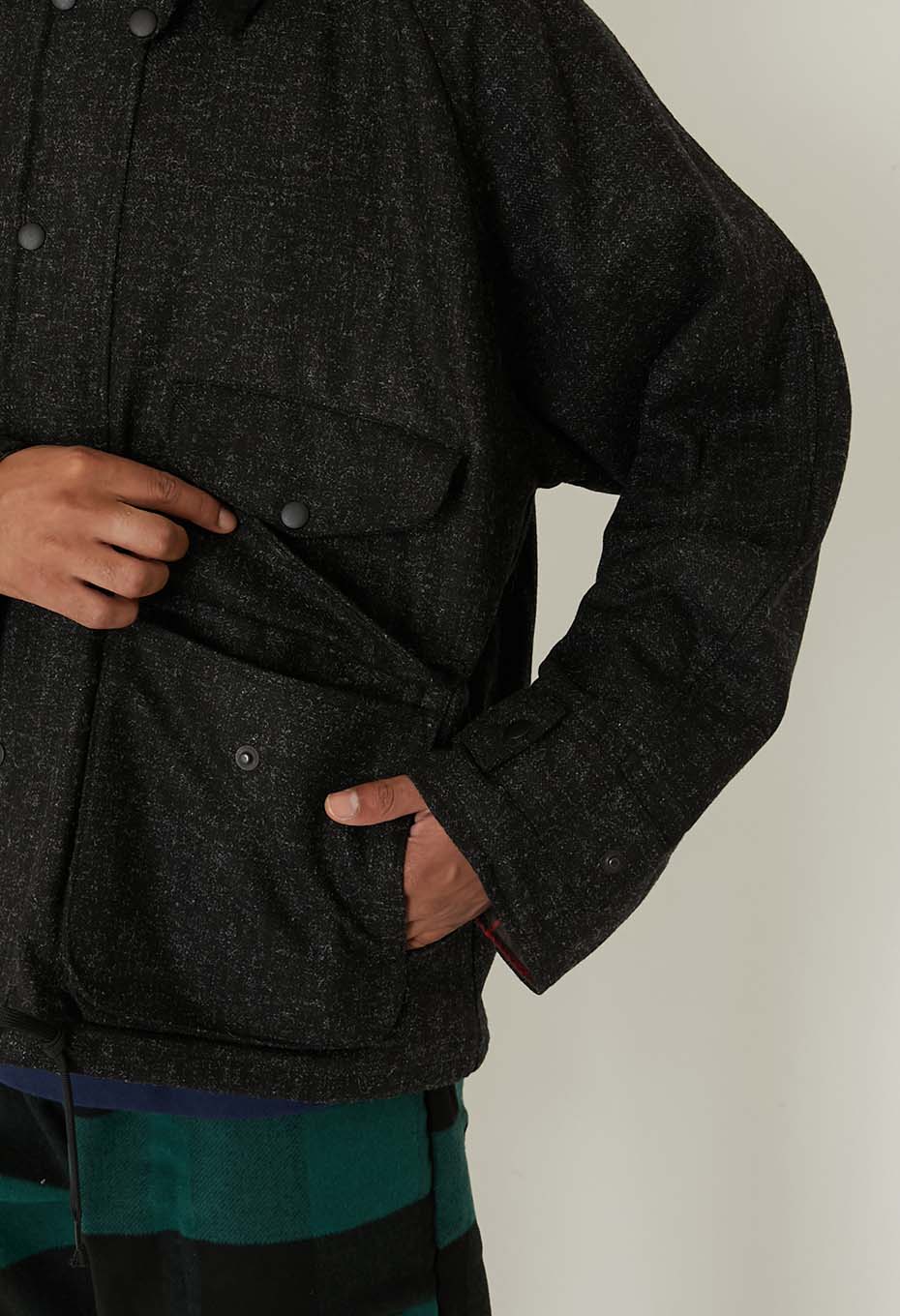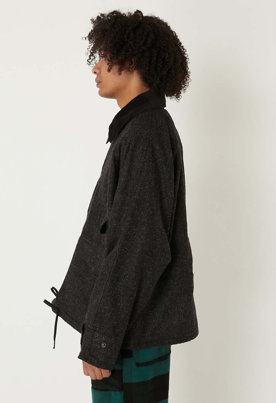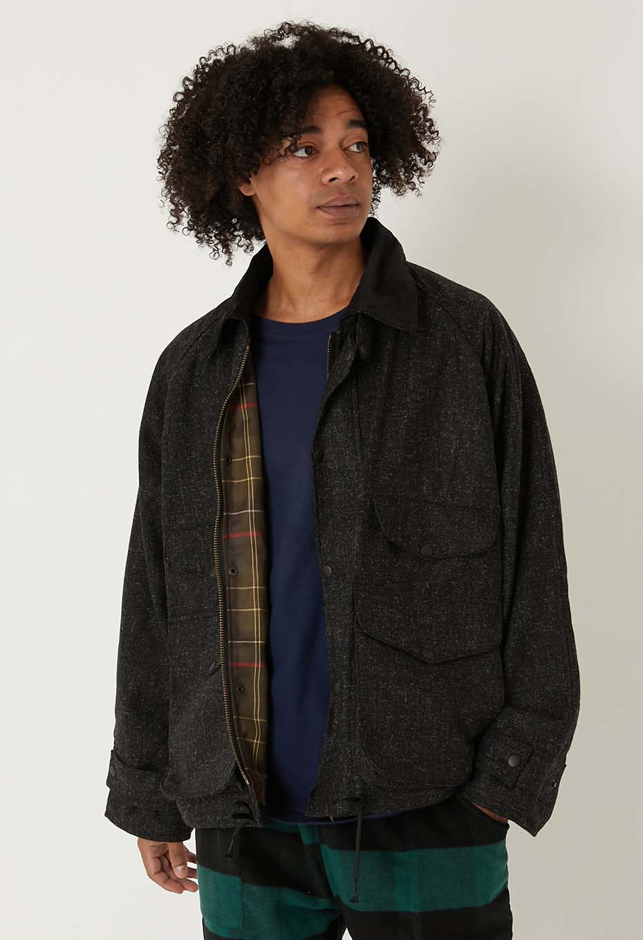 - クラシックな佇まいが魅力のフィールドジャケットです。ポリエステルとウールを混合した杢感のあるツイード素材を使用し、襟は秋冬のスタイリングにぴったりなコーデュロイ素材をあしらいました。身幅と袖はゆったりとしたシルエットで、着丈は短めに設計されています。裾のドローコードでシルエットや着丈の調整ができ、背面のドローコードで身幅の調整も可能です。シャーリングによってシルエットの変化を楽しめます。裏地のタータンチェック柄がマニッシュな印象を演出します。